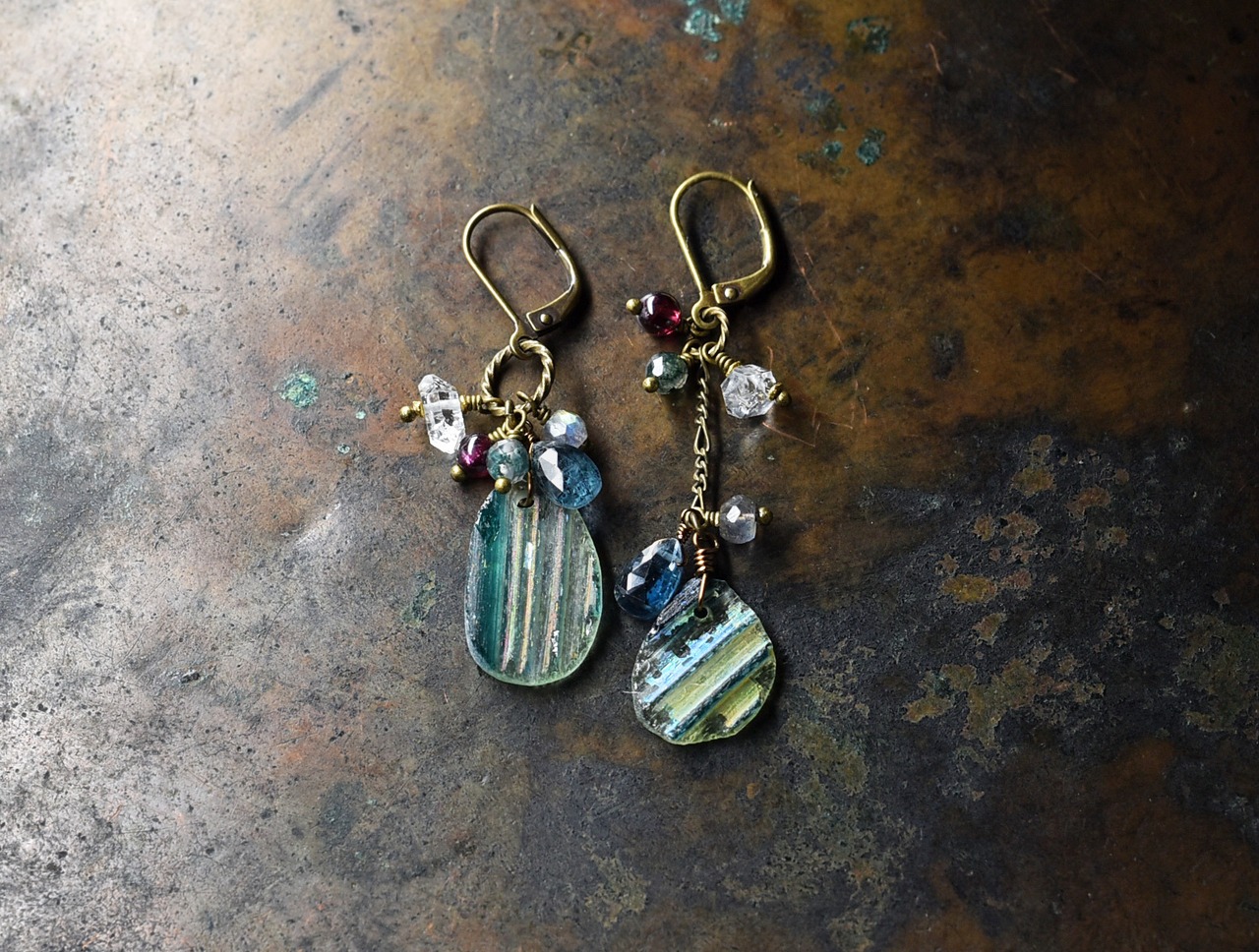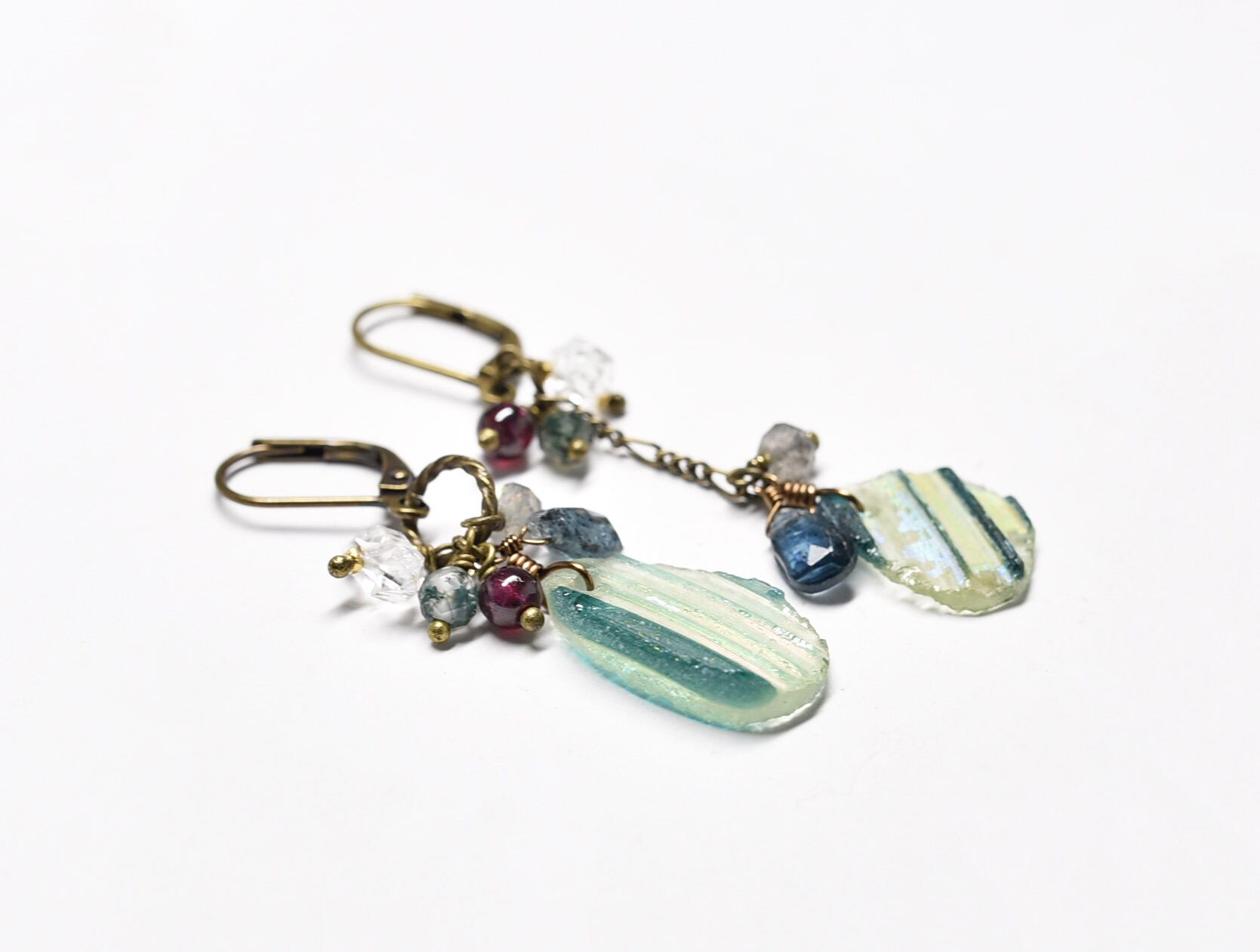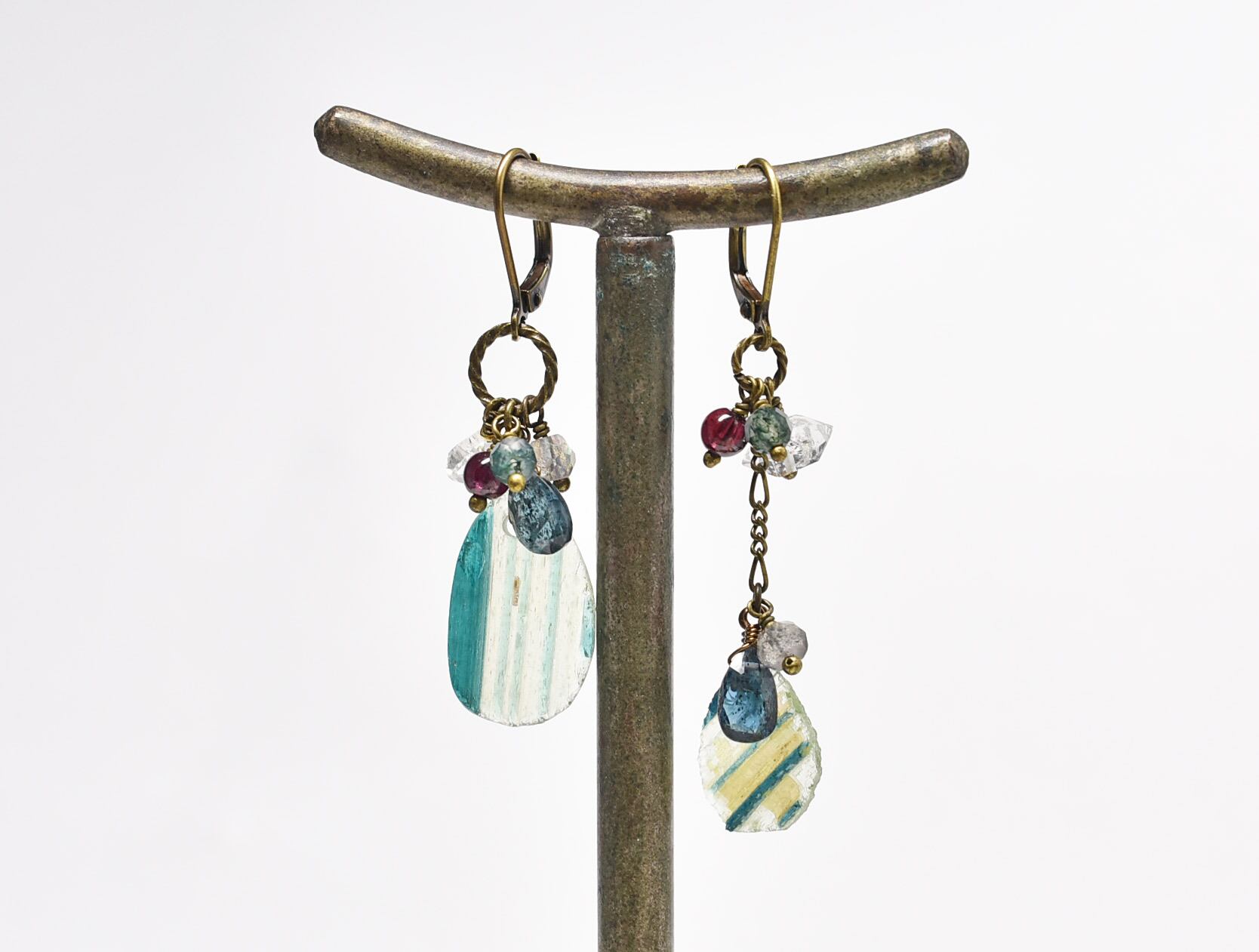 銀化したローマングラスとカイヤナイト、ラブラドライト、ガーネット、ハーキマーダイヤモンド、モスアゲートを繋いだアンシメトリーなピアスです。