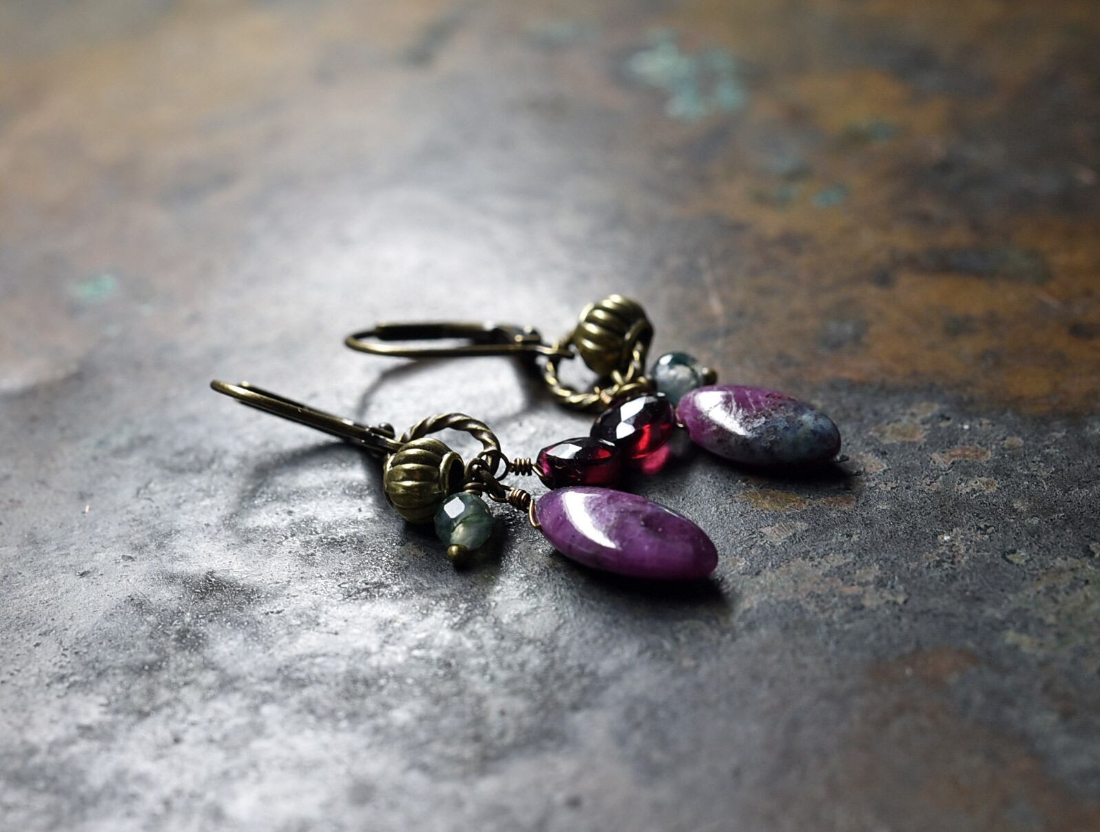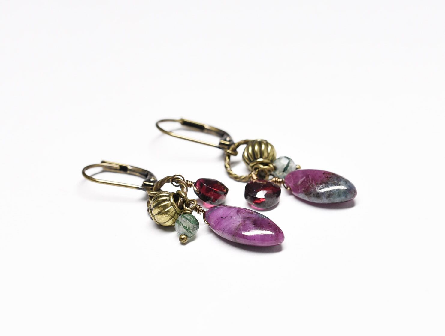 ルビーインゾイサイト、ガーネット、モスアゲートをリングで繋いだピアスです。