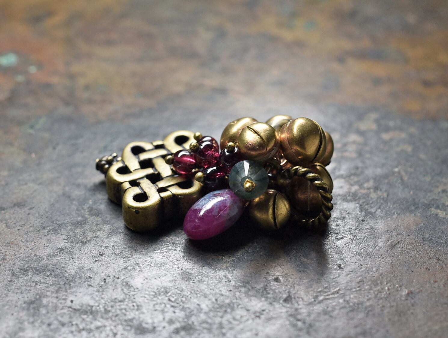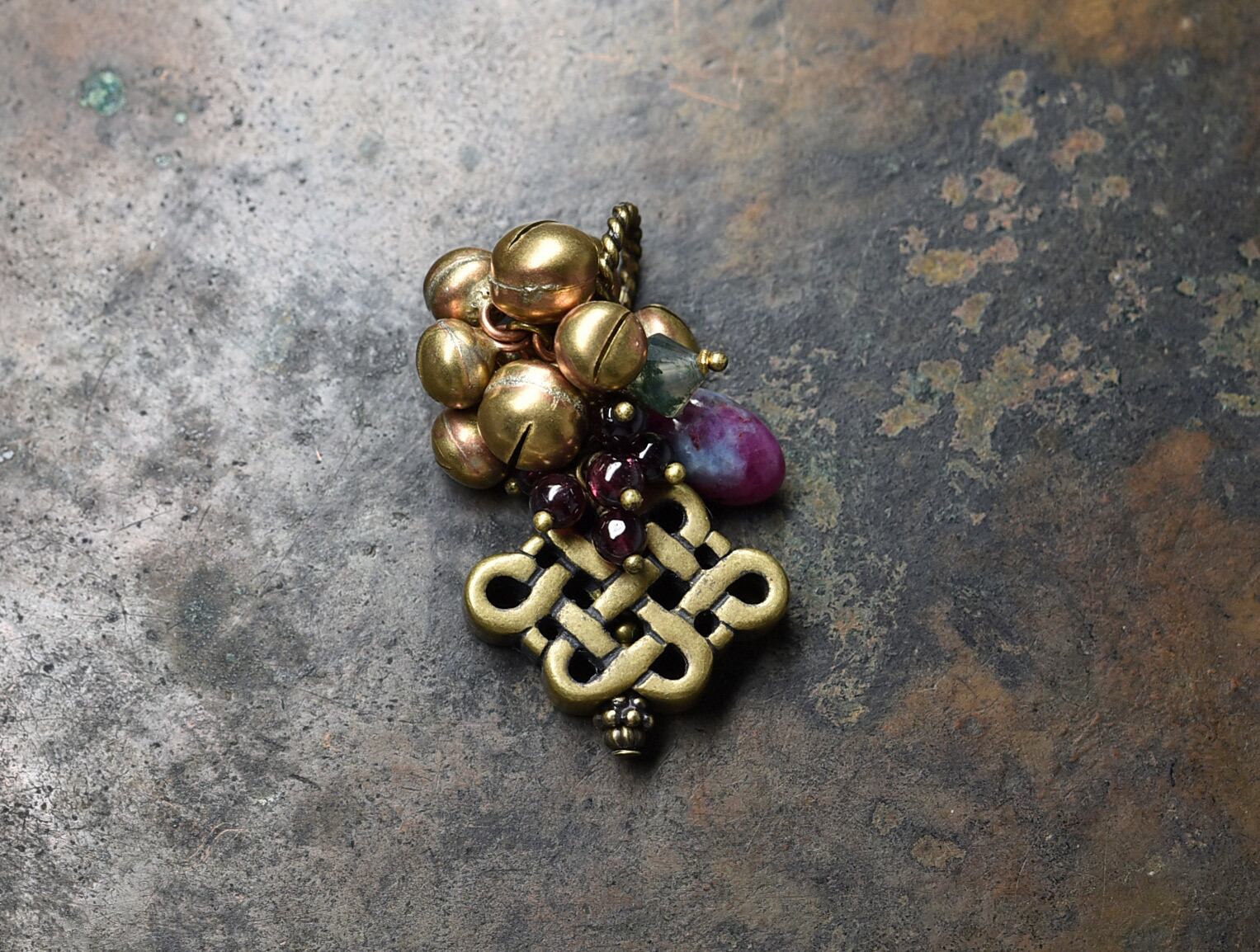 エンドレスノットとたわわな鈴とガーネット、ルビーインゾイサイトのペンダントトップ(真鍮)
