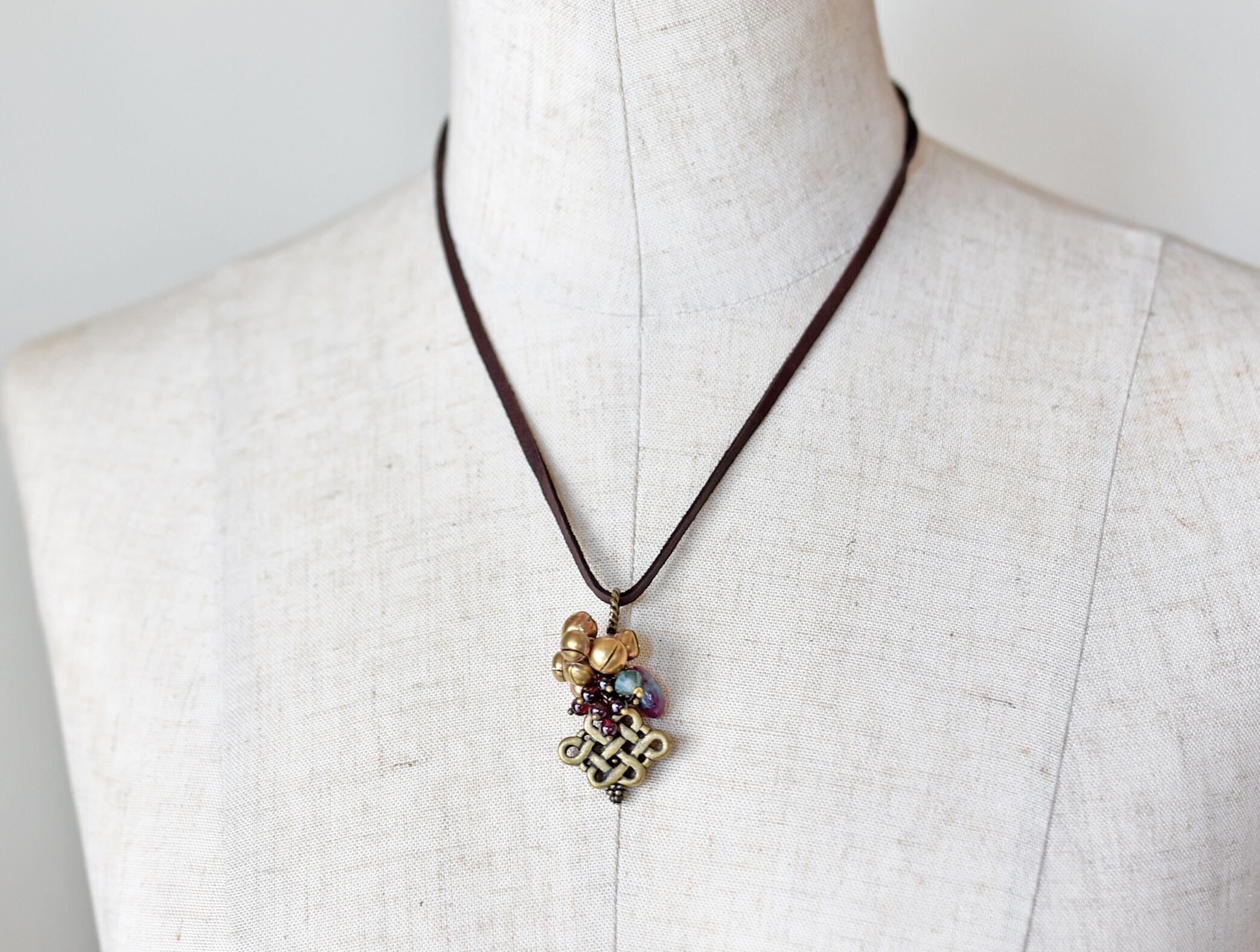 エンドレスノットとたわわな鈴とガーネット、ルビーインゾイサイトを繋いだペンダントトップです。