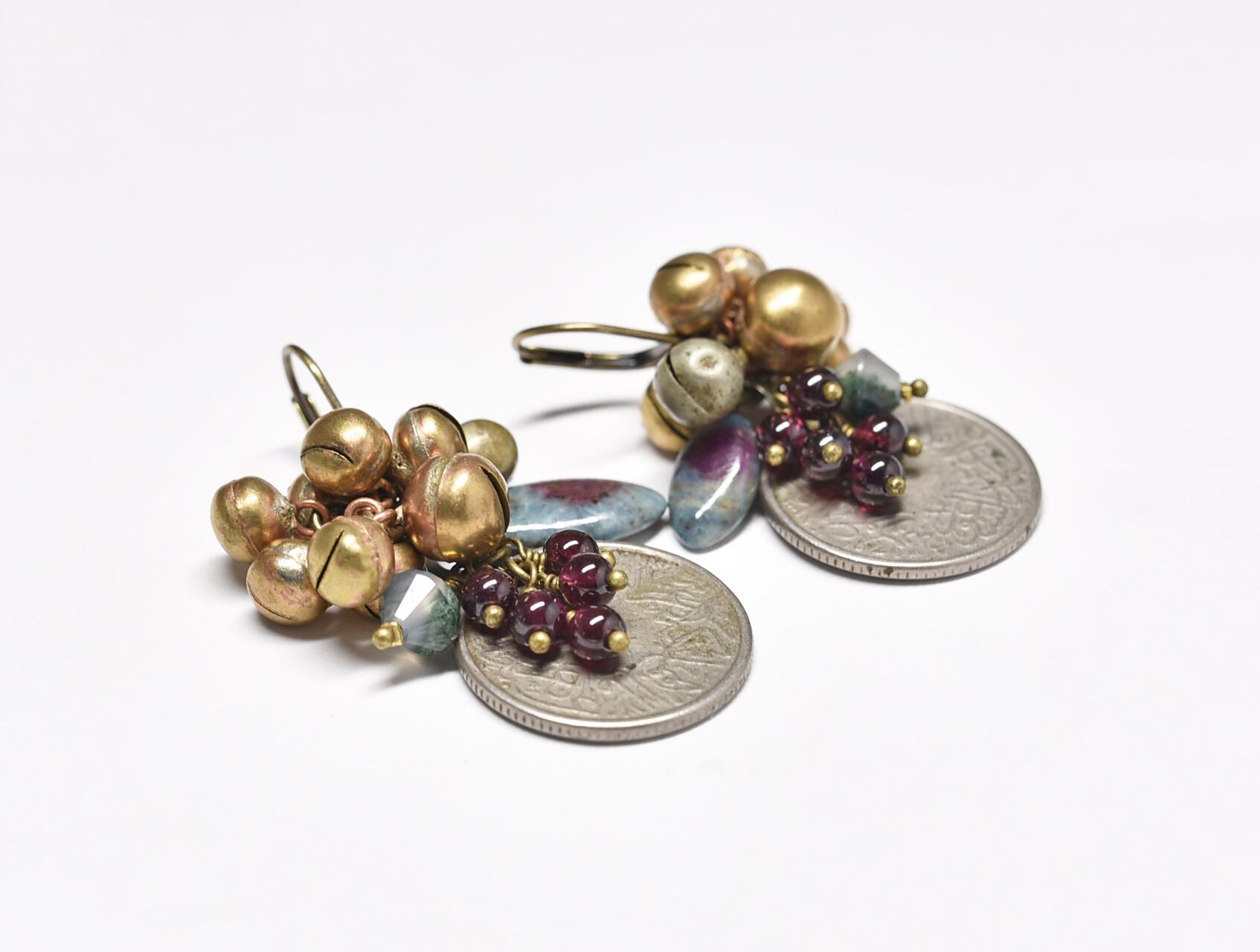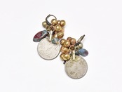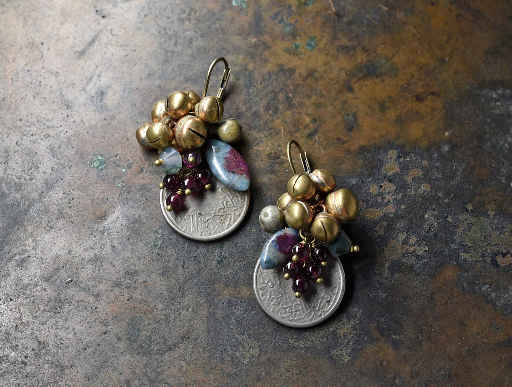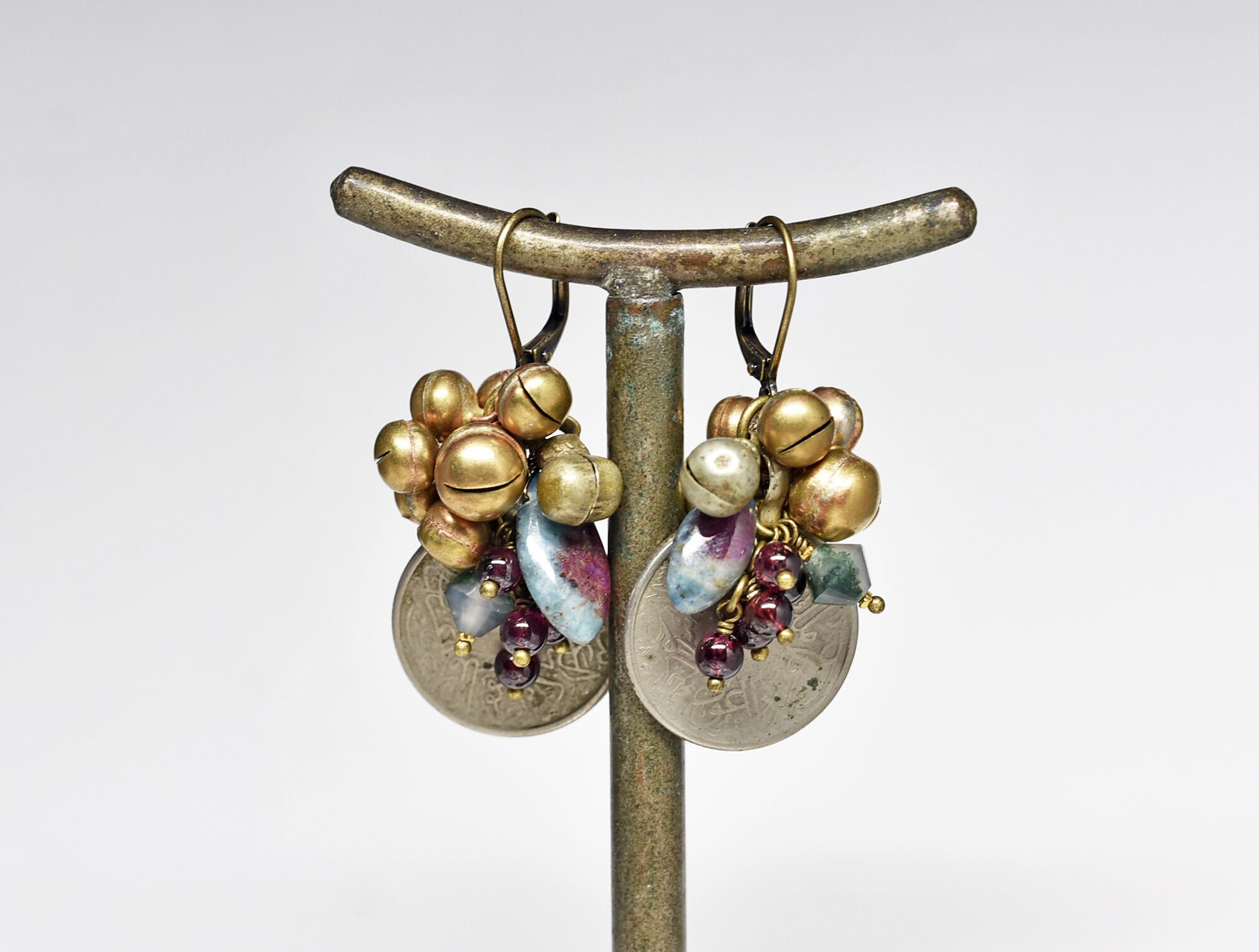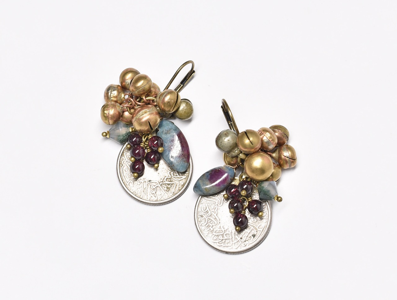 イエメンアンティークコインとたわな鈴、ルビーインゾイサイト、ガーネット、モスアゲートなどを繋いだピアスです。