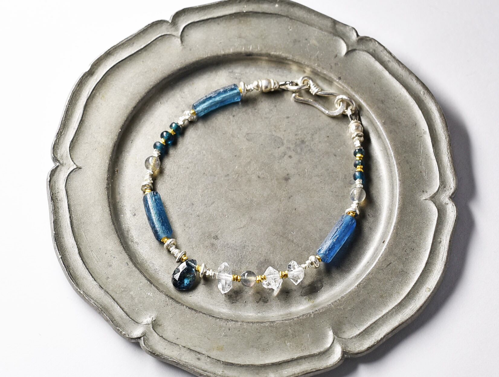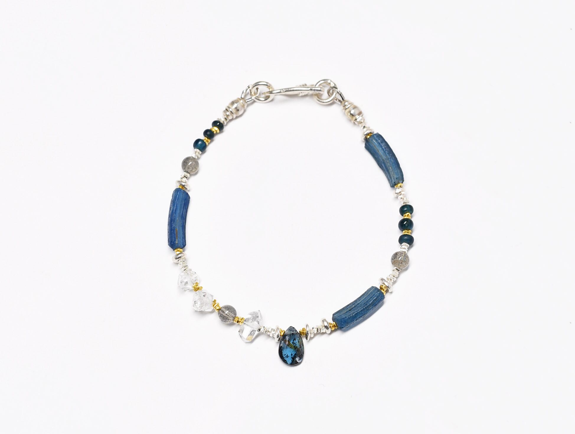 インディゴブルーカイヤナイト、ハーキマーダイヤモンド、ラブラドライト、ローマングラス、アンティークビーズ煌めくカレンシルバーなどを繋いだブレスです。