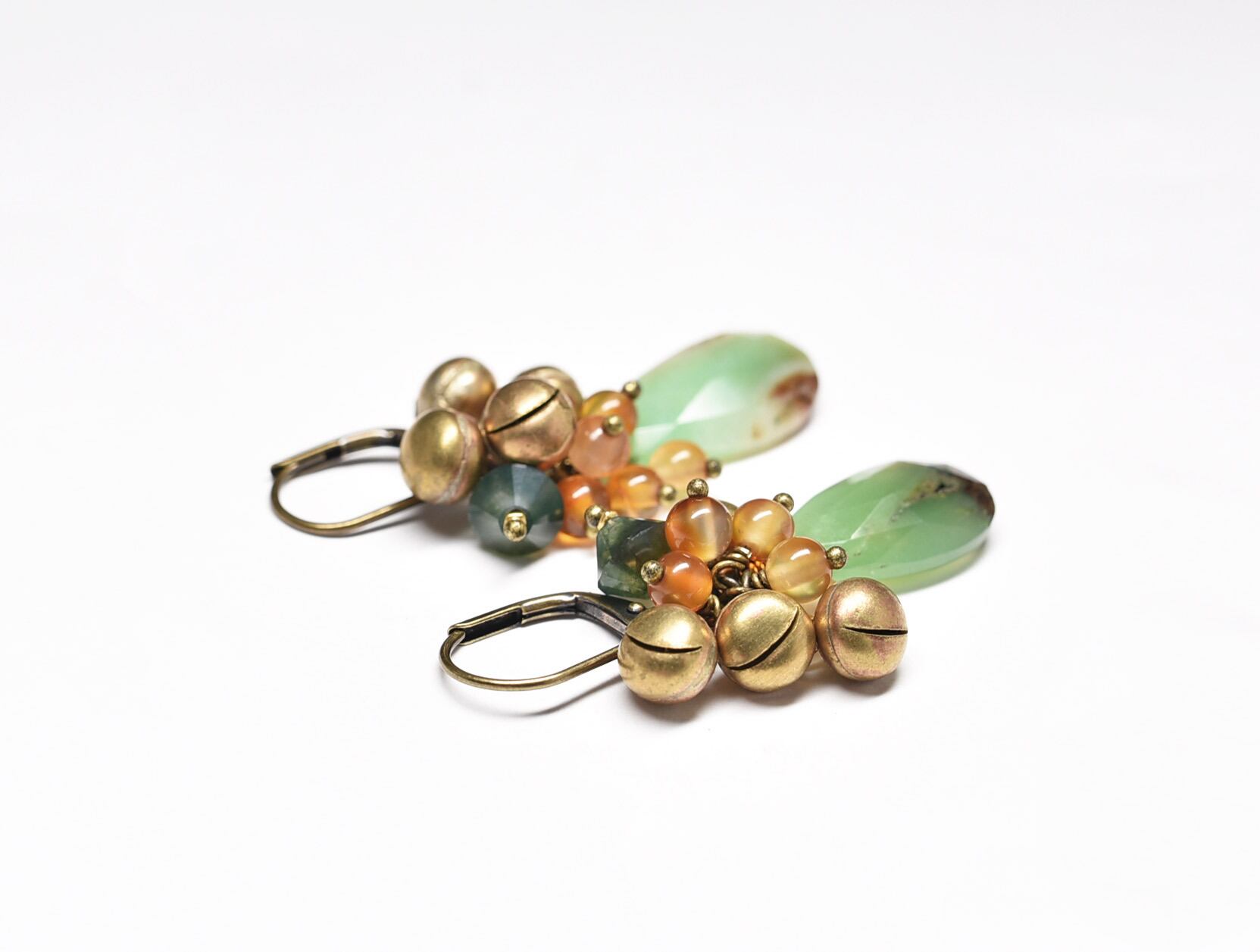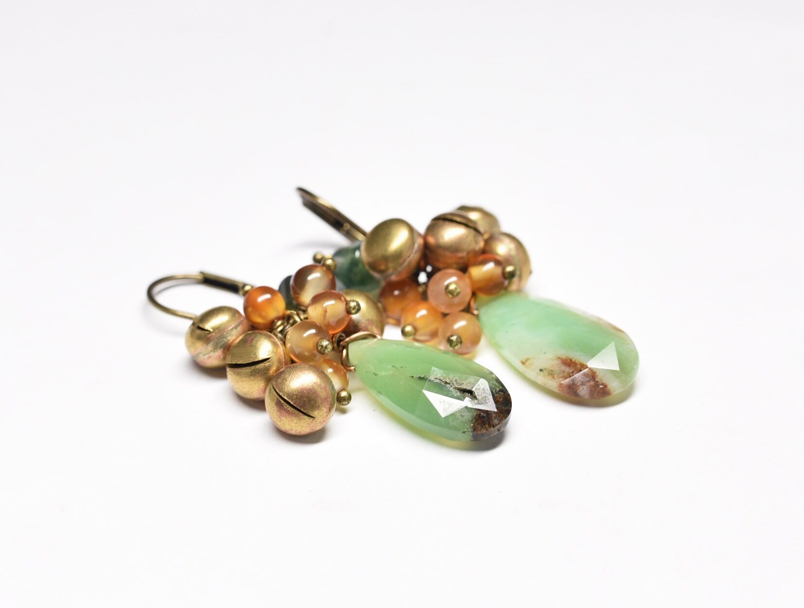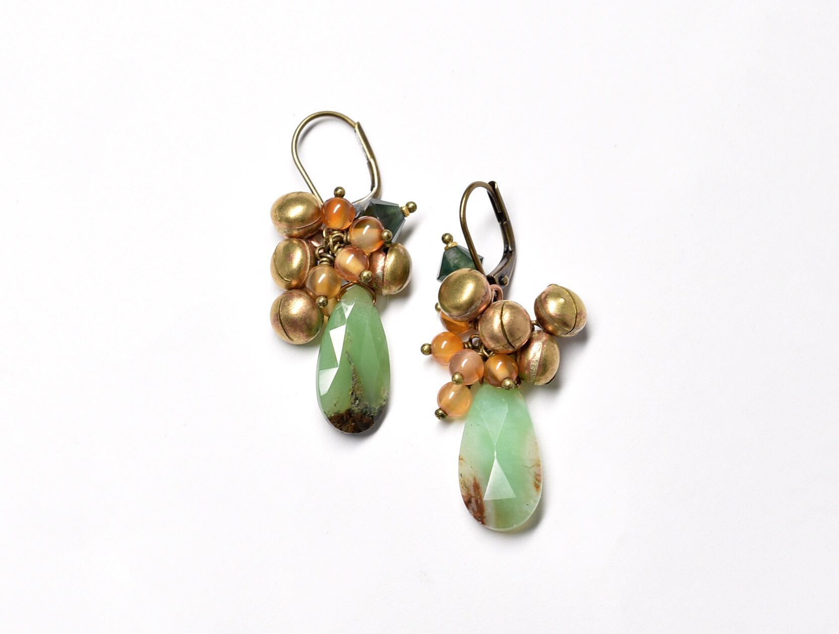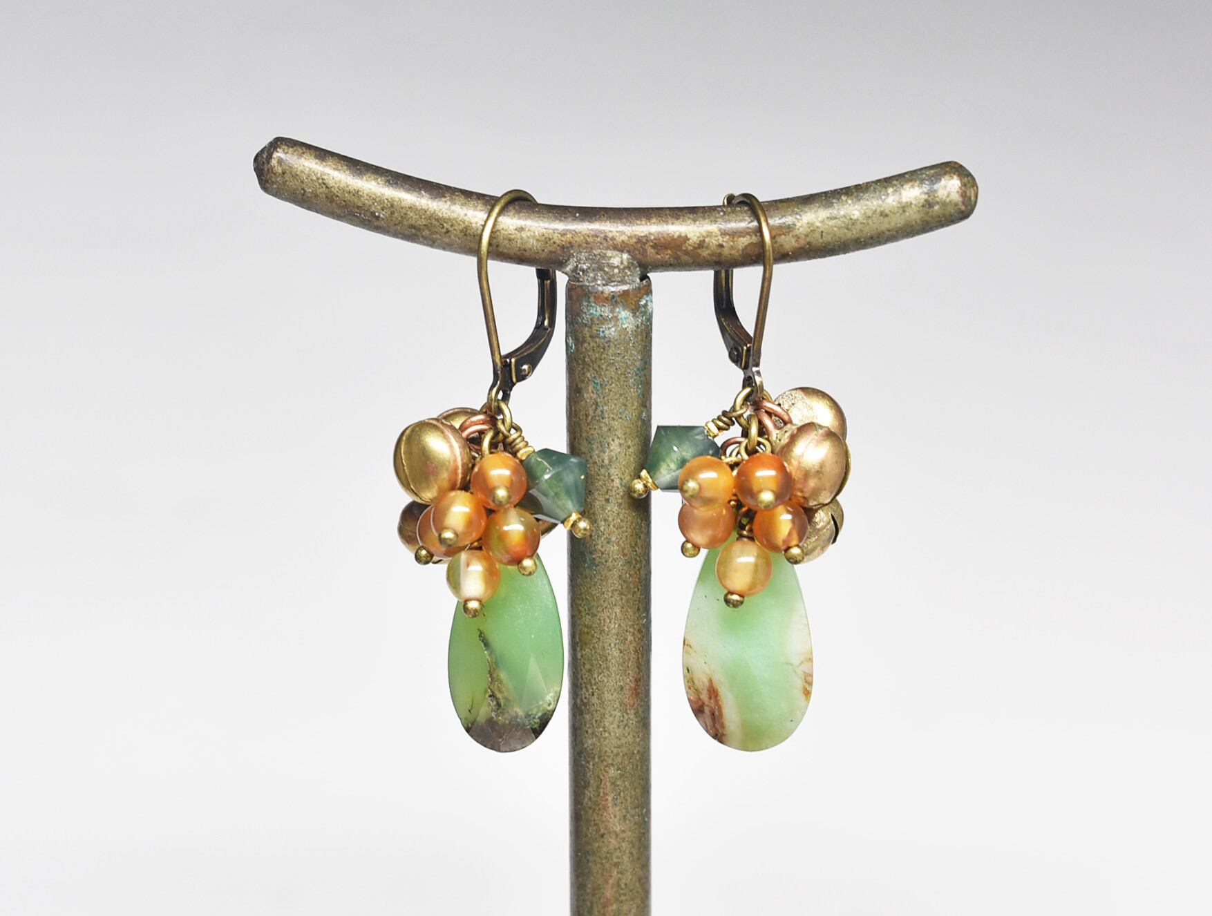 オーストラリアジェイドとたわわな鈴とカーネリアン、モスアゲートのピアス