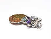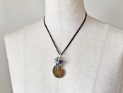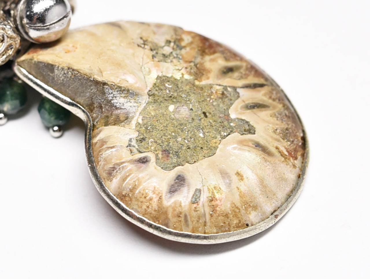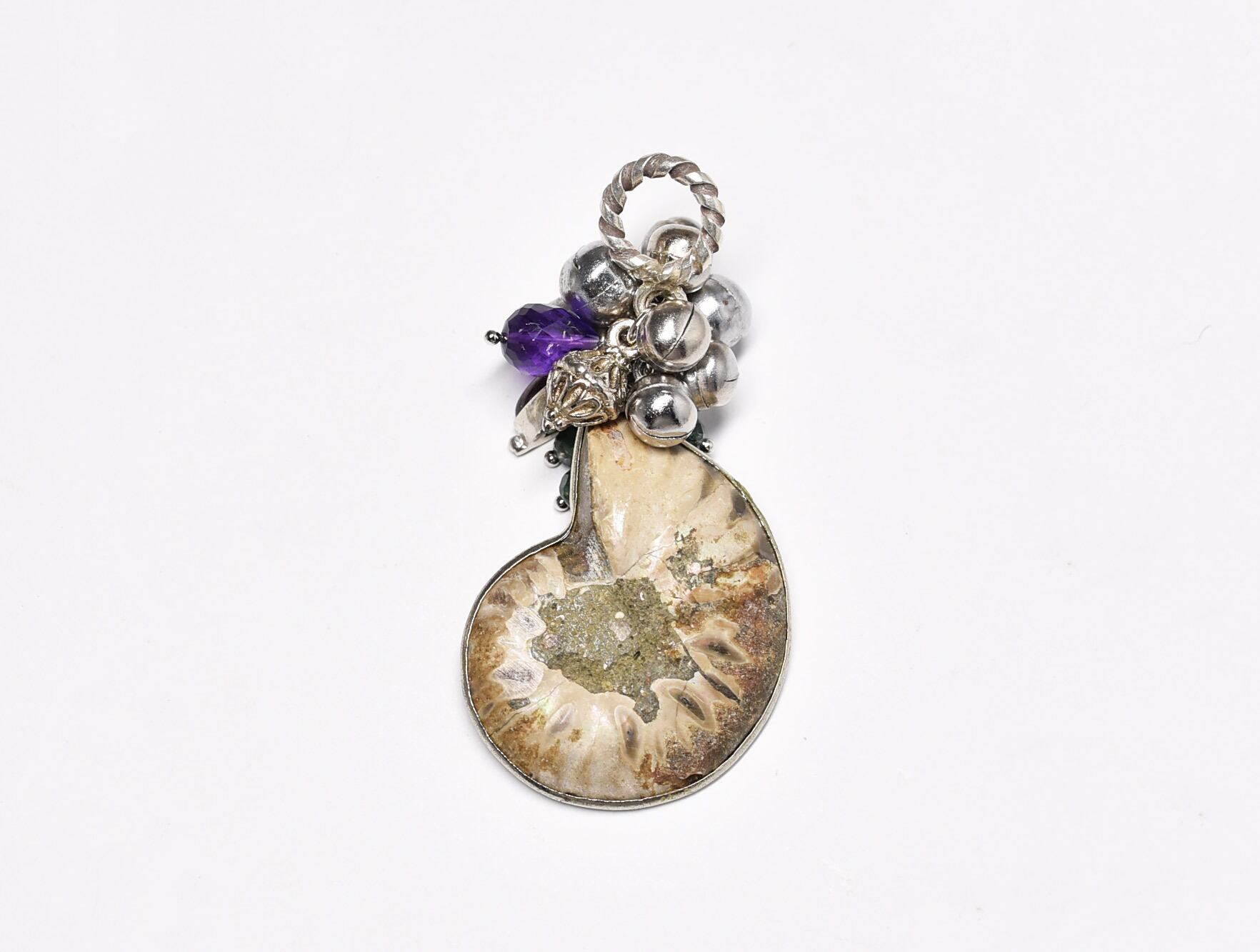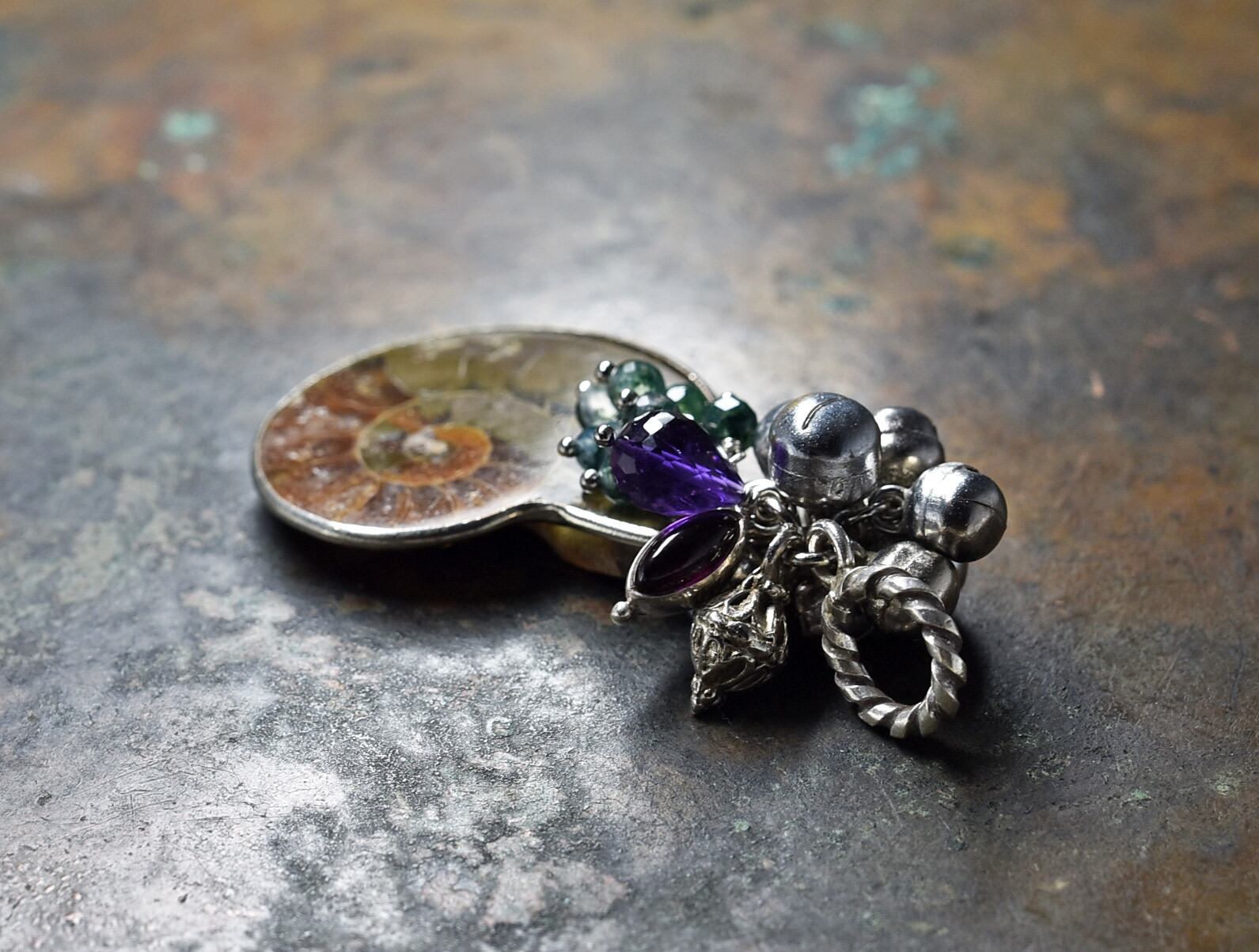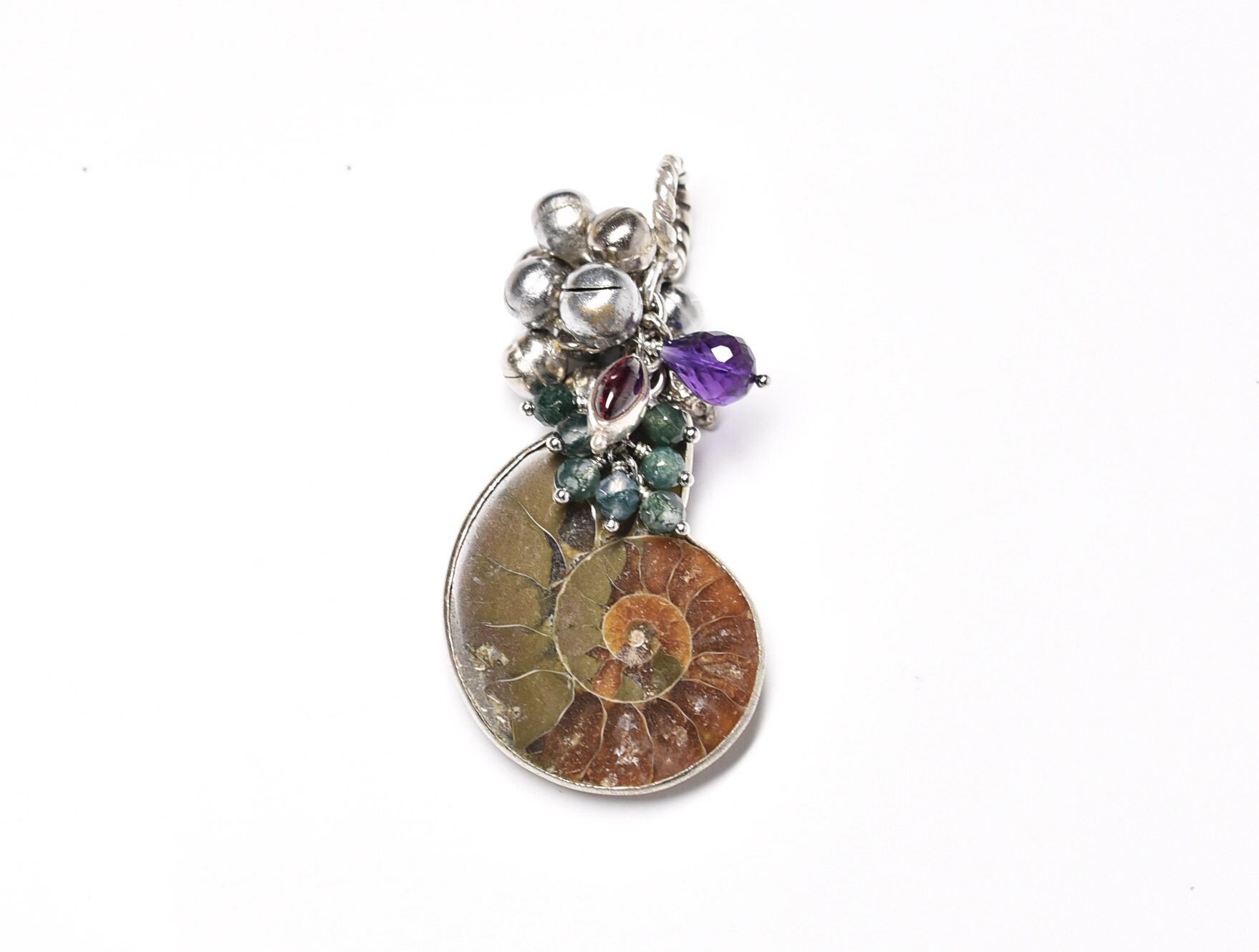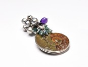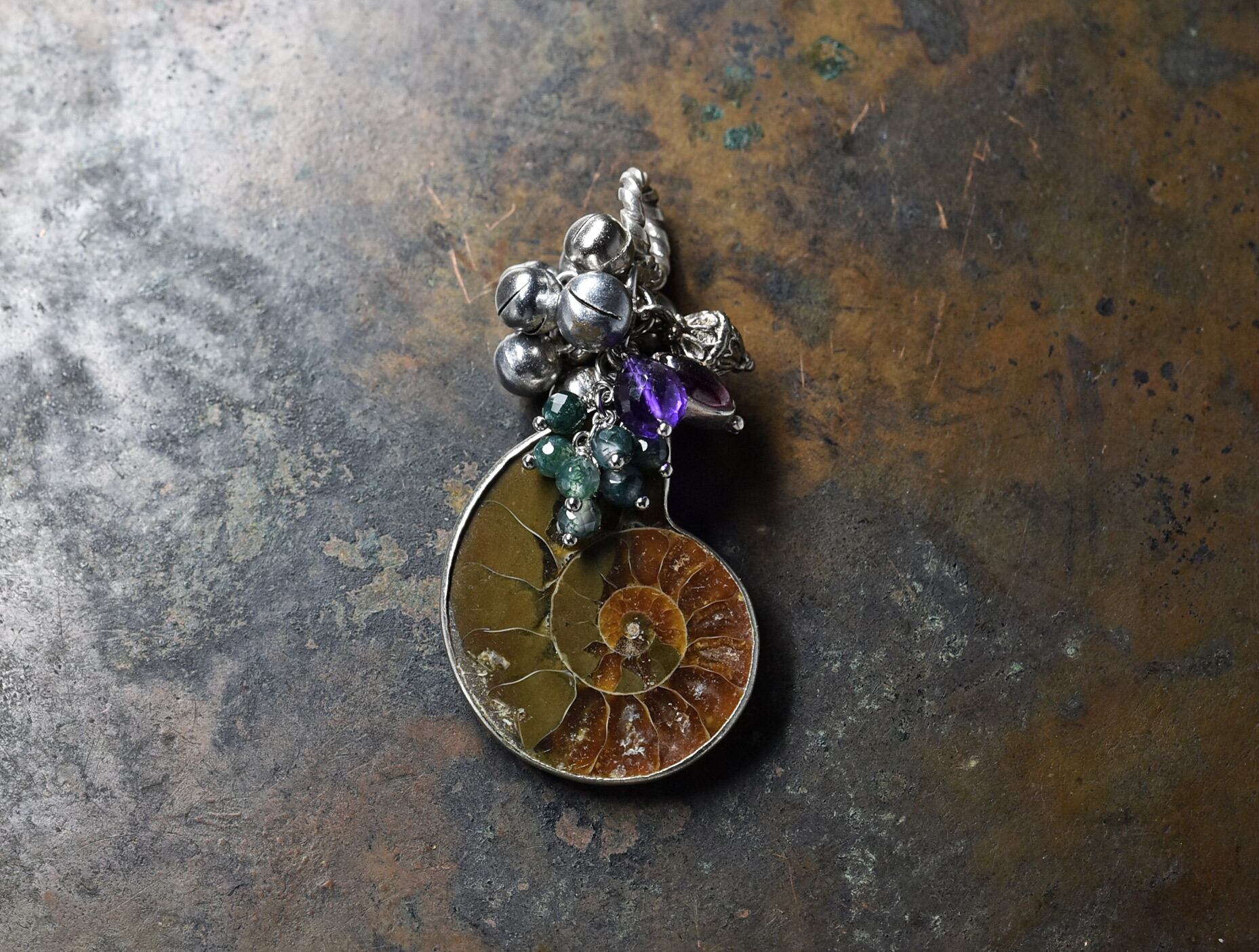 シルバー枠アンモナイトとガーネット、とたわわな鈴とモスアゲート、アメジスト、ピューターチャームを繋いだペンダントトップです。