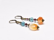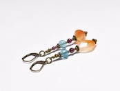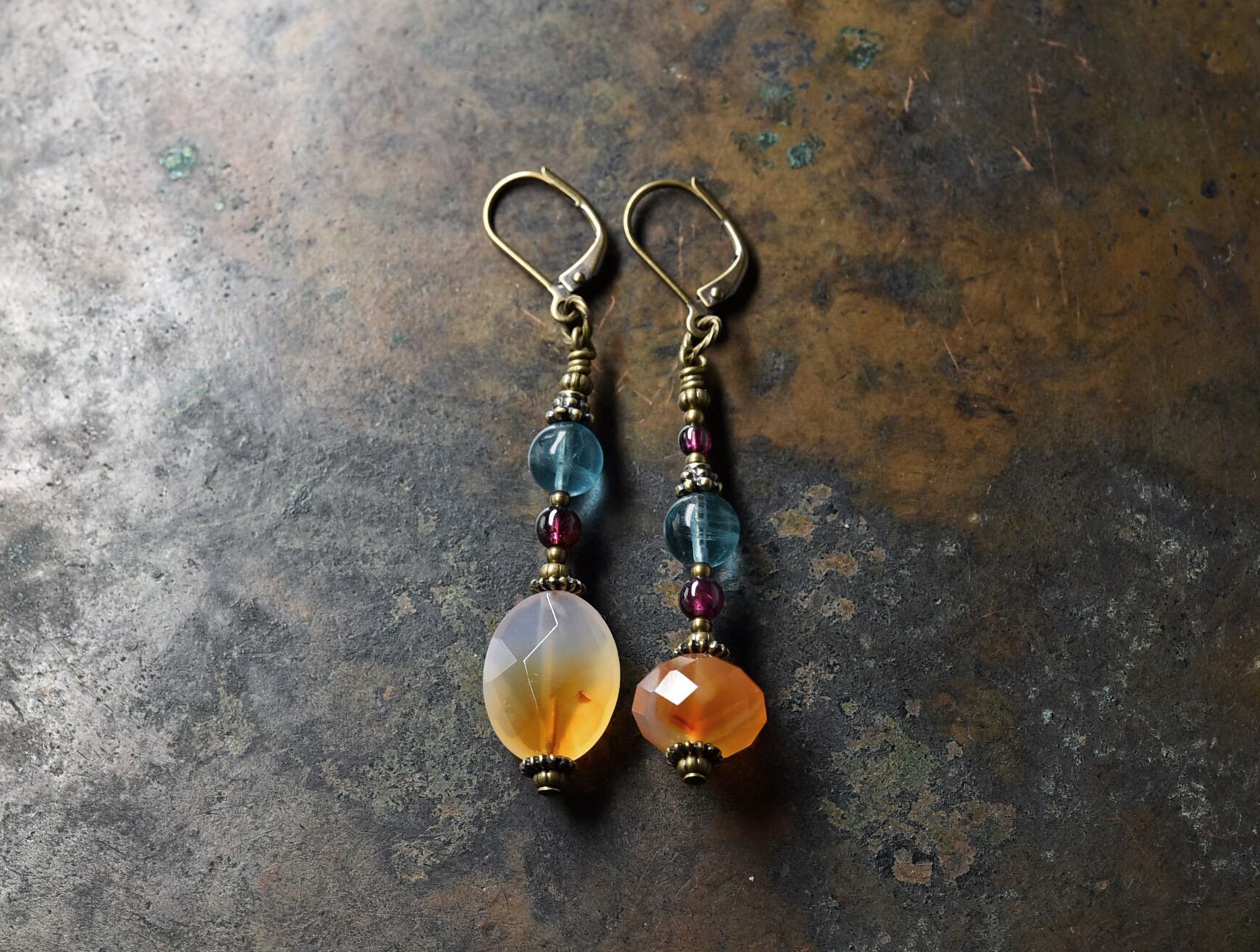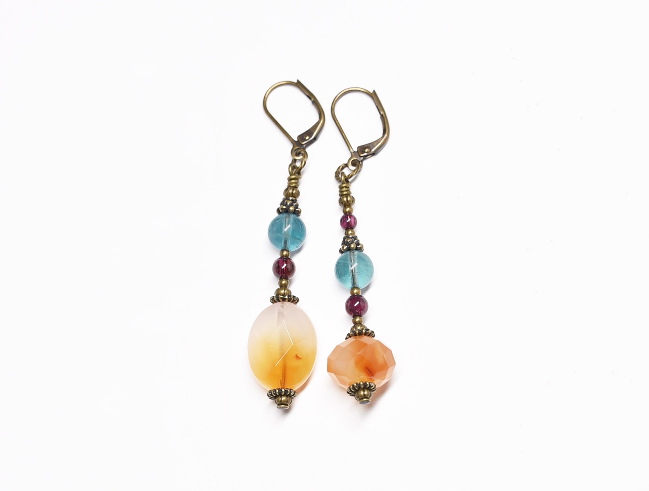 グラデーションオレンジカーネリアンとガーネット、ブルーグリーンフローライトのアンシメトリーピアス