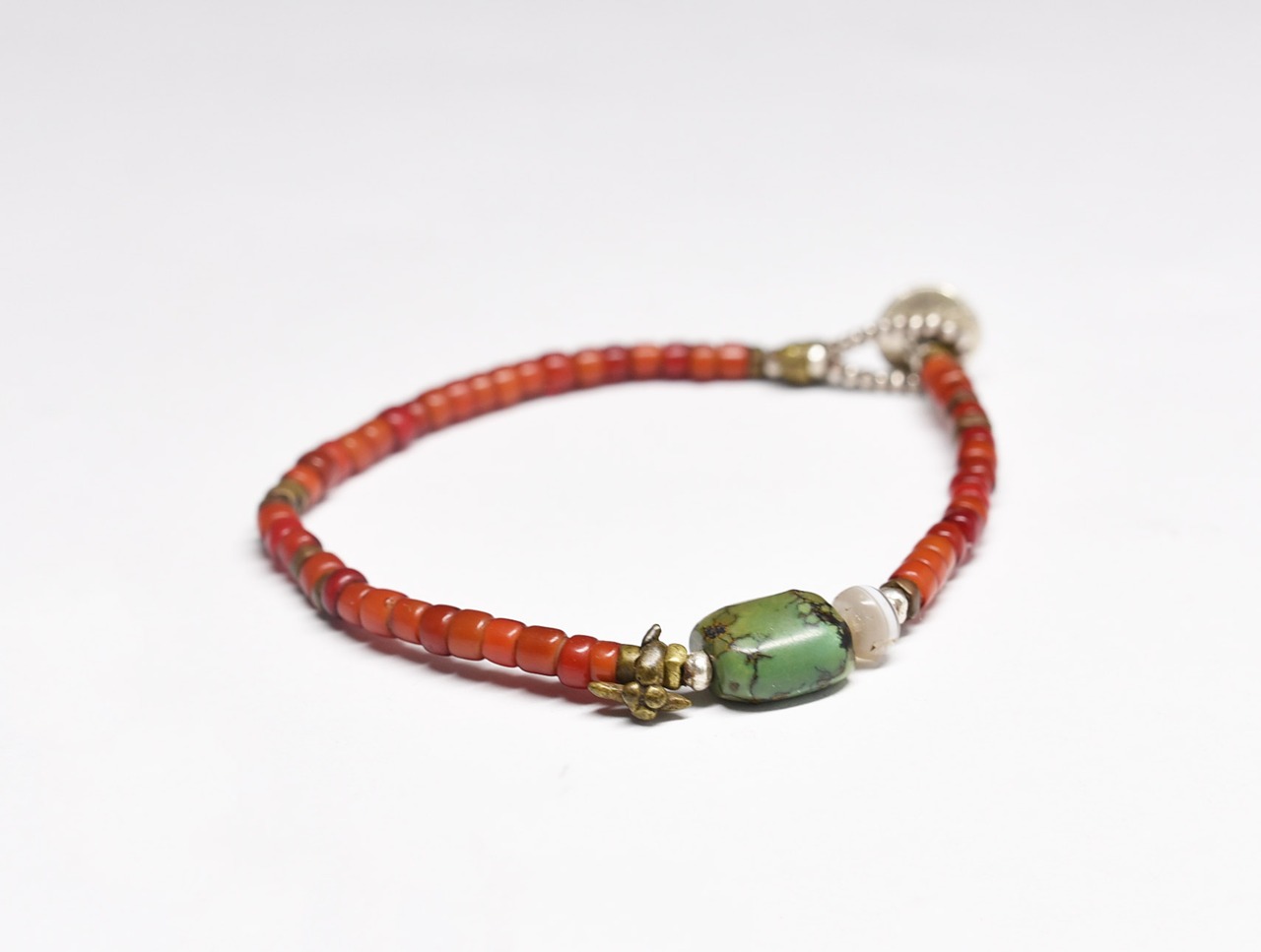 oldチベタンターコイズ、古代瑪瑙、oldオリッサブラス、をホワイトハーツで繋いだブレスです。