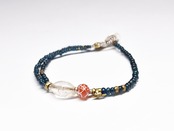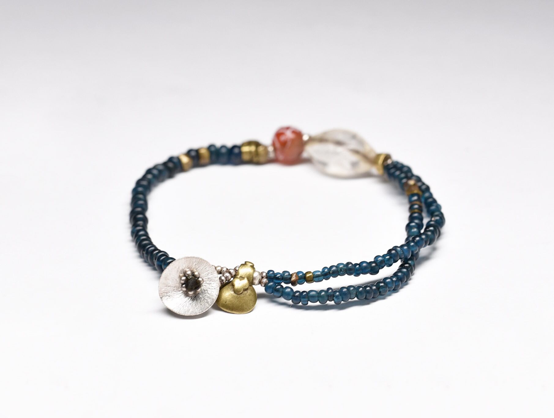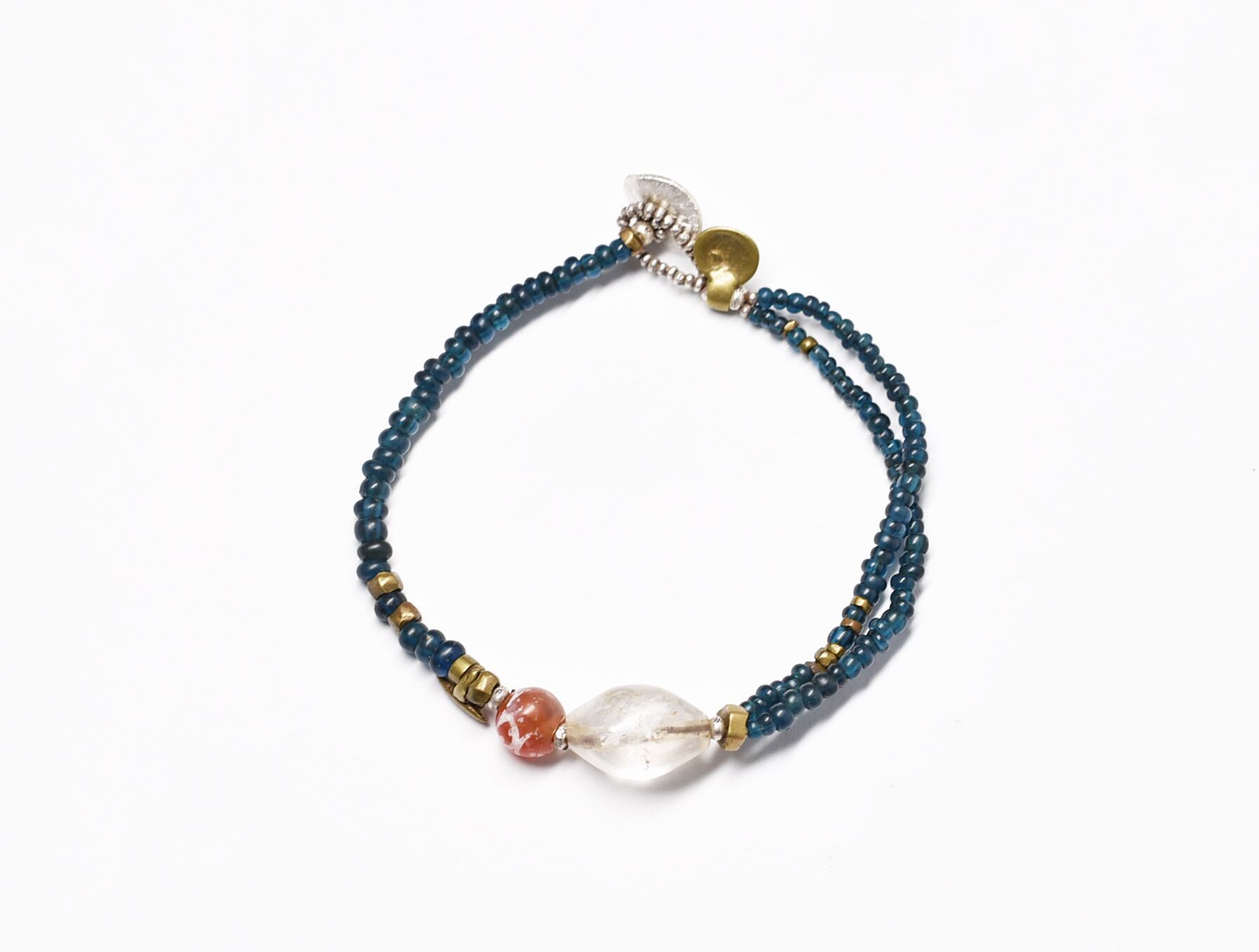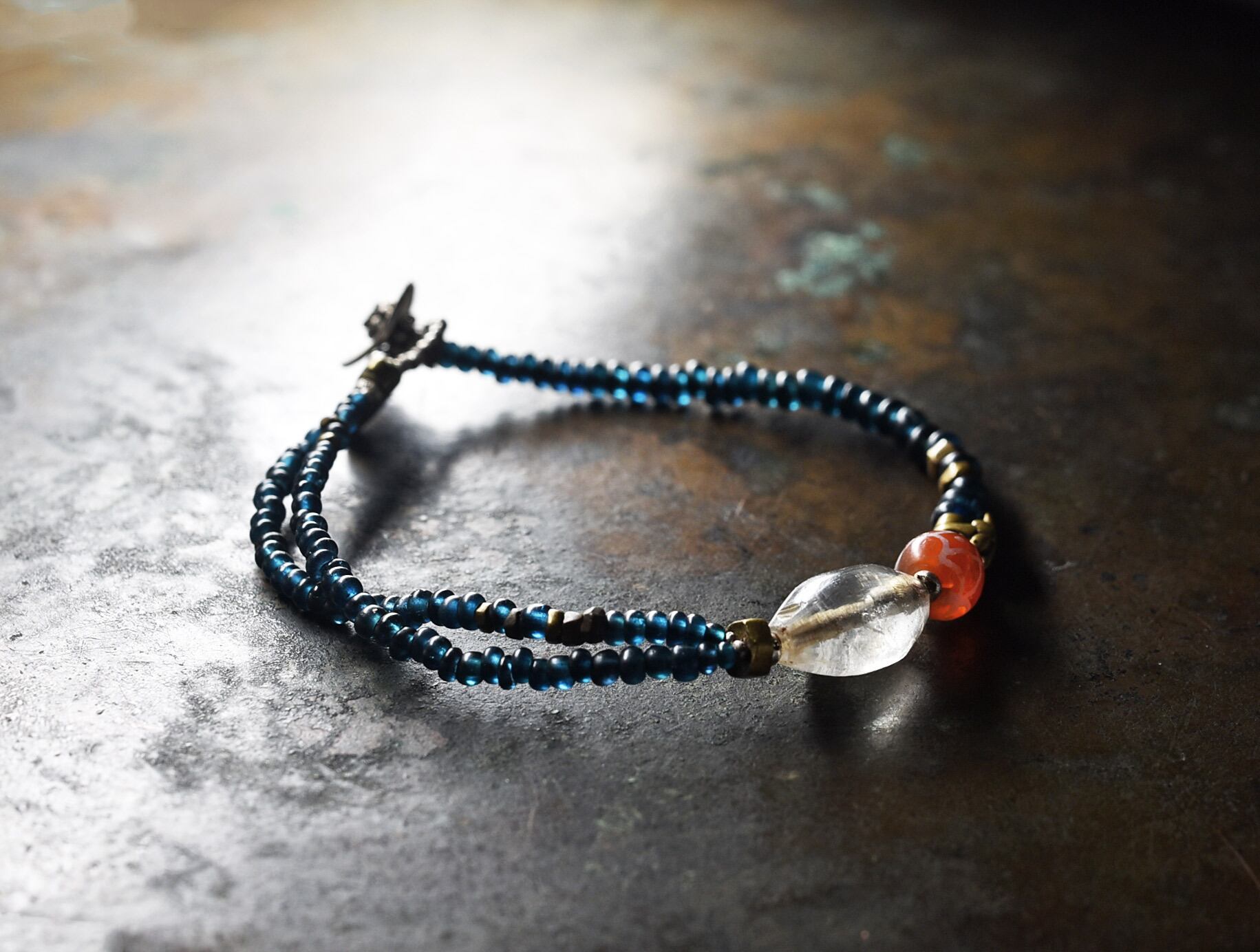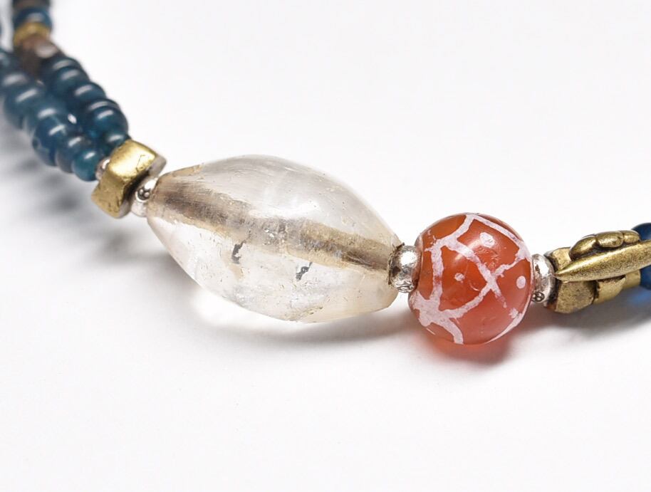 古代水晶、エッチドカーネリアン、インディゴブルーのアンティークビーズ、oldオリッサブラスなどを繋いだブレスです。