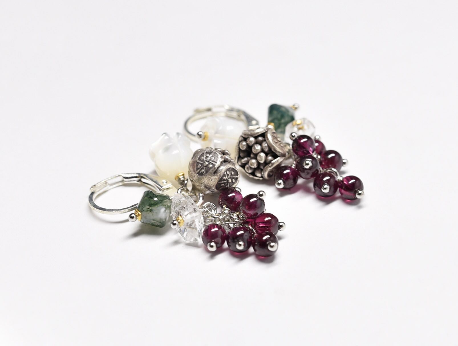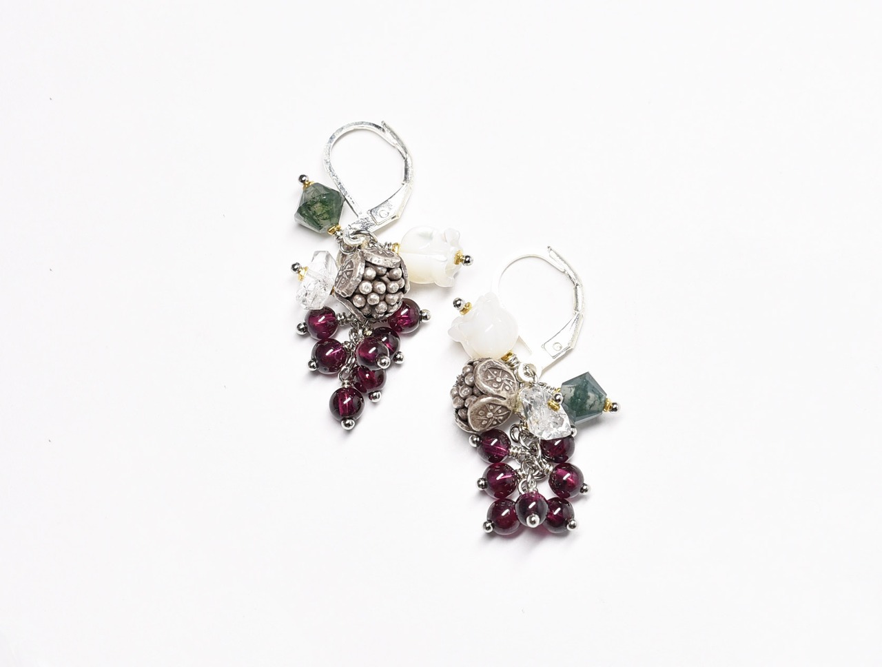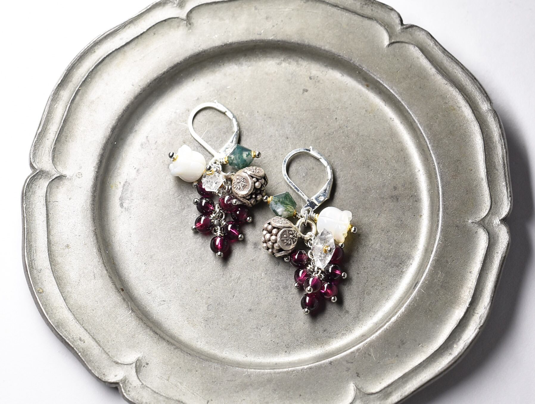 たわわなガーネットとモスアゲート、ハーキマーダイヤモンド、すずらんの形をしたシェル、丸いお花のカレンシルバーを繋いだピアスです。