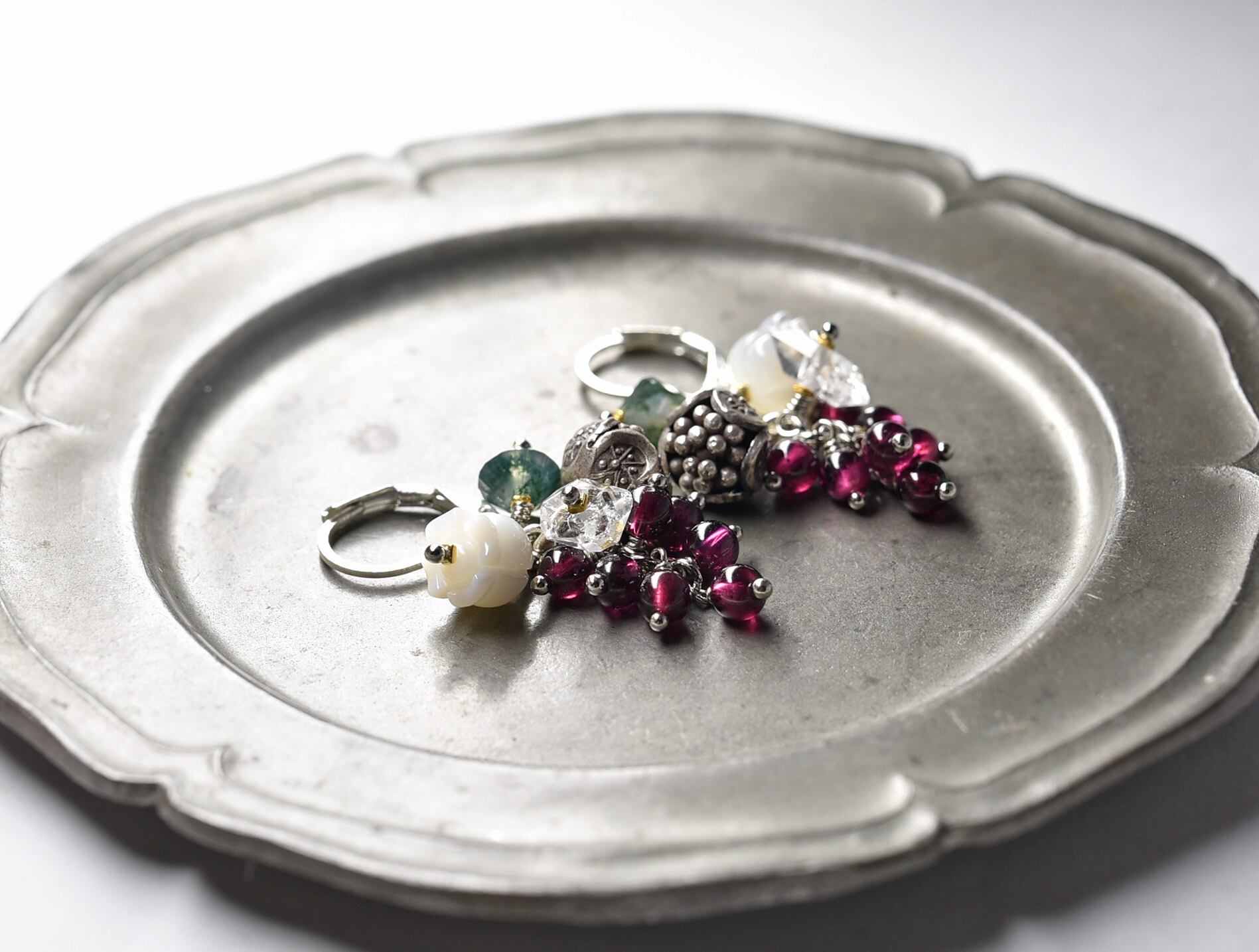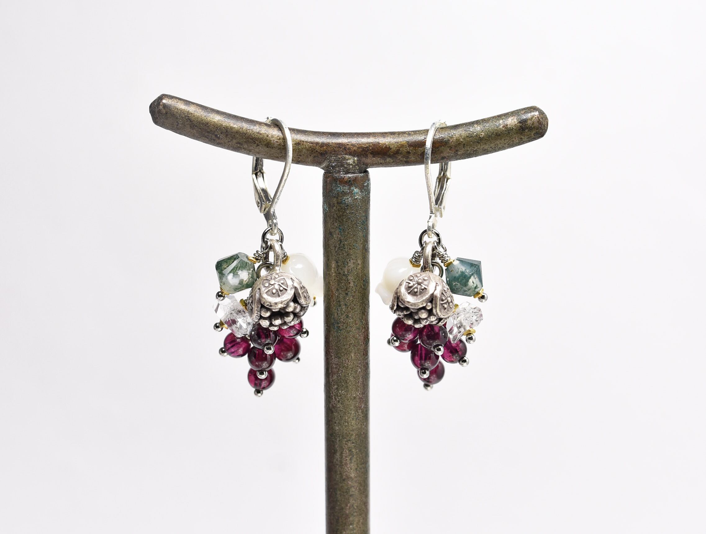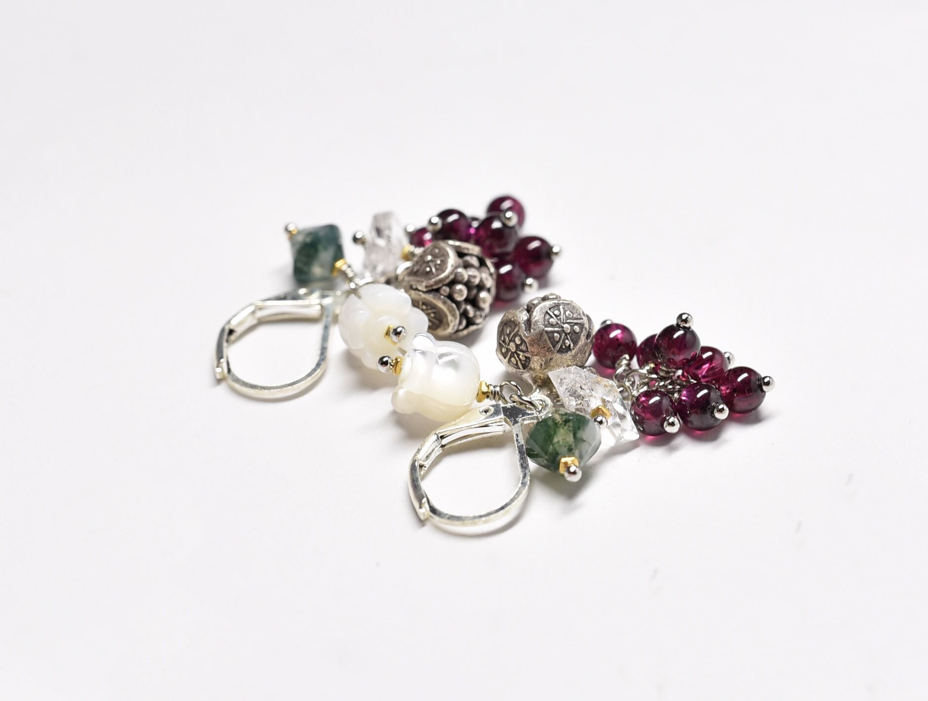 たわわなガーネットとモスアゲート、ハーキマーダイヤモンド、すずらんの形をしたシェル、丸いお花のカレンシルバーを繋いだピアスです。