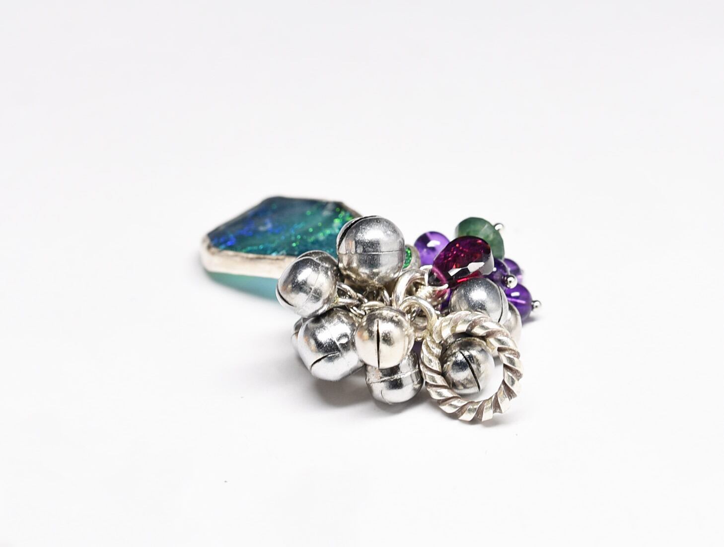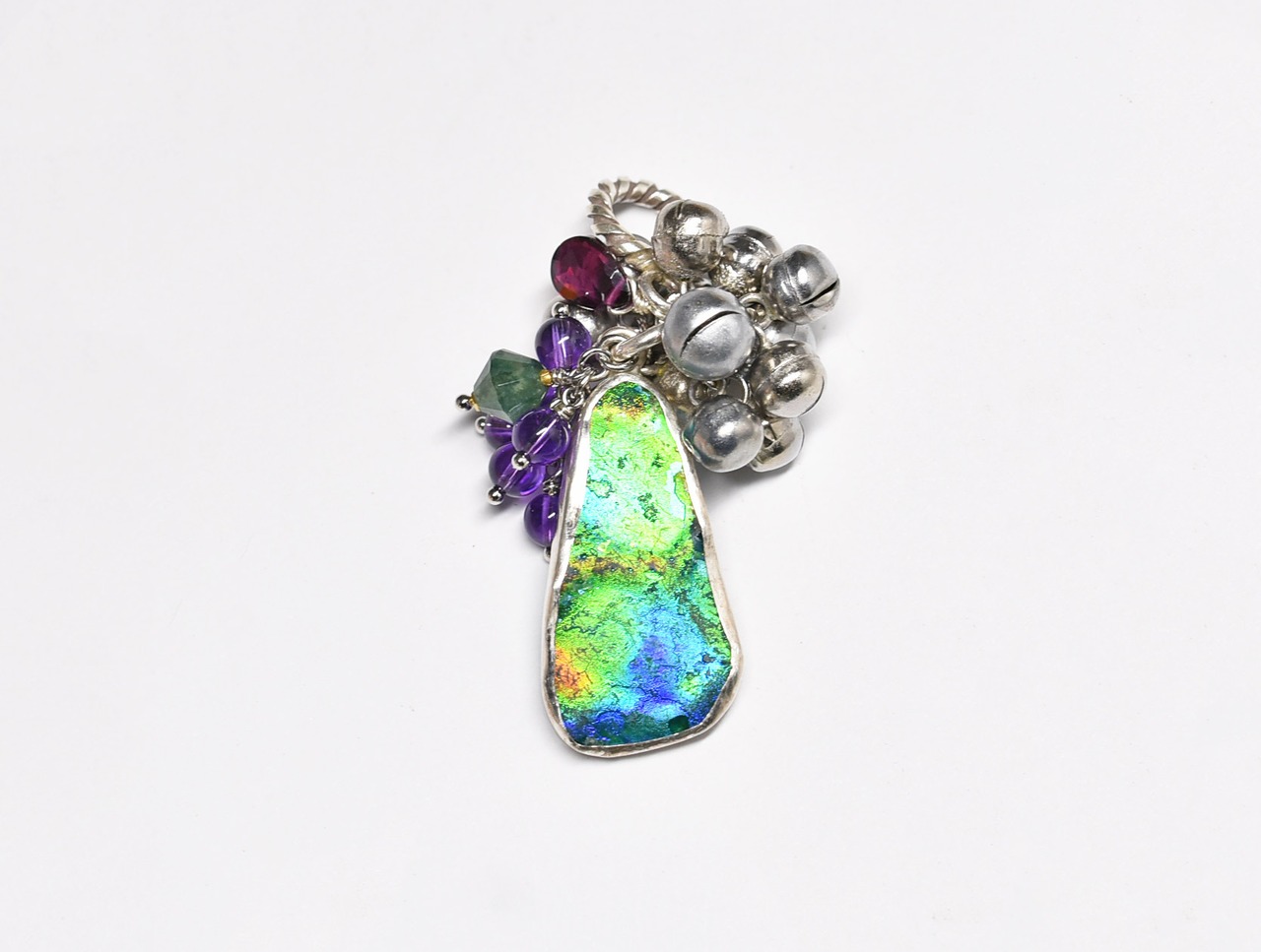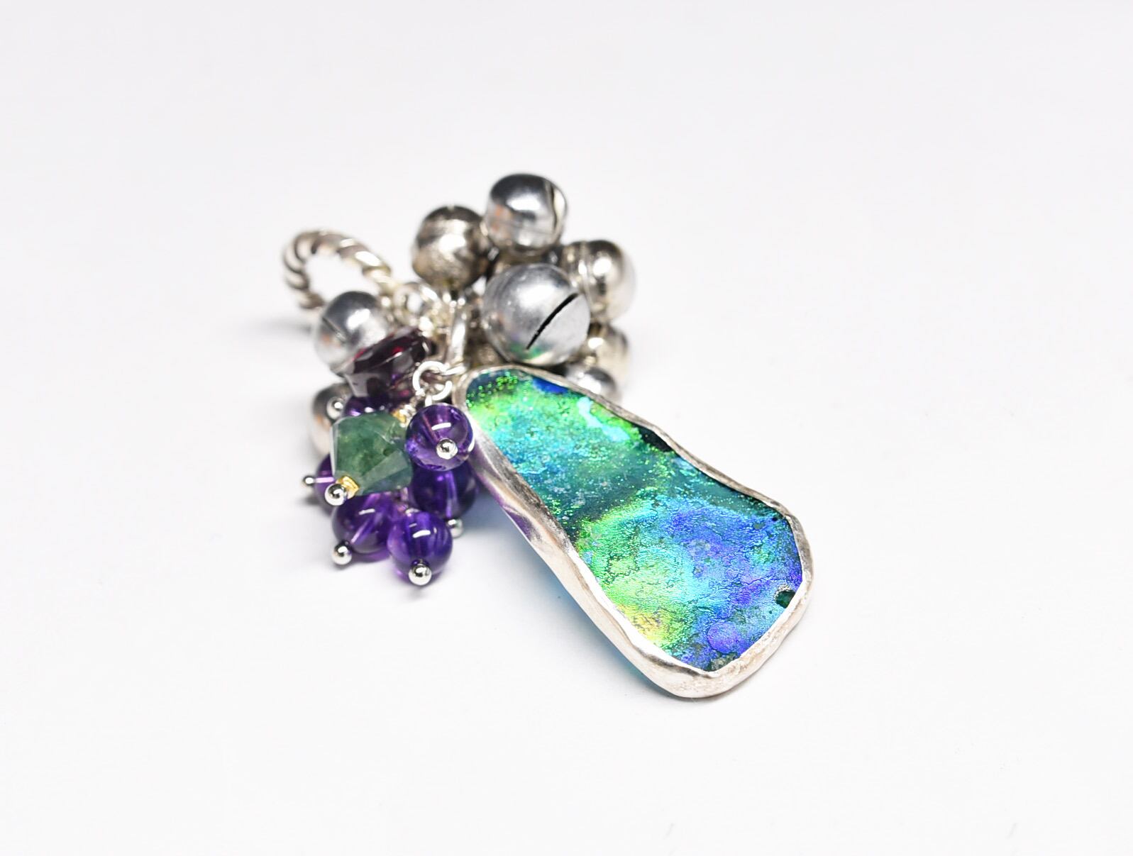 シルバー枠銀化ローマングラスとたわわな鈴とアメジスト、モスアゲート、アメジストを繋いだペンダントトップです。