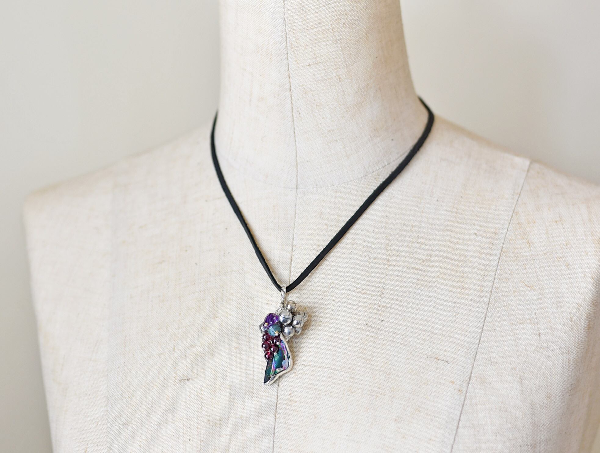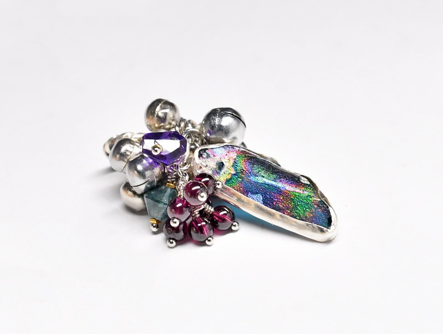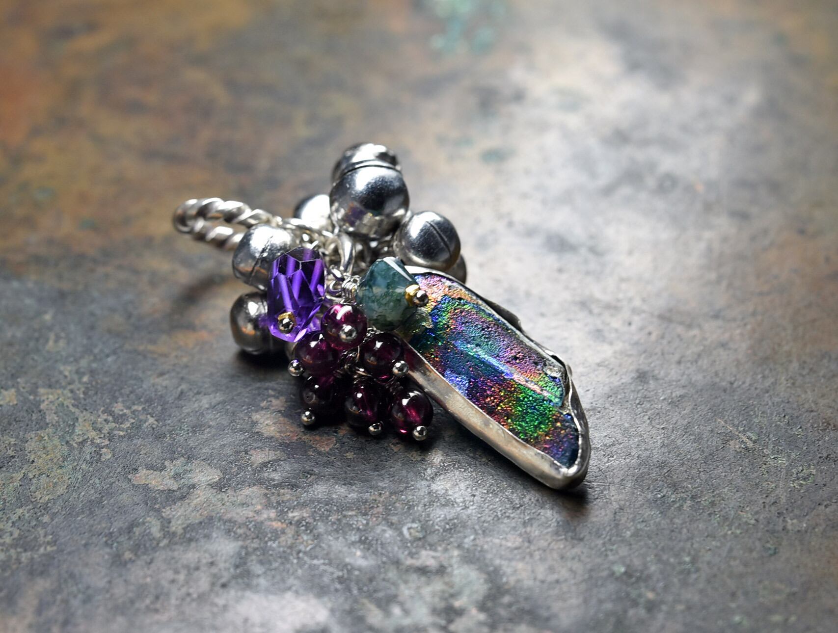 シルバー枠銀化ローマングラスとたわわな鈴とガーネット、モスアゲート、アメジストを繋いだペンダントトップです。