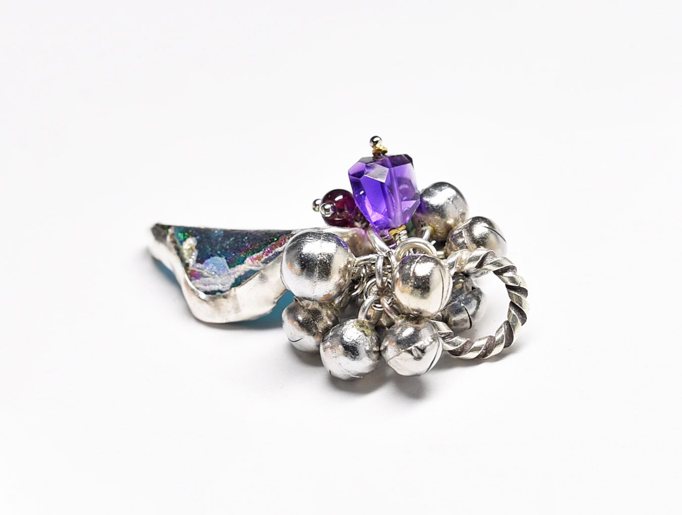 シルバー枠銀化ローマングラスとたわわな鈴とガーネット、モスアゲート、アメジストのペンダントトップ