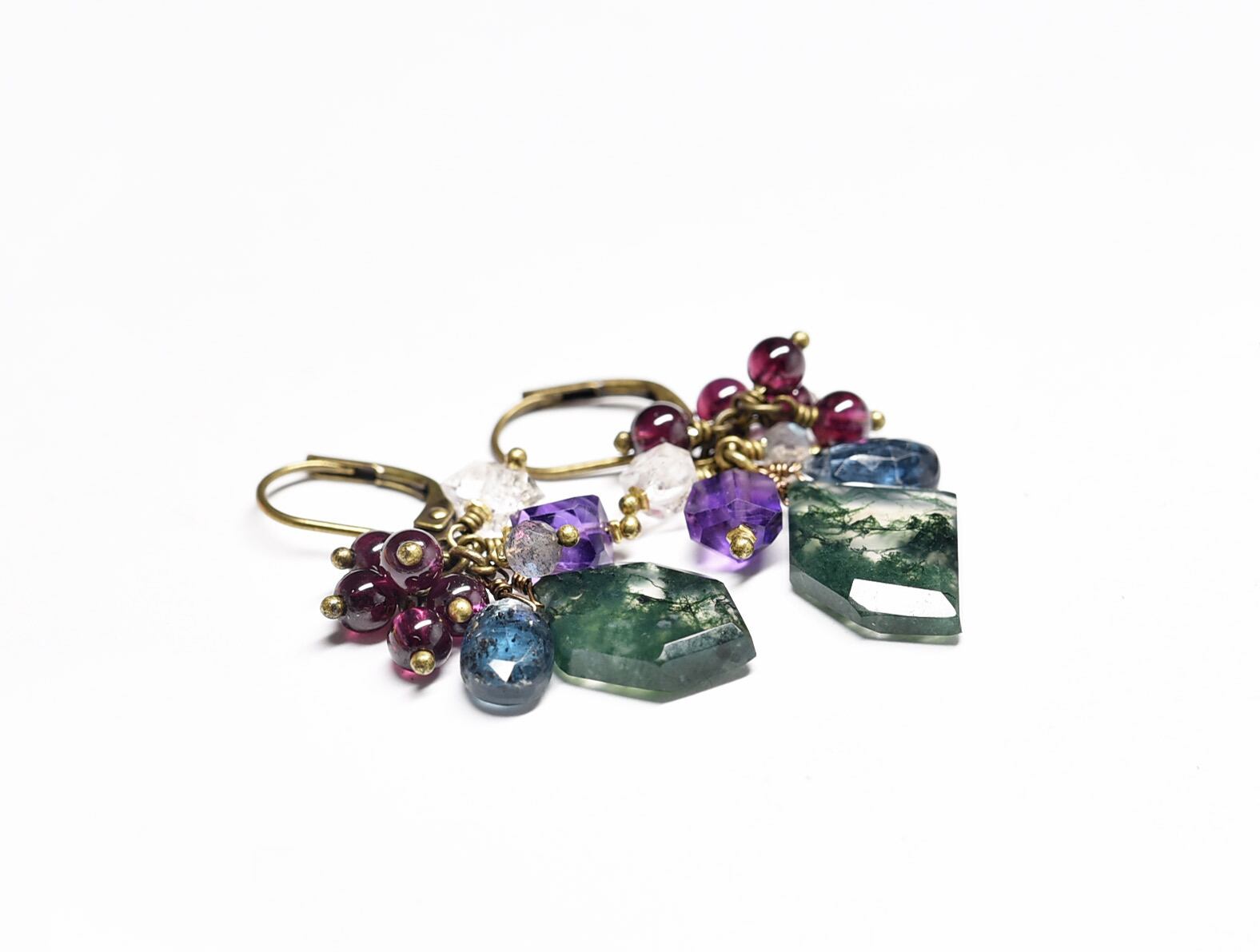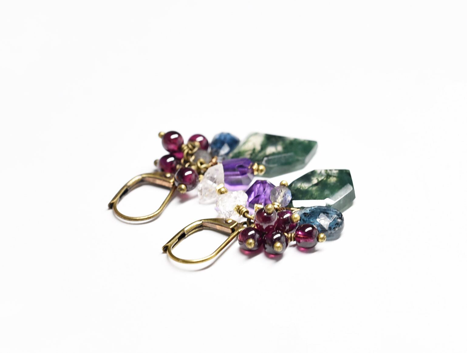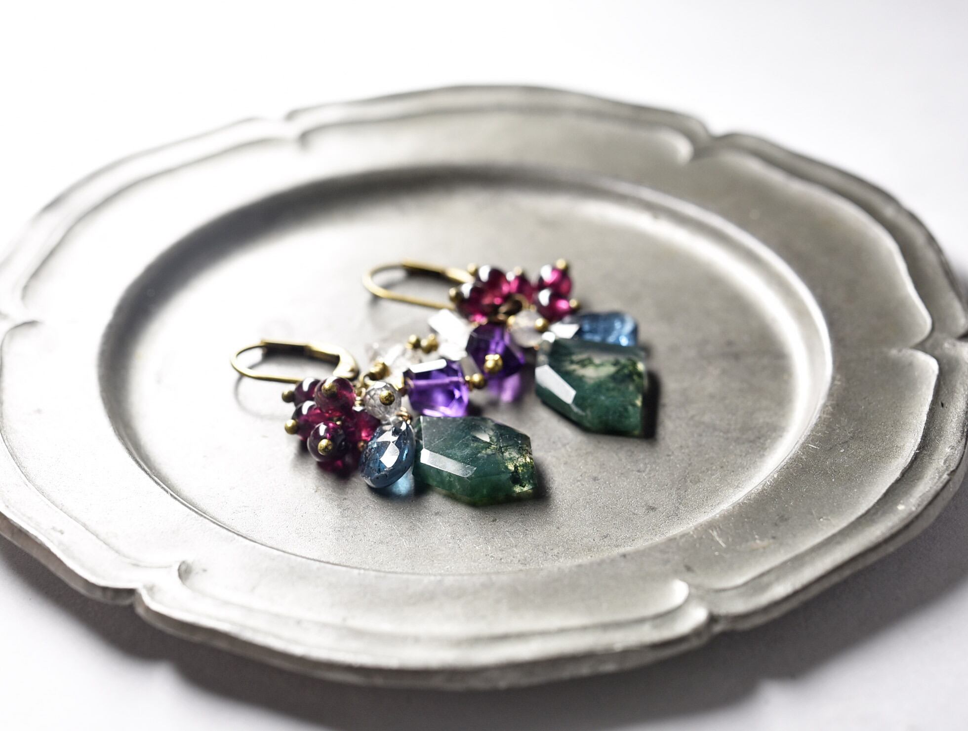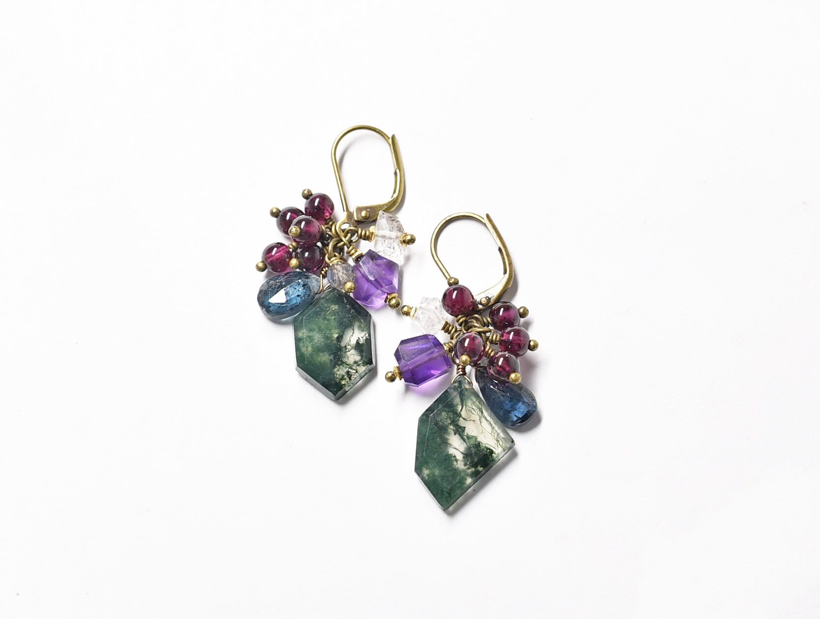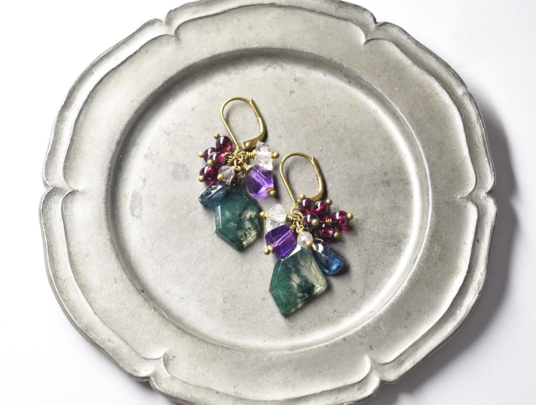 モスアゲートとたわわなガーネット、カイヤナイト、ラブラドライト、ハーキマーダイヤモンド、アメジストのピアス(濃)