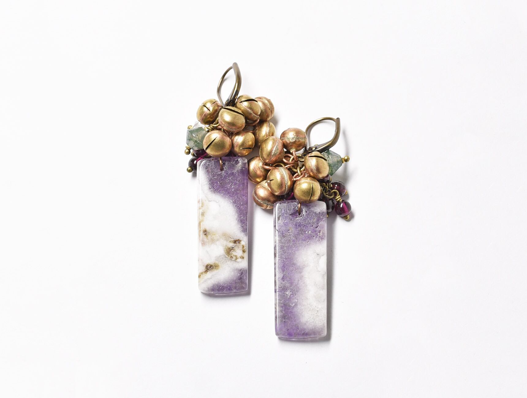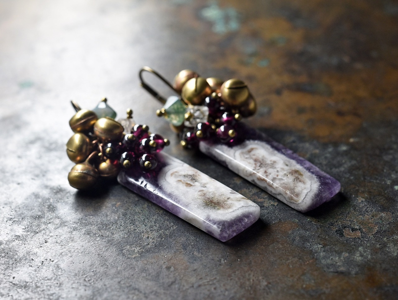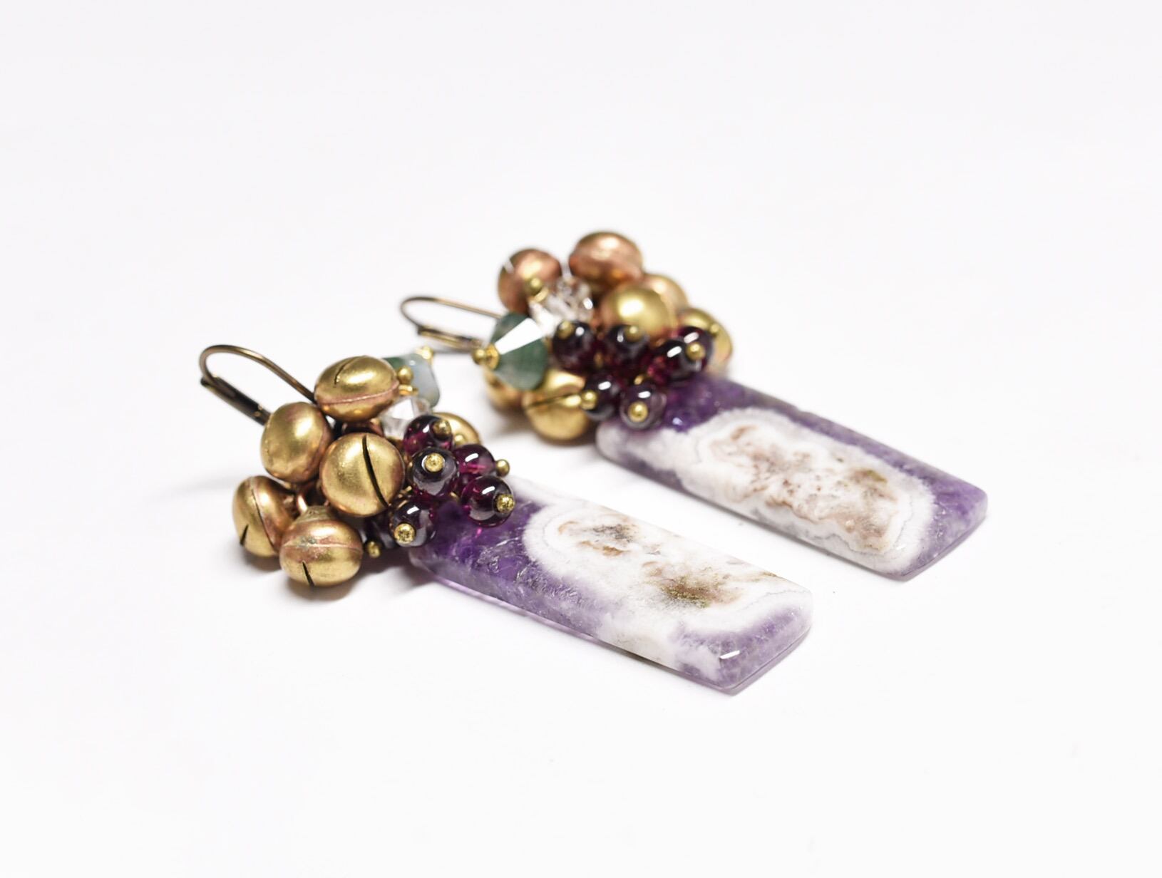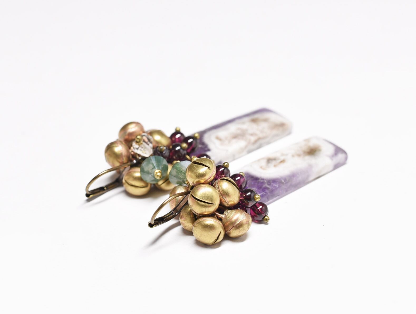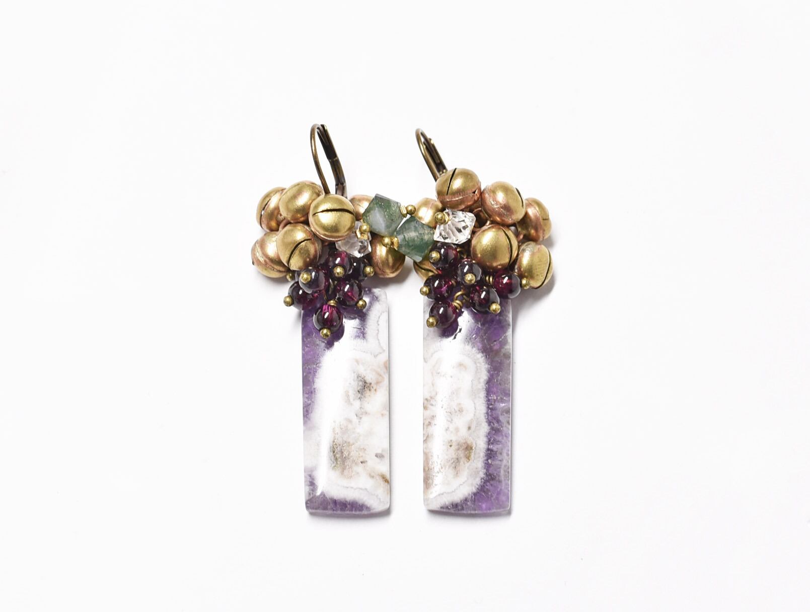 シェブロンアメジスト、たわわな鈴とガーネット、ハーキマーダイヤモンド、モスアゲートのピアス