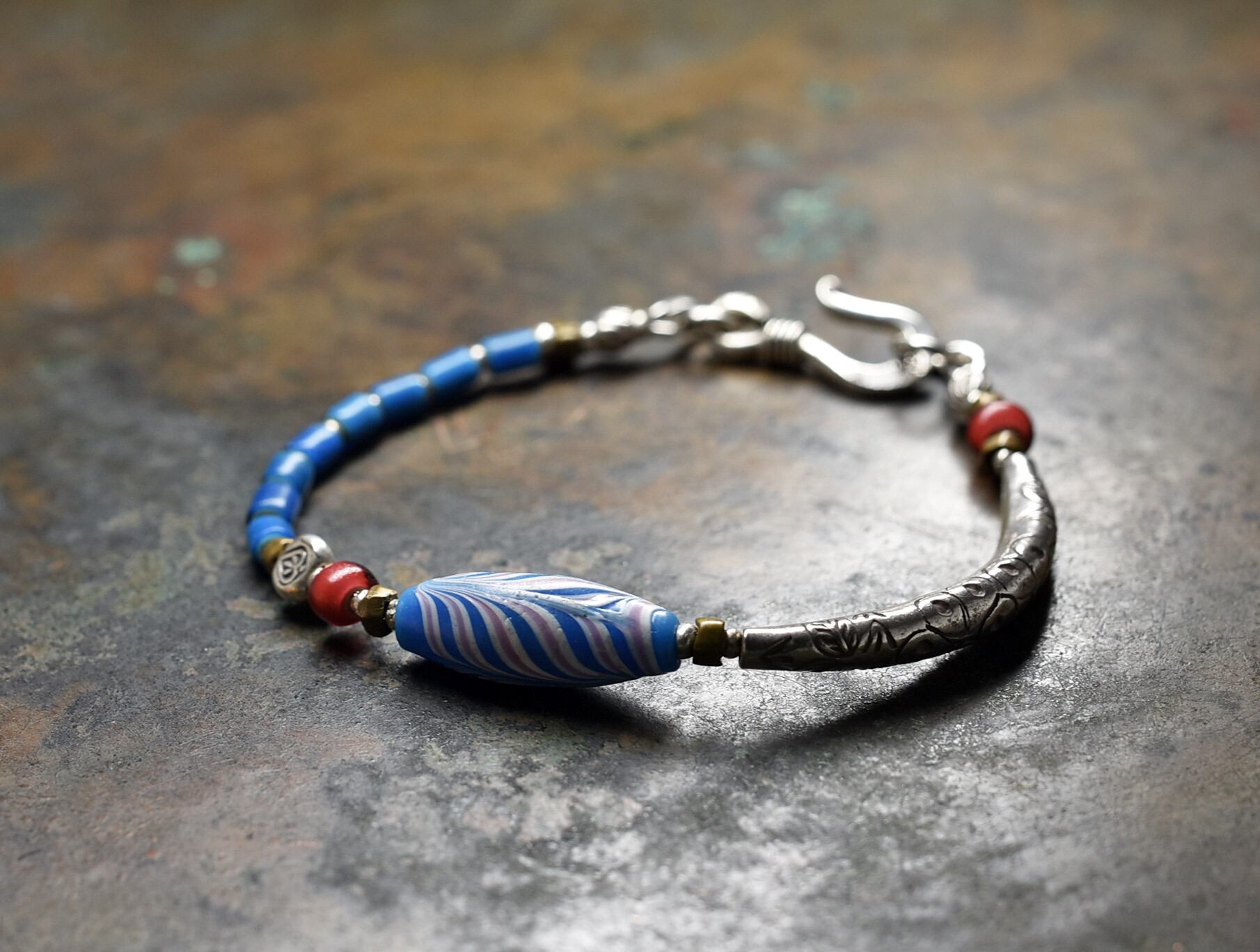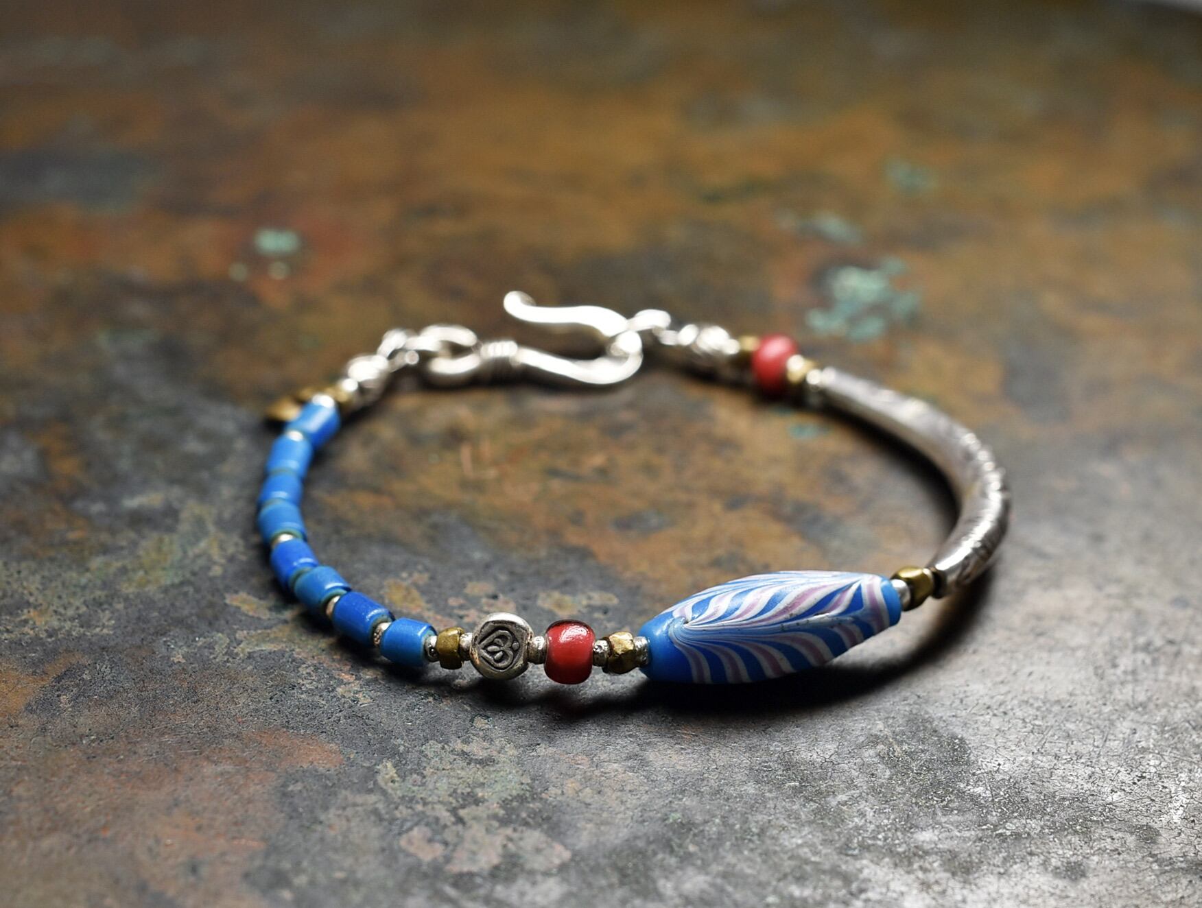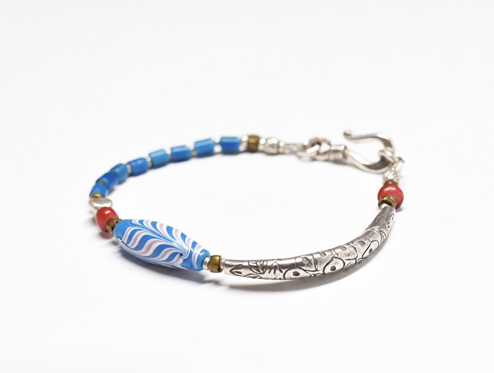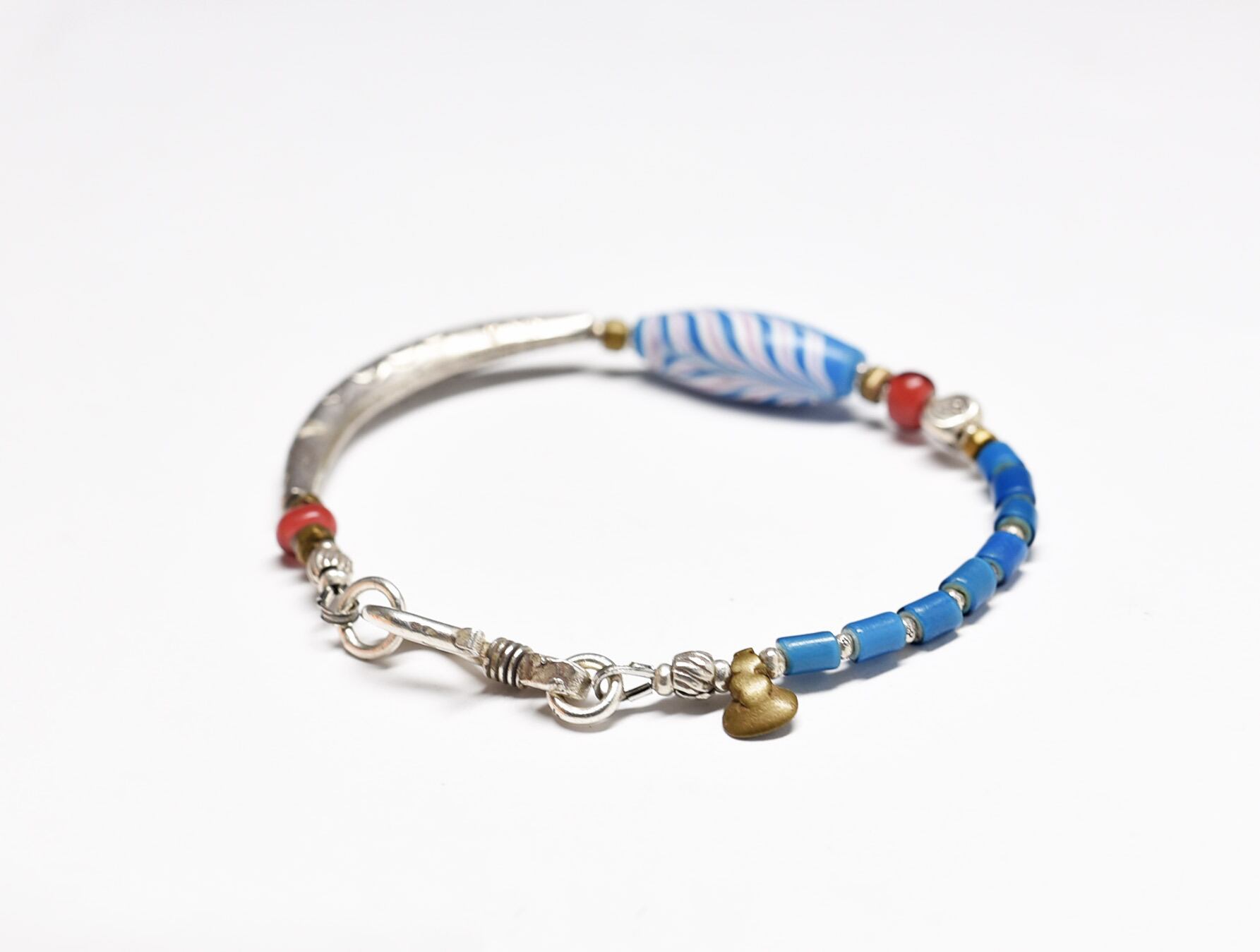 フェザービーズを中心に、スカイブルーホワイトハーツ、金赤ホワイトハーツ、湾曲したカレンシルバー、oldオリッサブラスなどで繋いだブレスです。