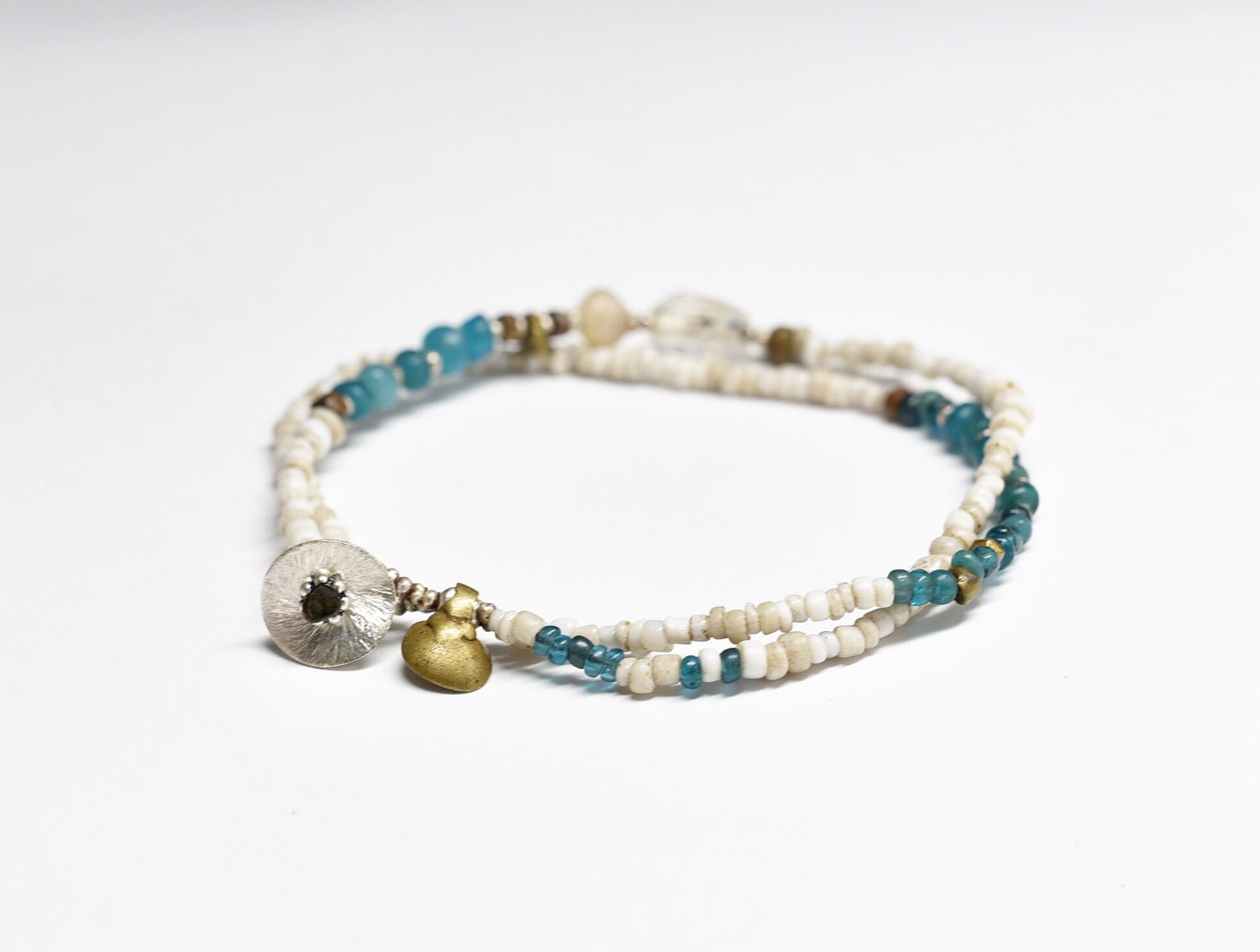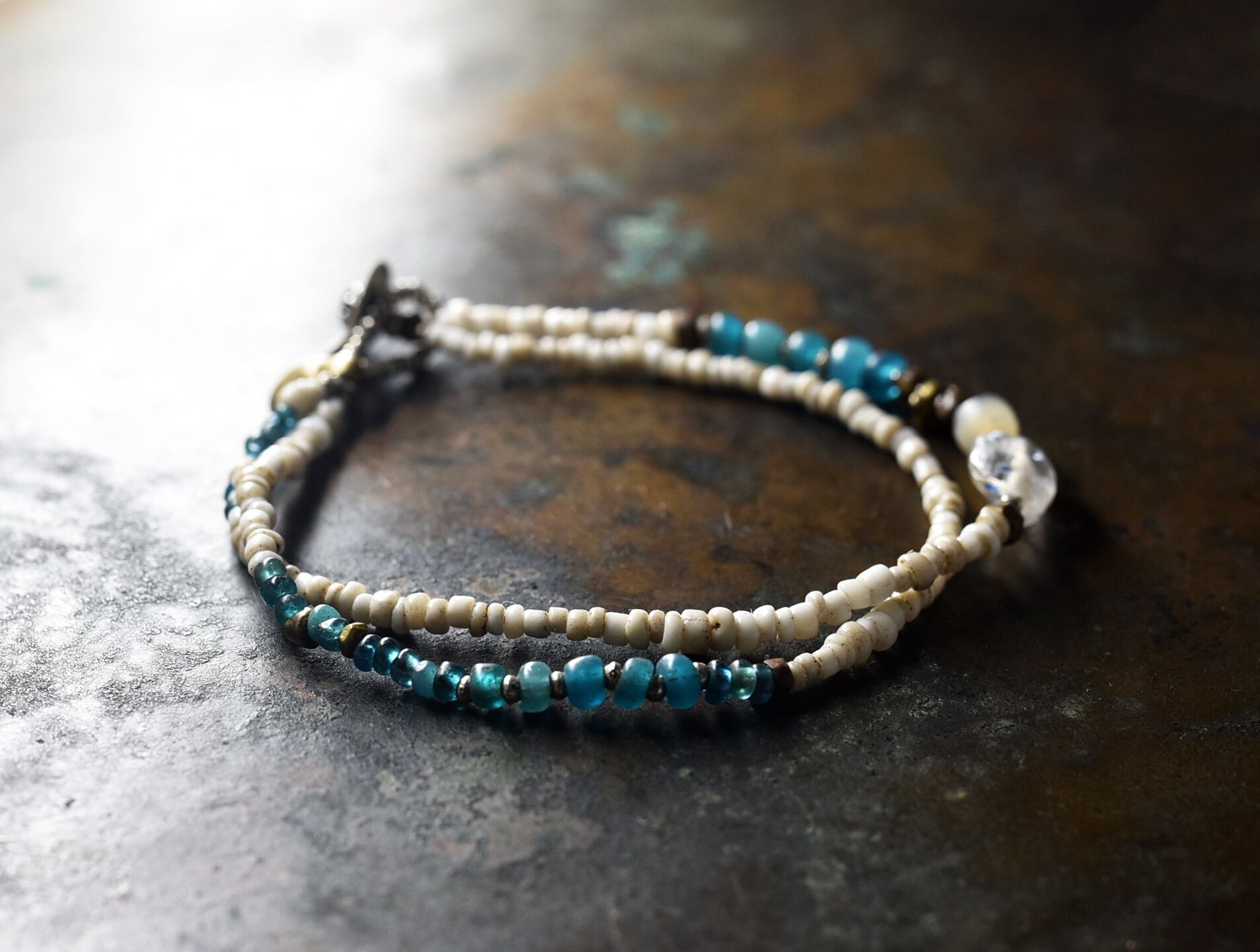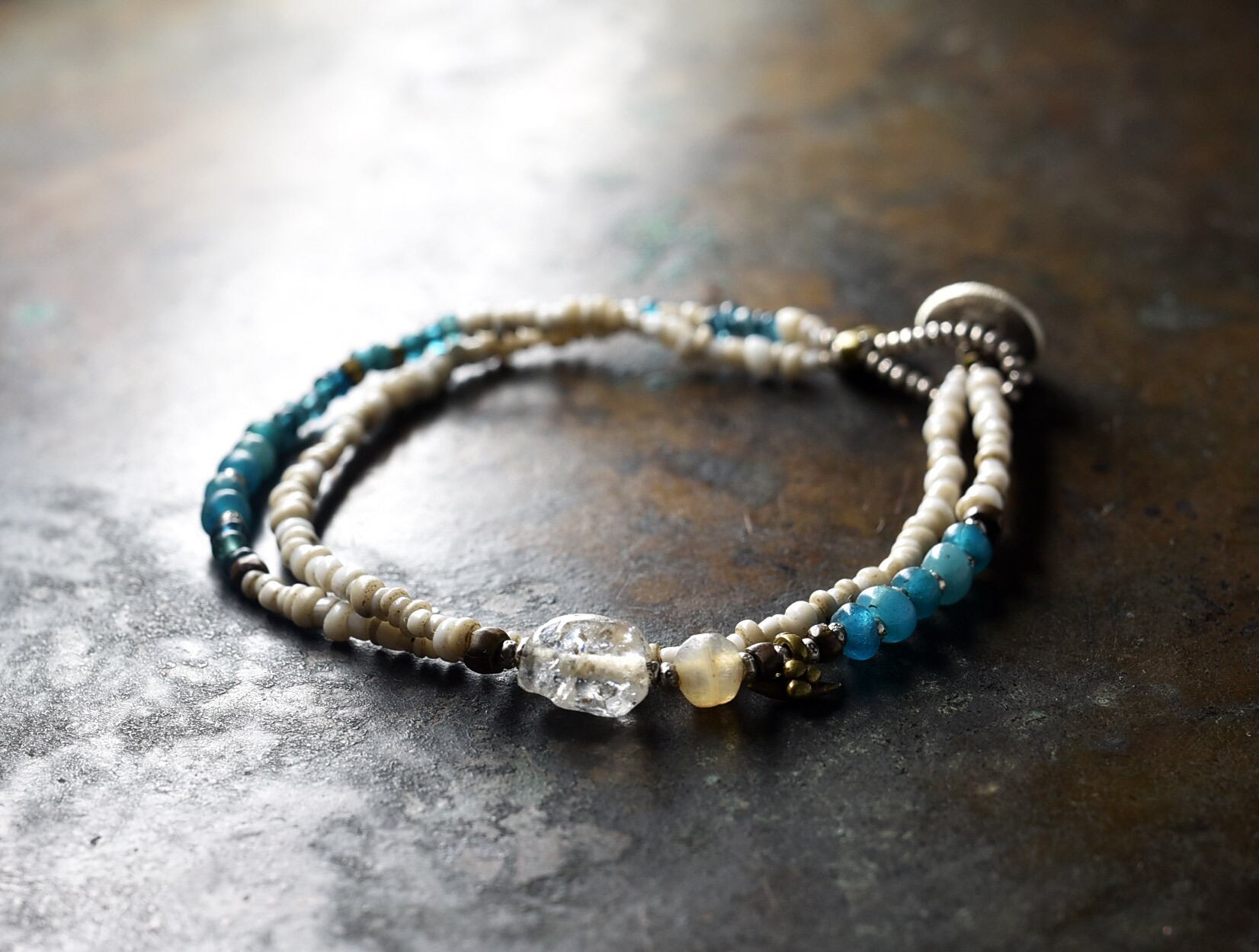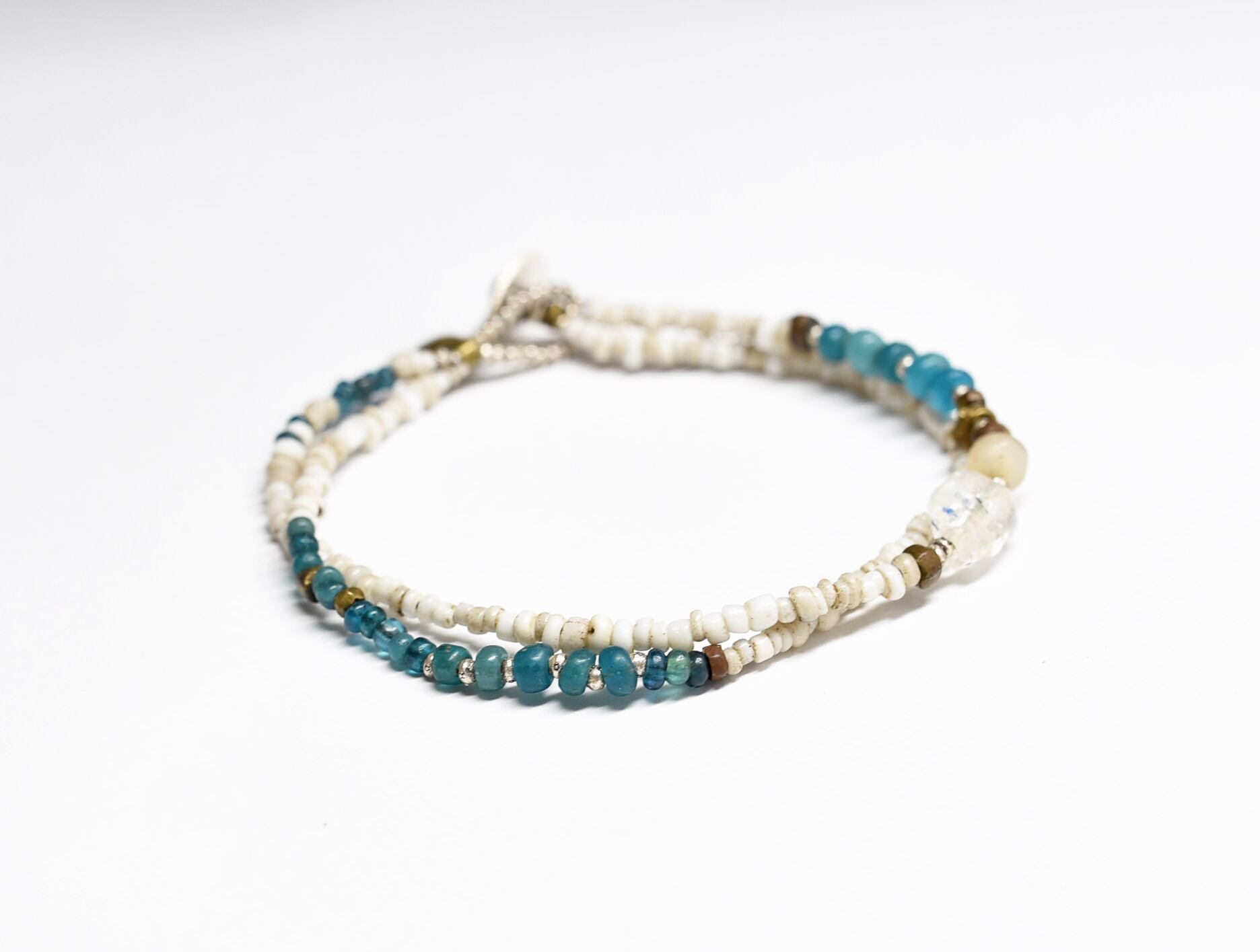 古代施釉水晶と古代瑪瑙、エメラルドブルーアンティークビーズ、ホワイトシードビーズのブレス