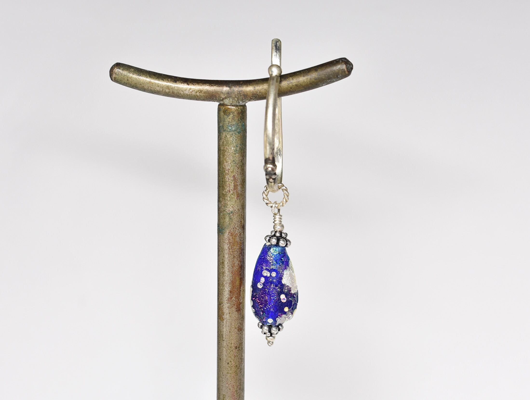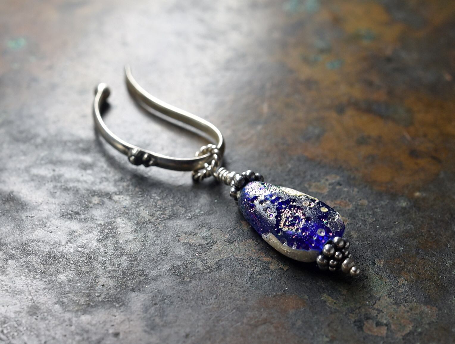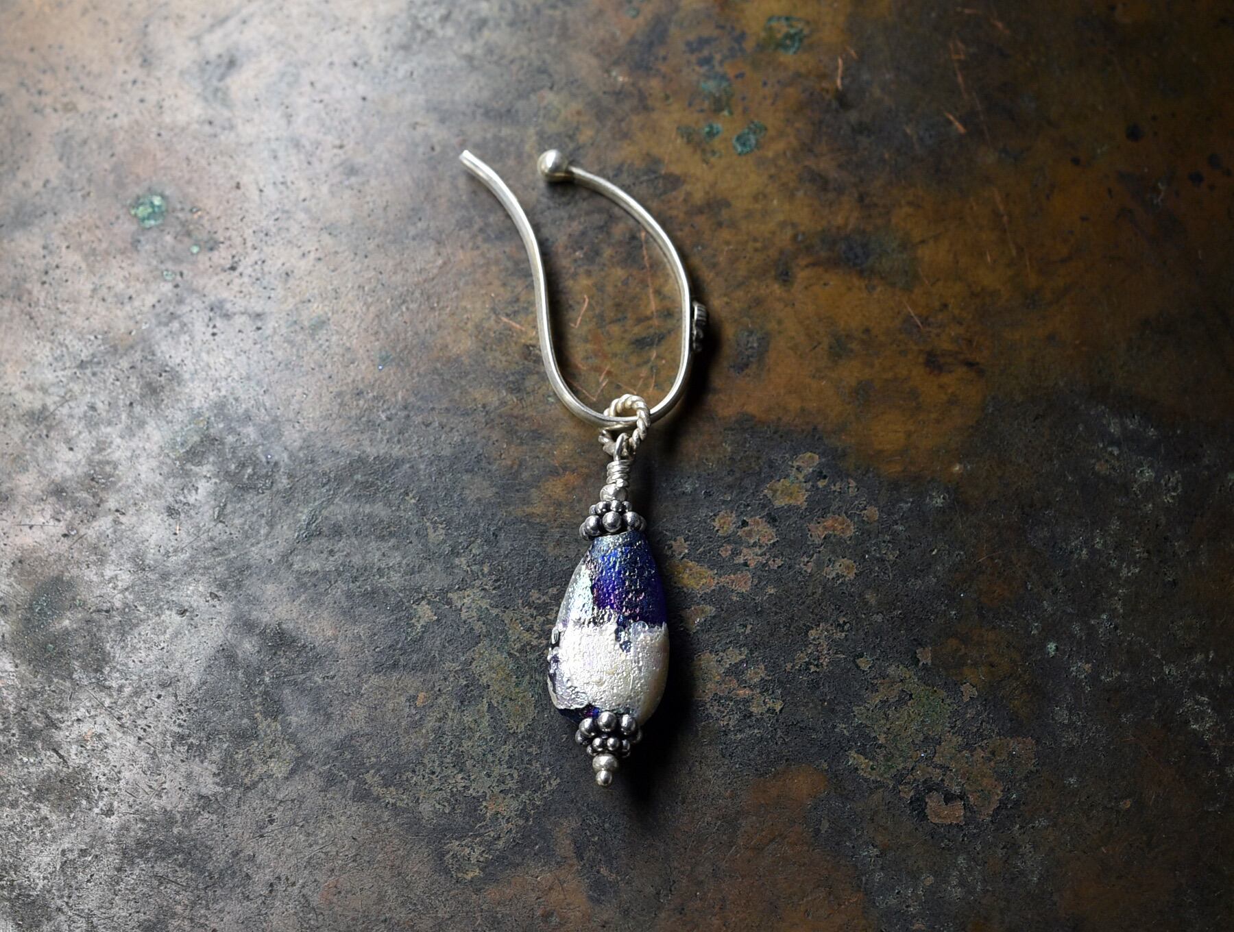 雫型瑠璃色極上銀化ローマングラスビーズのインドシルバーイヤーカフ