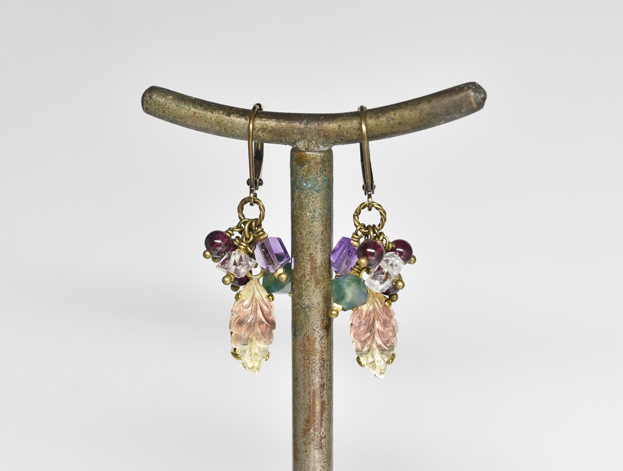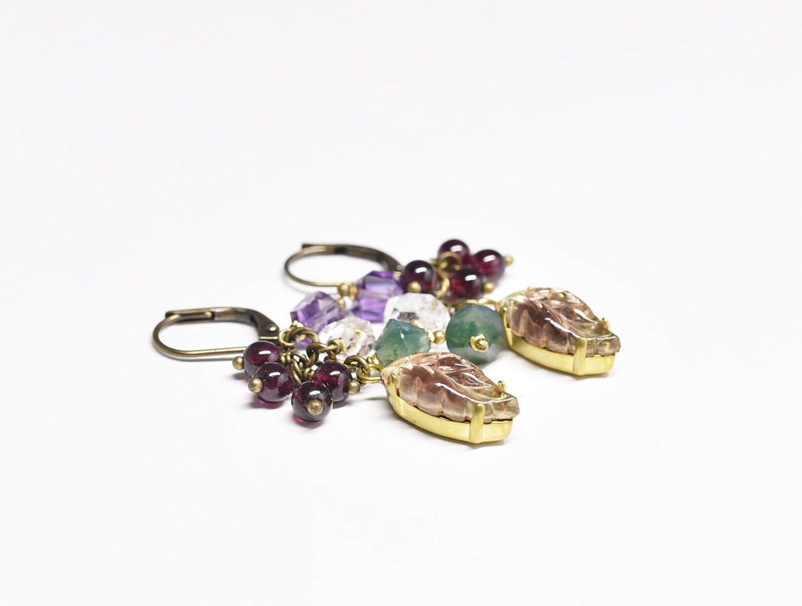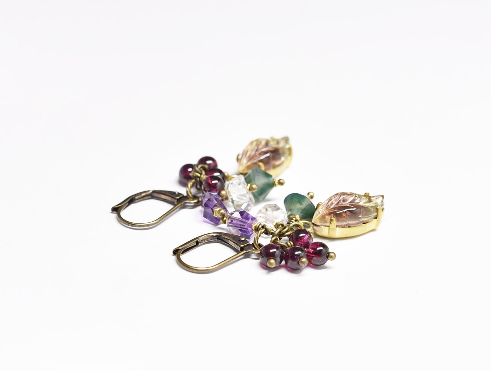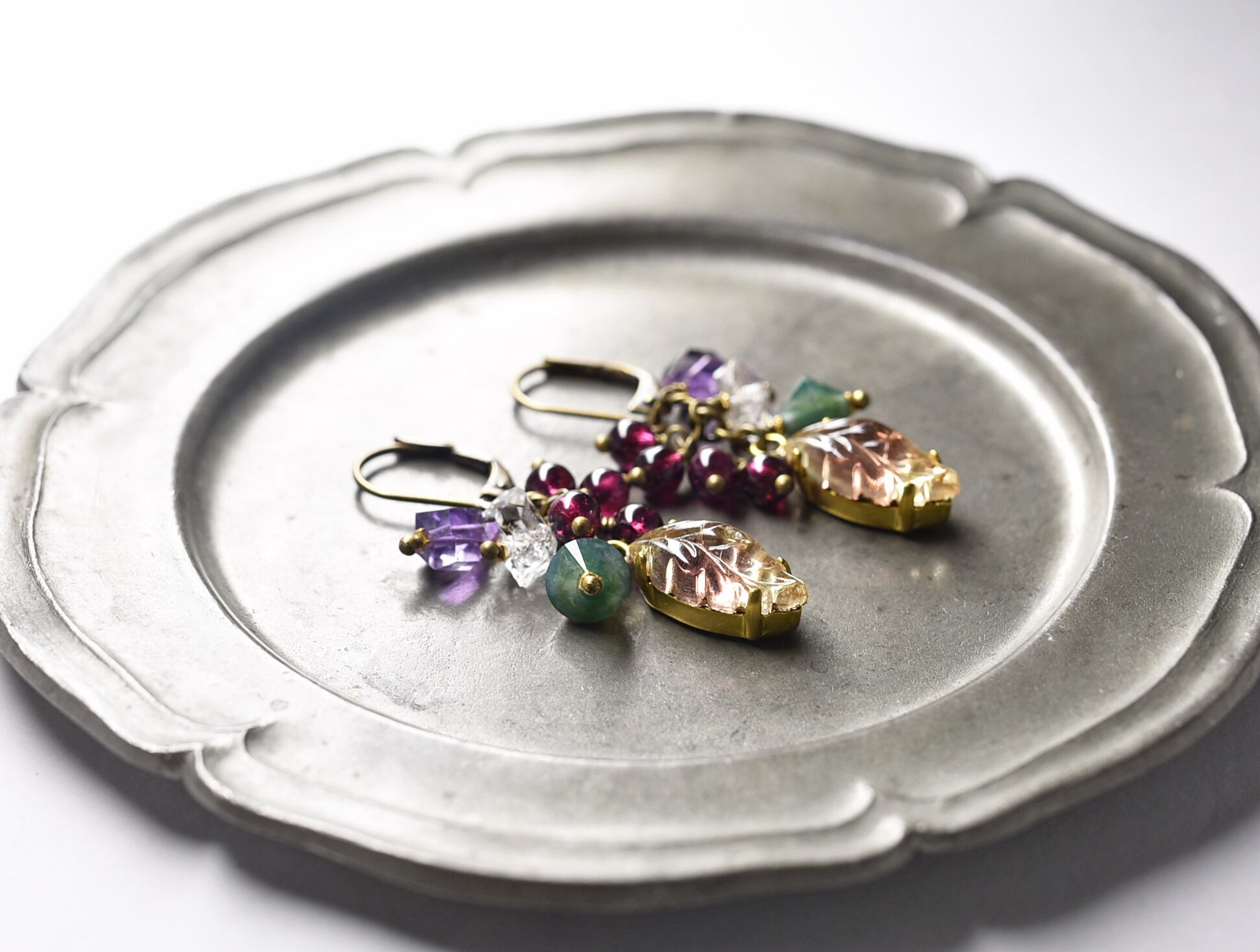 ヴィンテージビーズとたわわなガーネット、ハーキマーダイヤモンドとアメジスト、モスアゲートを繋いだピアスです。