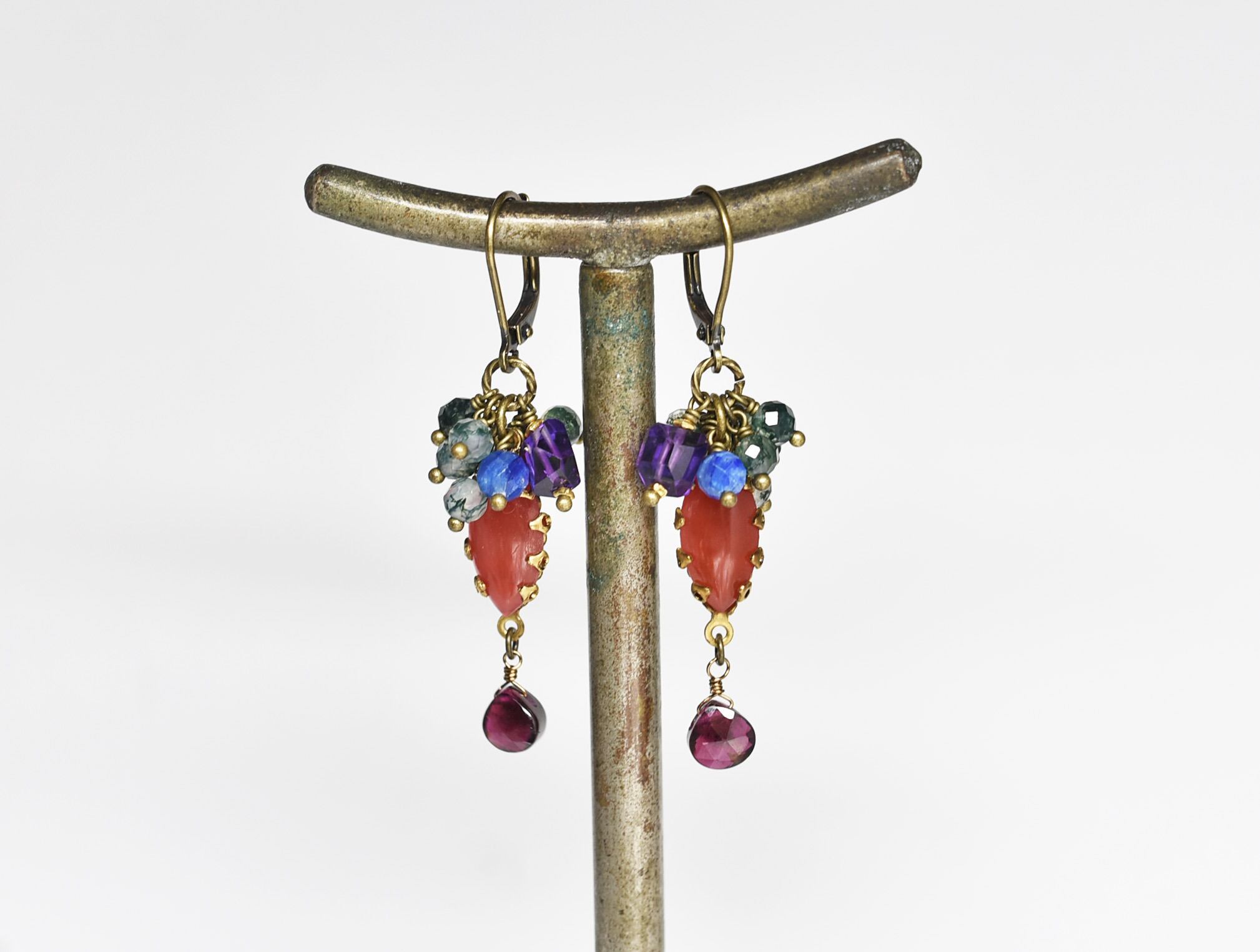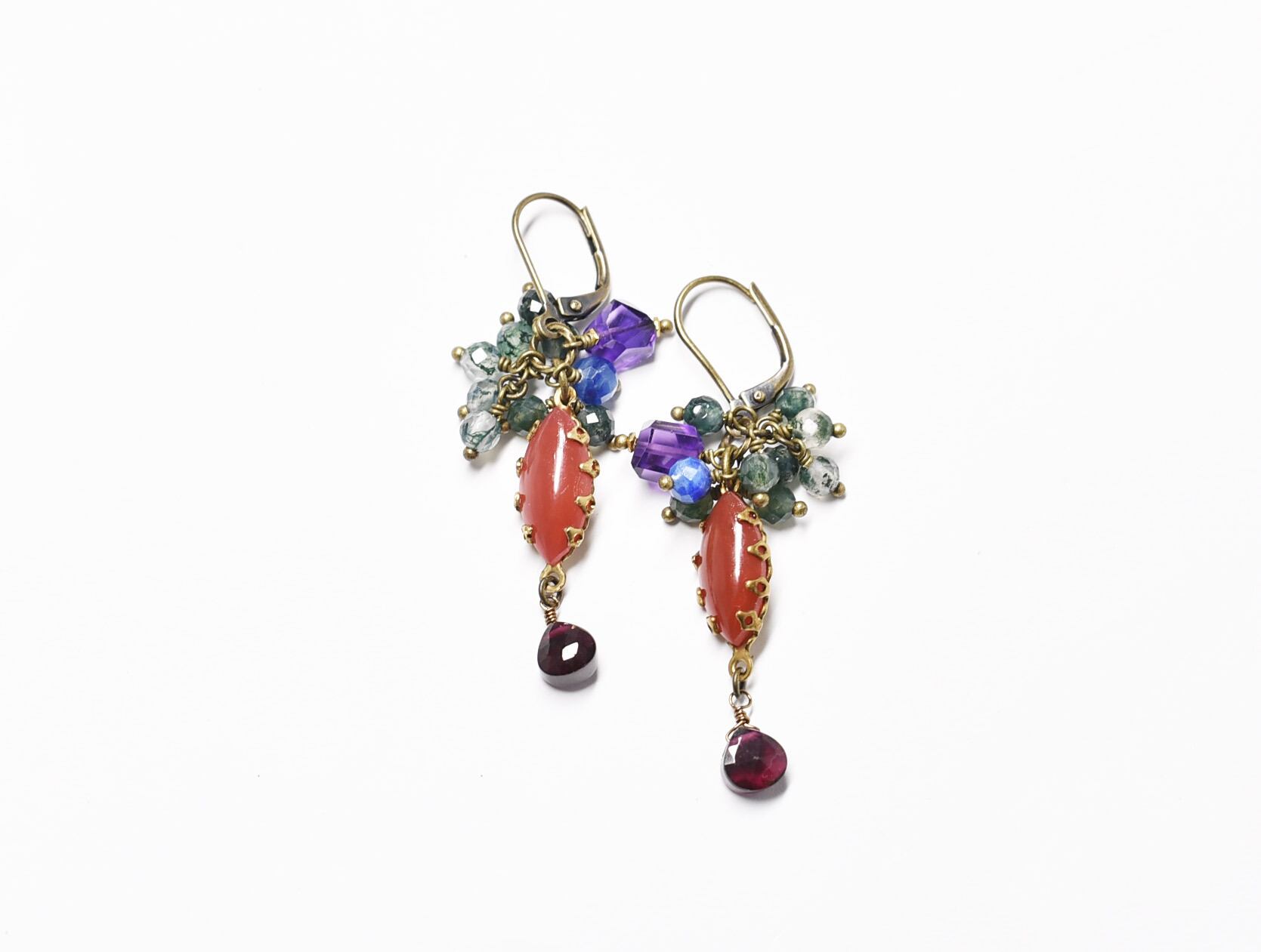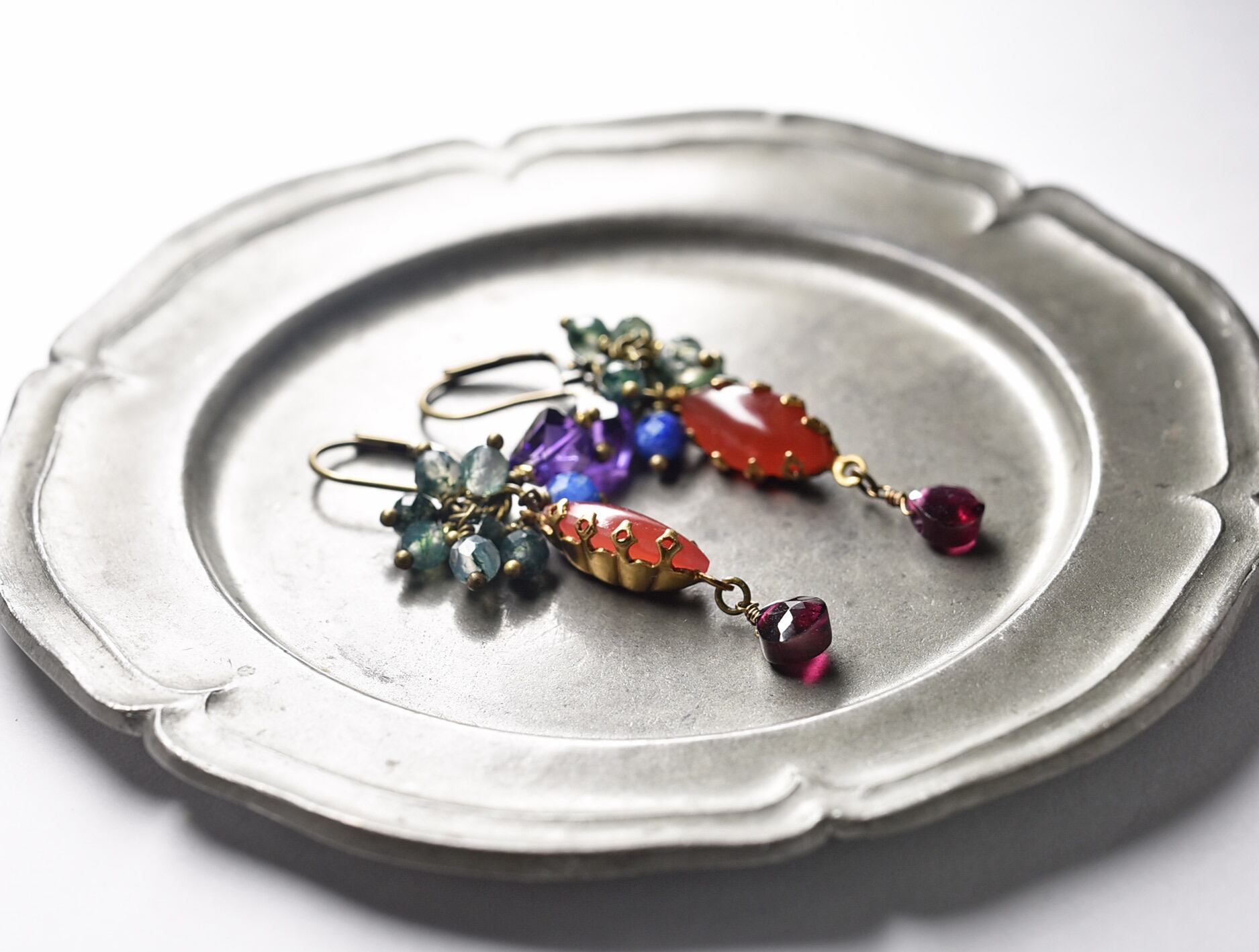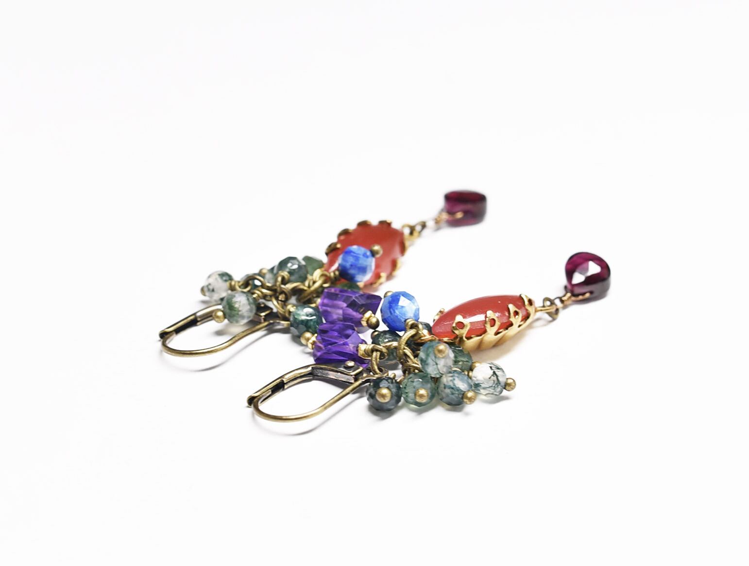 ヴィンテージビーズとたわわなモスアゲート、ガーネット、アメジスト、カイヤナイトのピアス