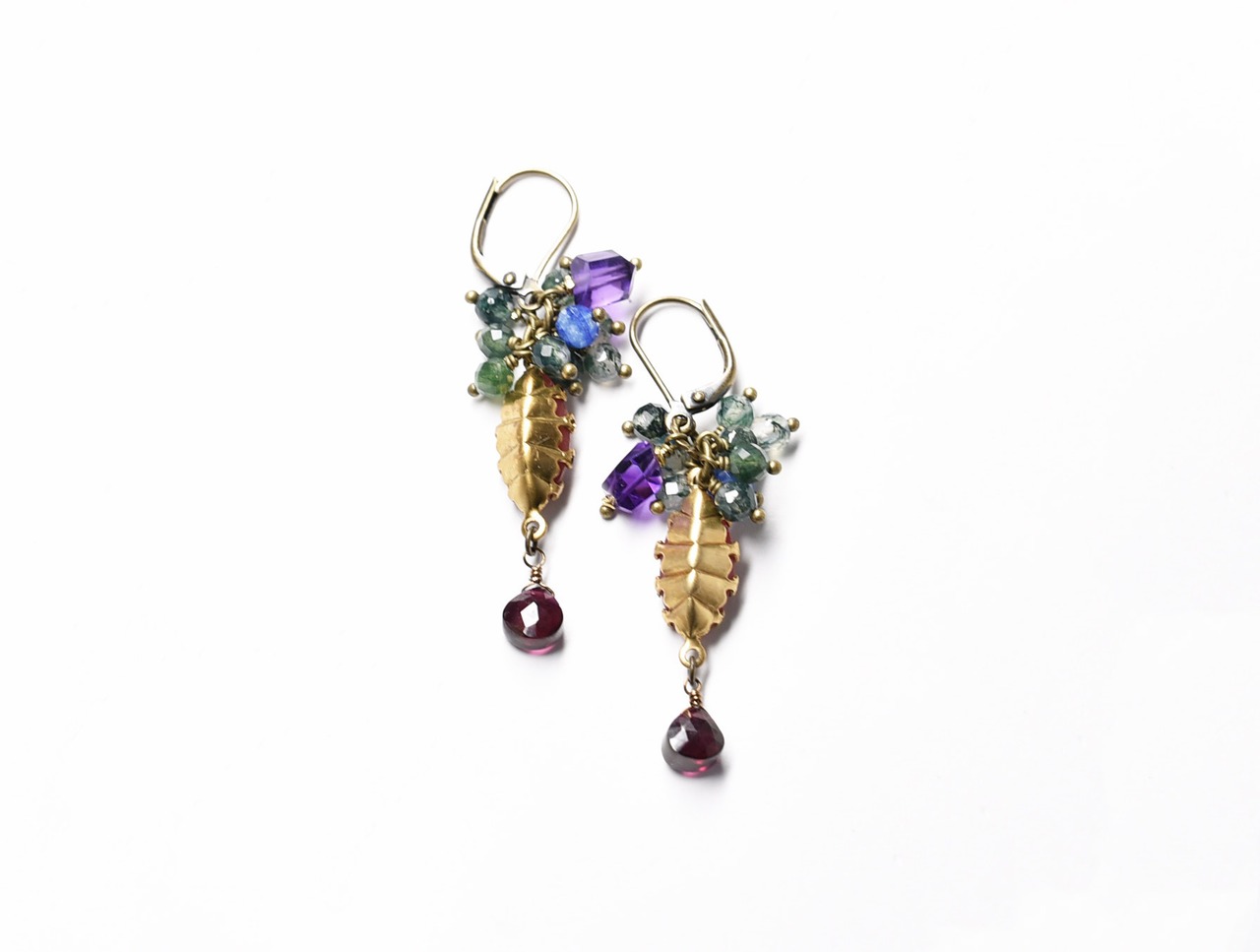 ヴィンテージビーズとたわわなモスアゲート、ガーネット、アメジスト、カイヤナイトを繋いだピアスです。