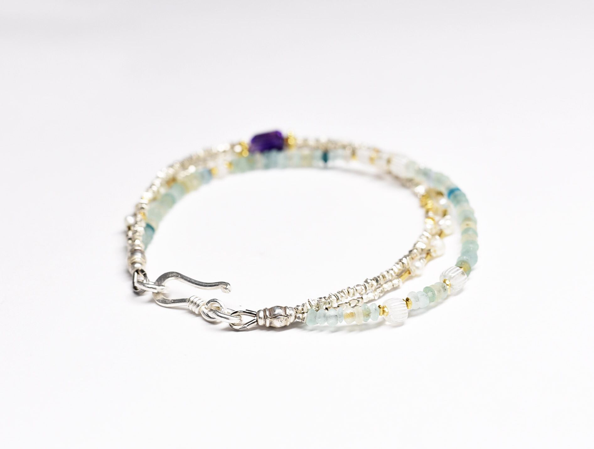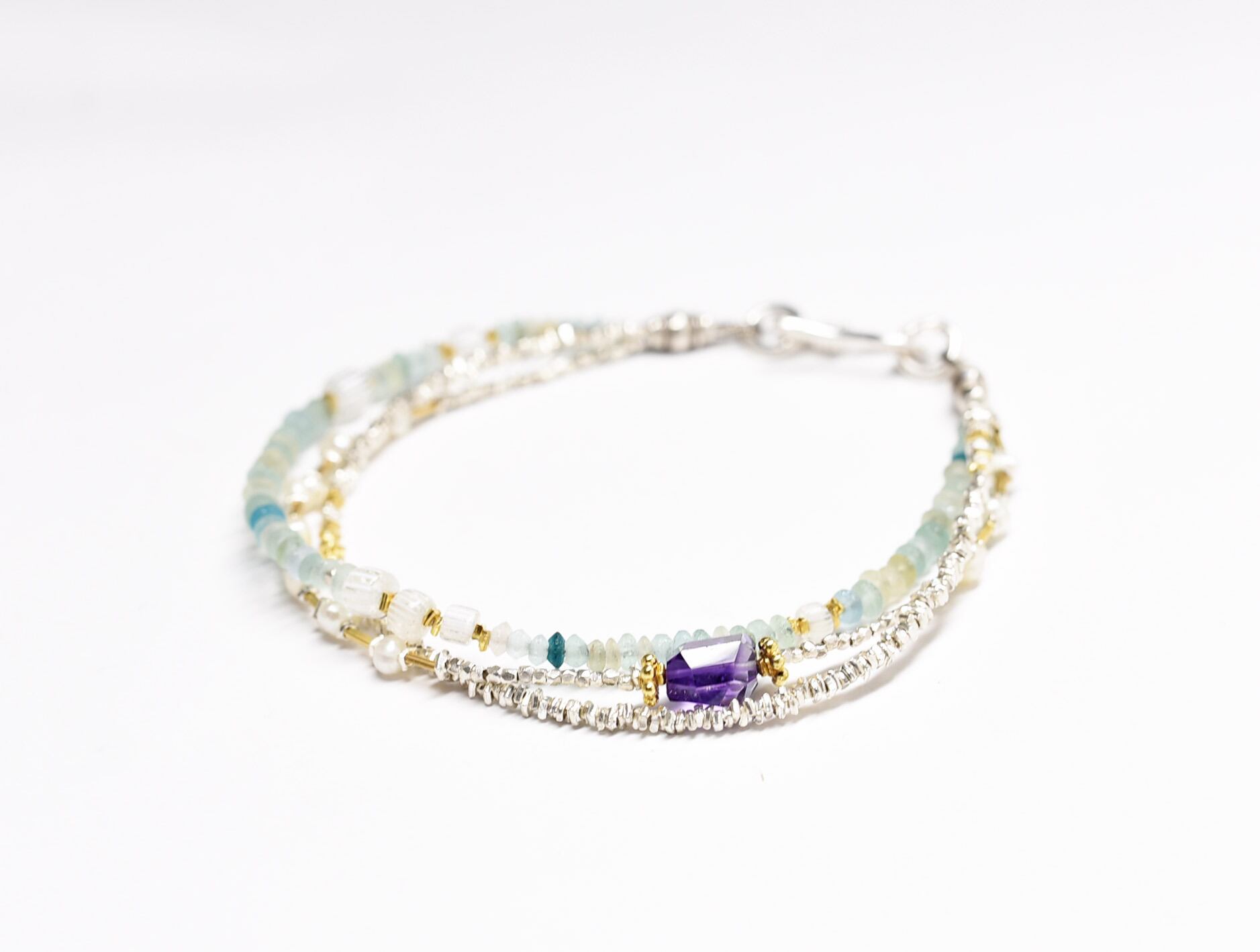 小さなローマングラスとグーズベリー淡水パール、ラフカットアメジスト煌めくカレンシルバーの3連ブレス