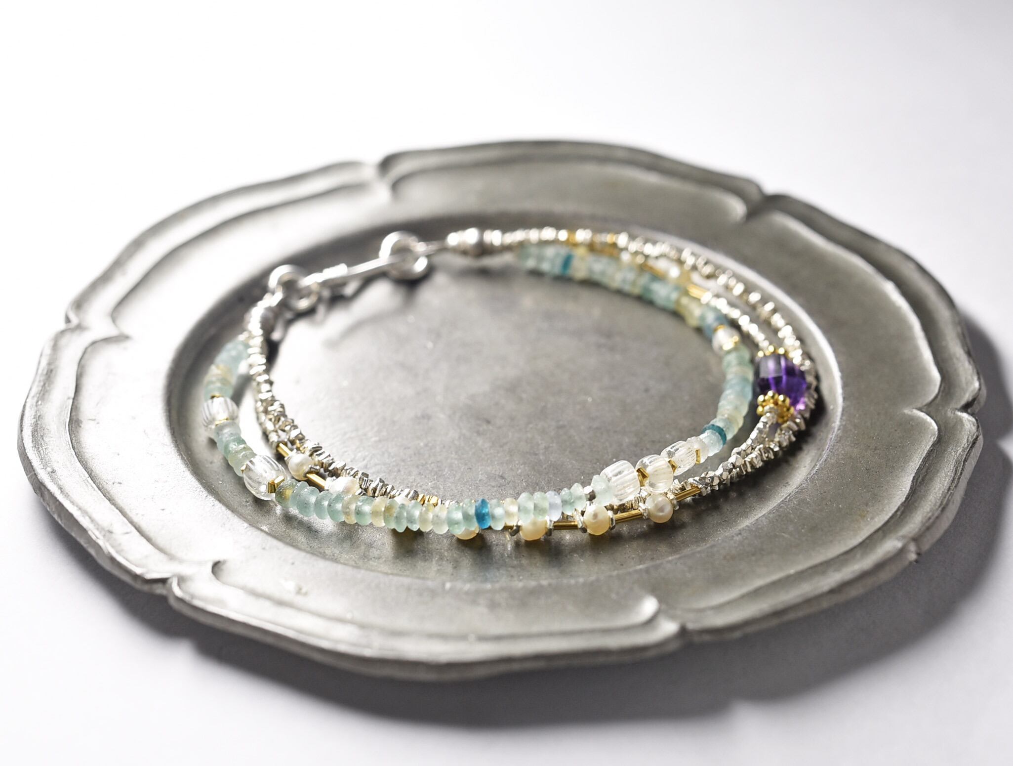 小さなローマングラスビーズとグーズベリー、淡水パール、ラフカットアメジスト、煌めくカレンシルバーを繋いだ3連のブレスです。
