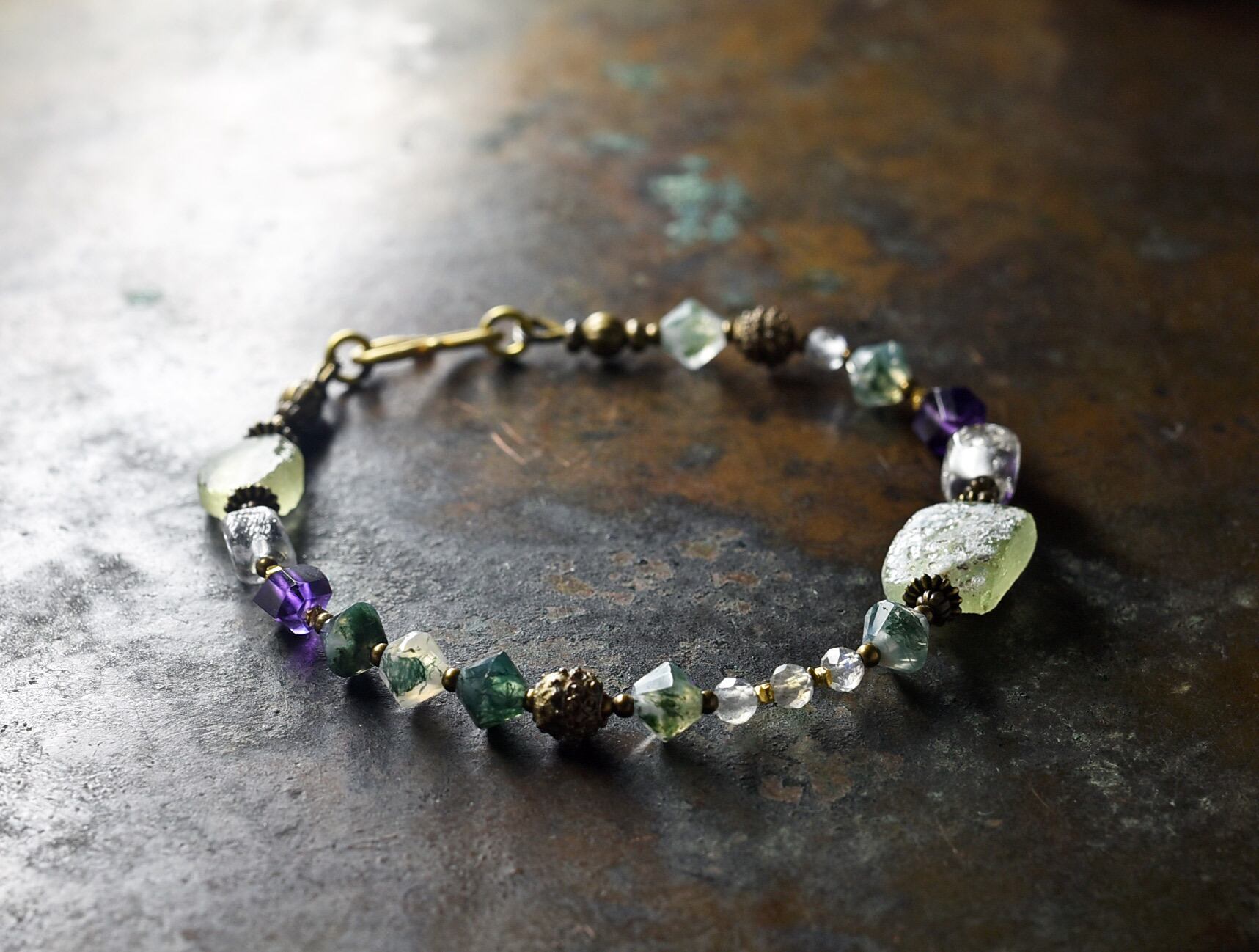 素材:ガラス、アメジスト、モスアゲート、ラブラドライト、真鍮、カレンシルバー、ワイヤー