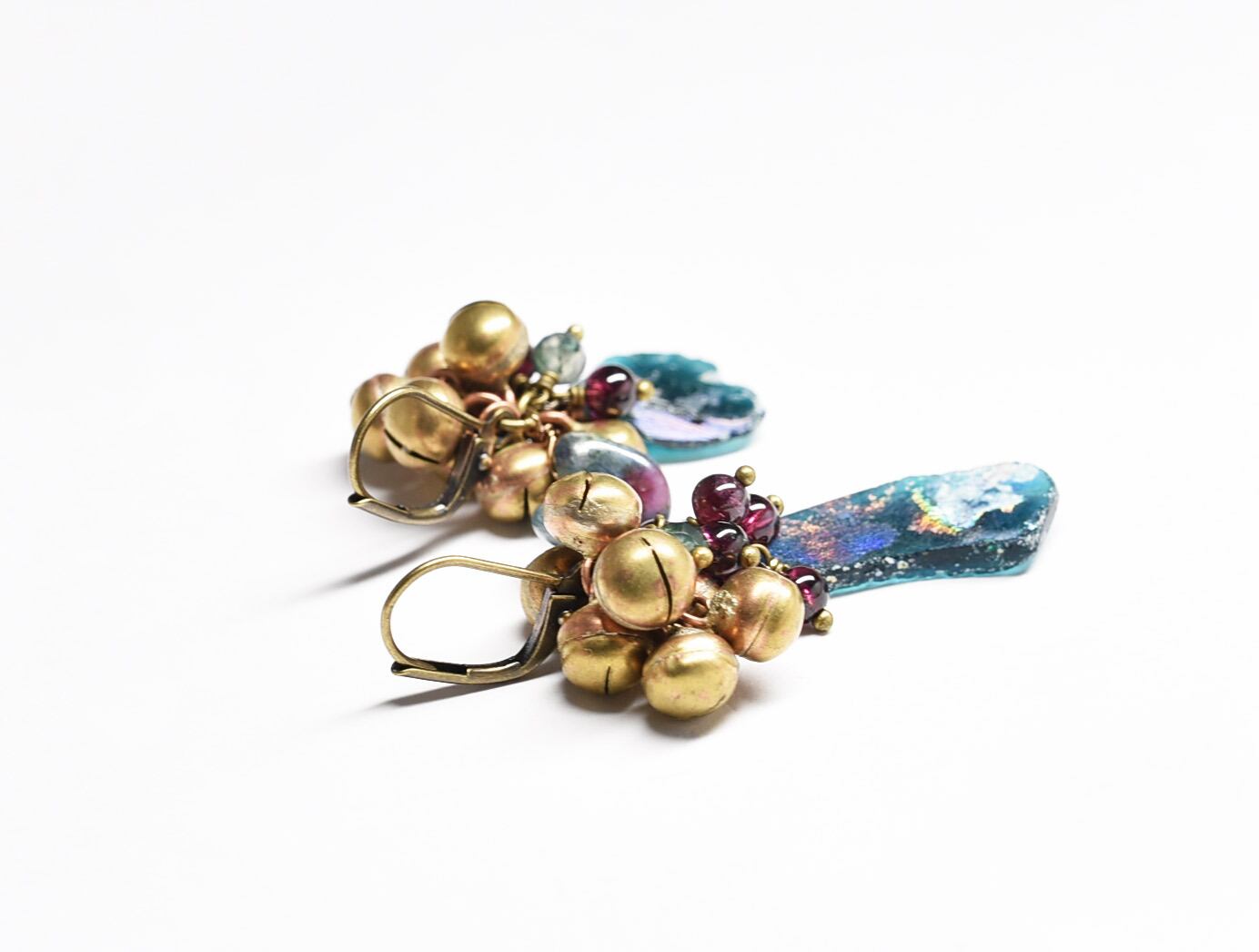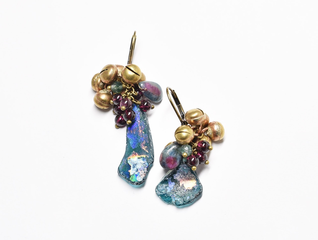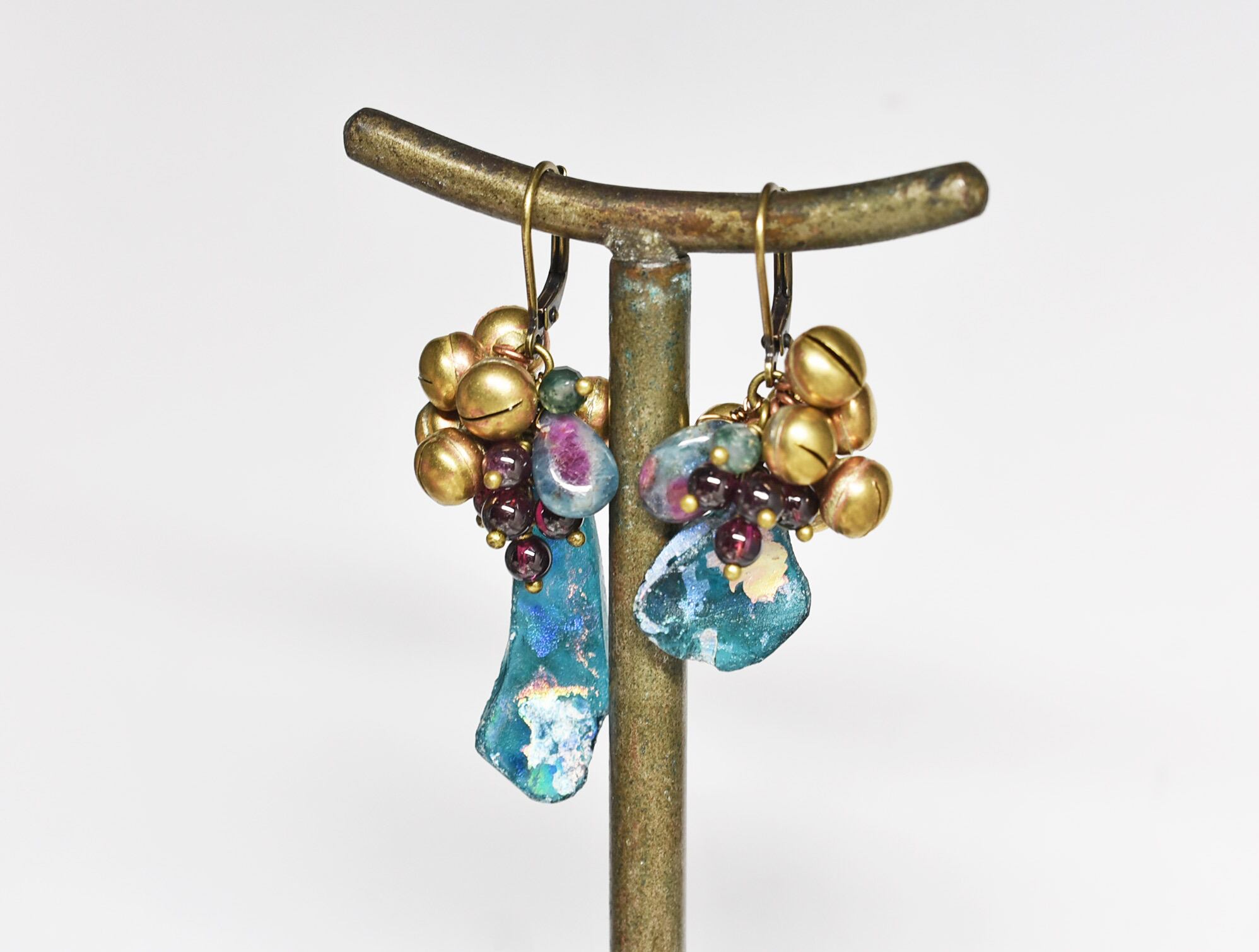 銀化したローマングラスと鈴、ガーネット、ルビーインゾイサイト、モスアゲートを繋いだピアスです。