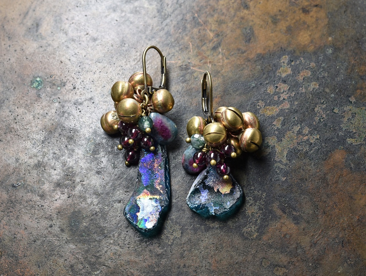 銀化ローマングラスとたわわな鈴とガーネット、ルビーインゾイサイト、モスアゲートのピアス