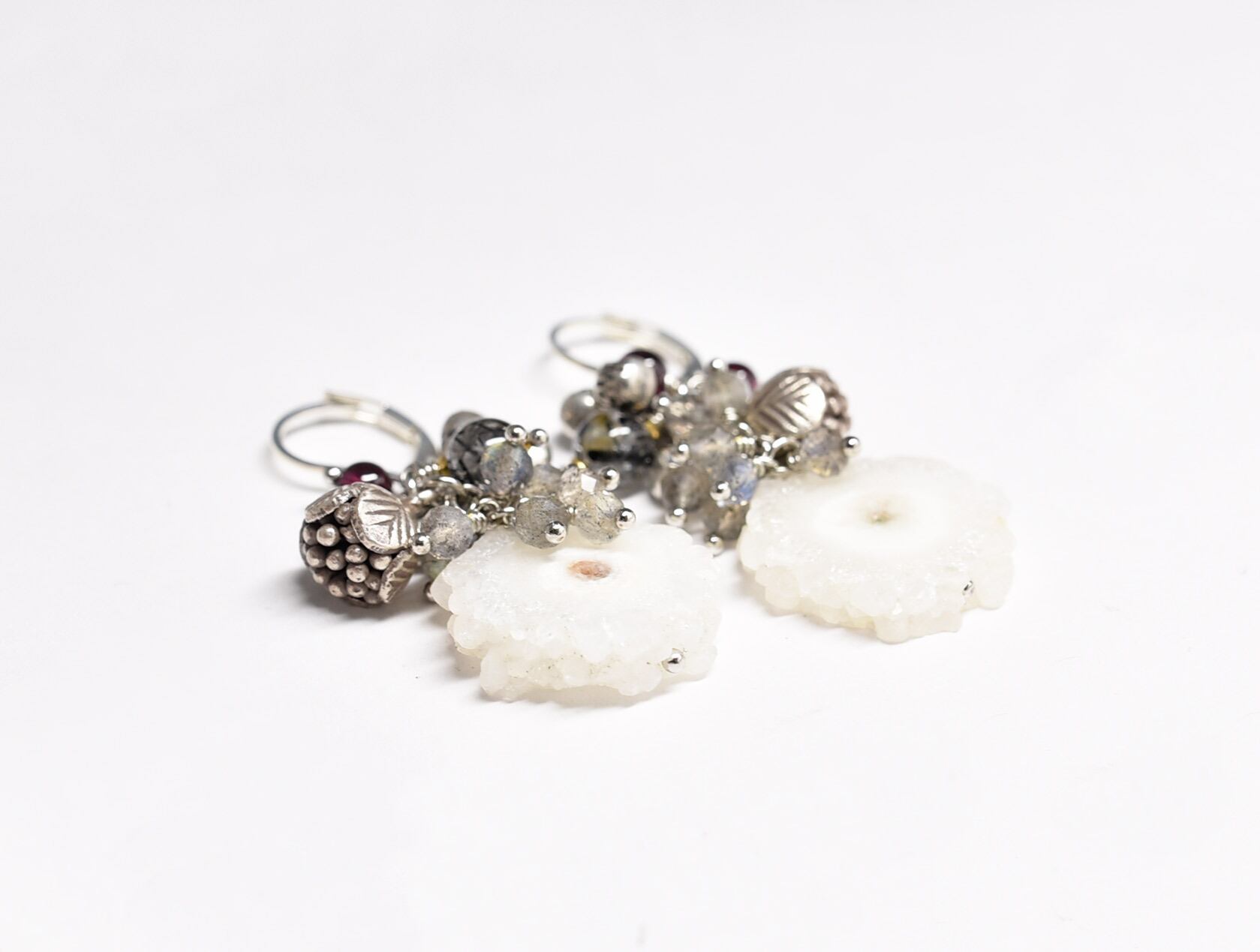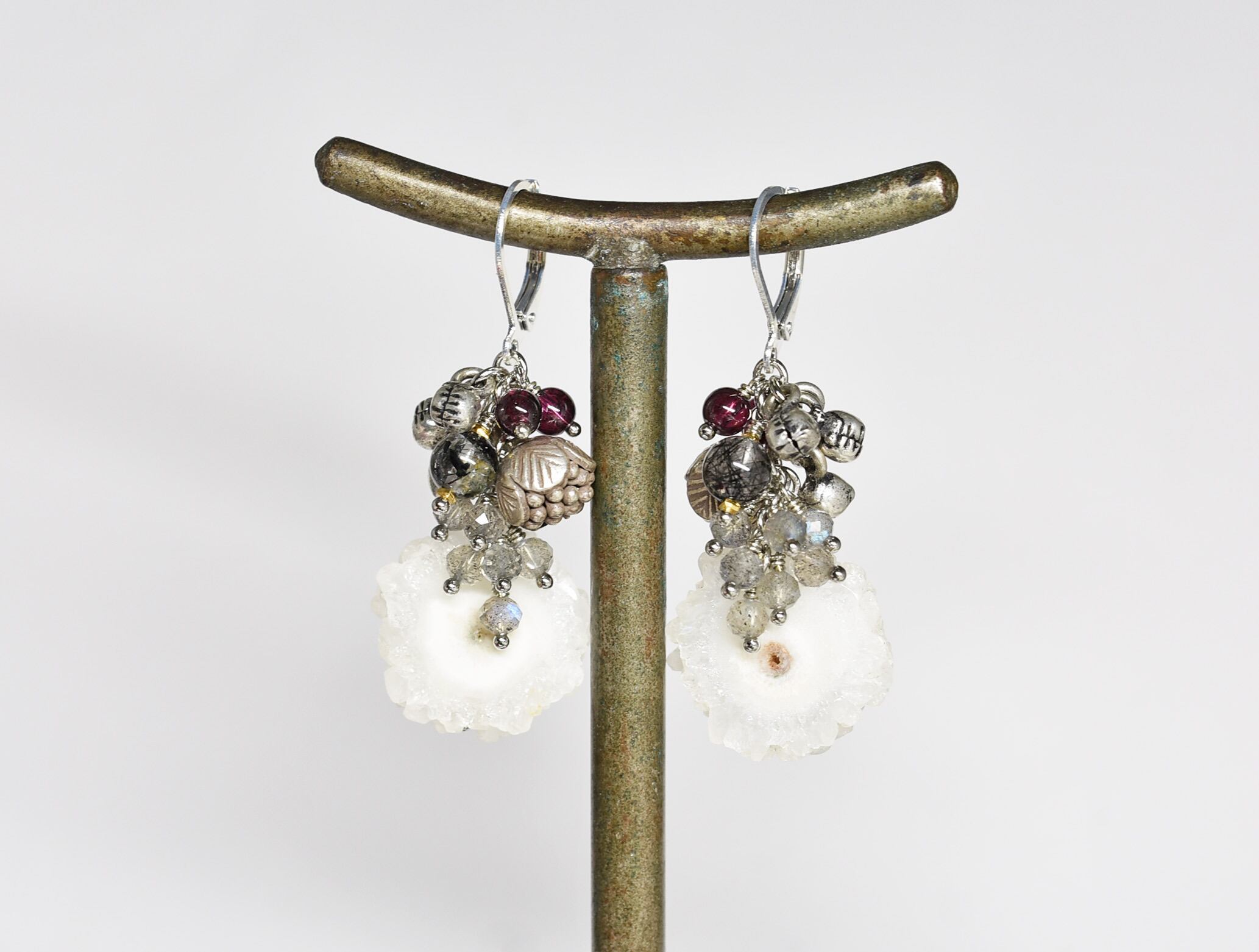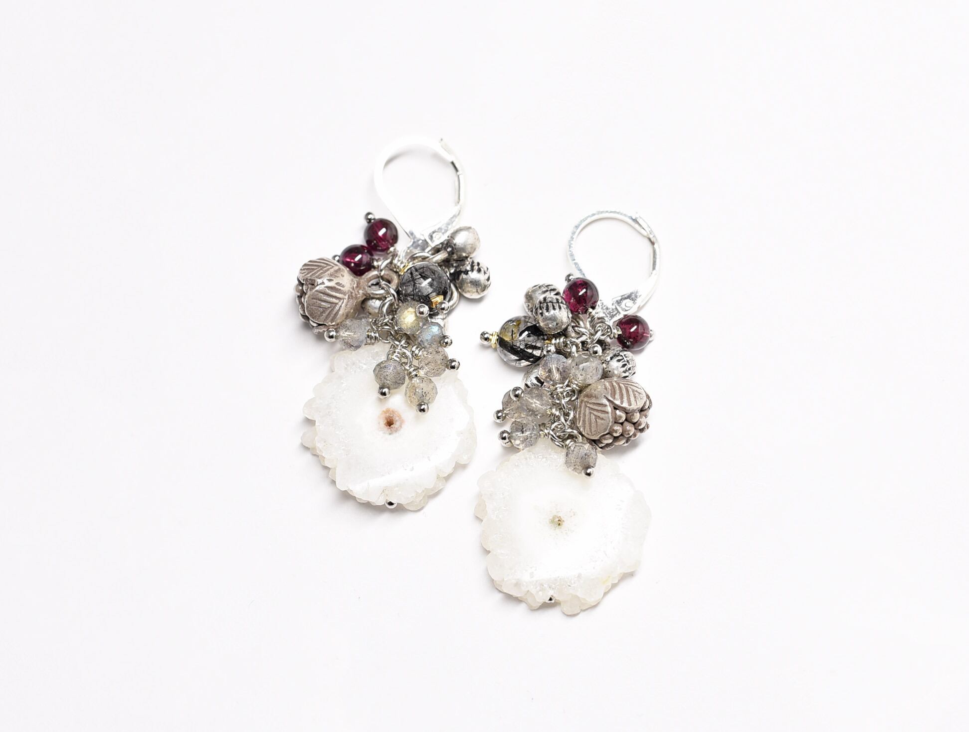 ソーラークォーツとたわわなラブラドライト、ブラックルチル、ガーネットとコロンとしたカレンシルバー、鈴のピアス