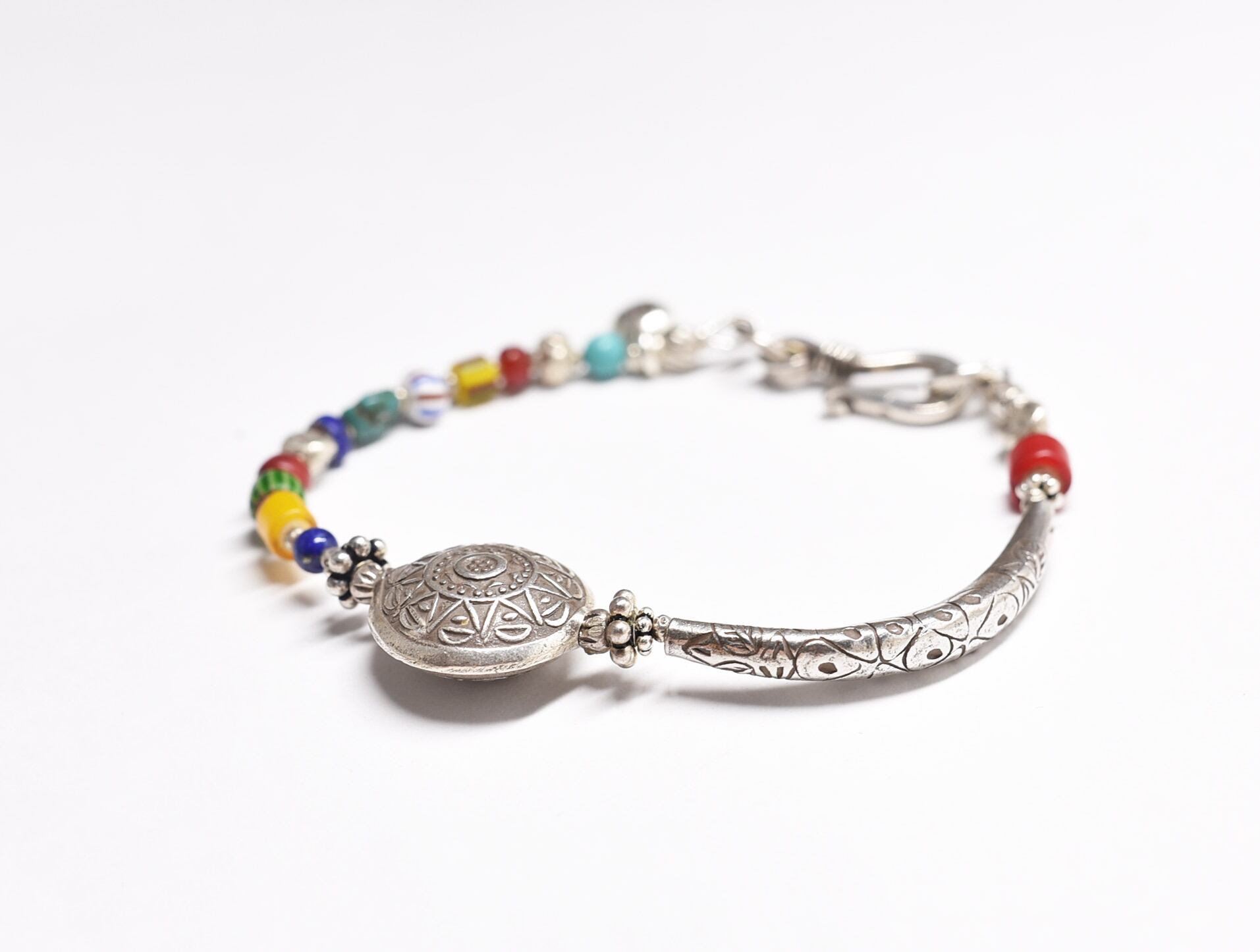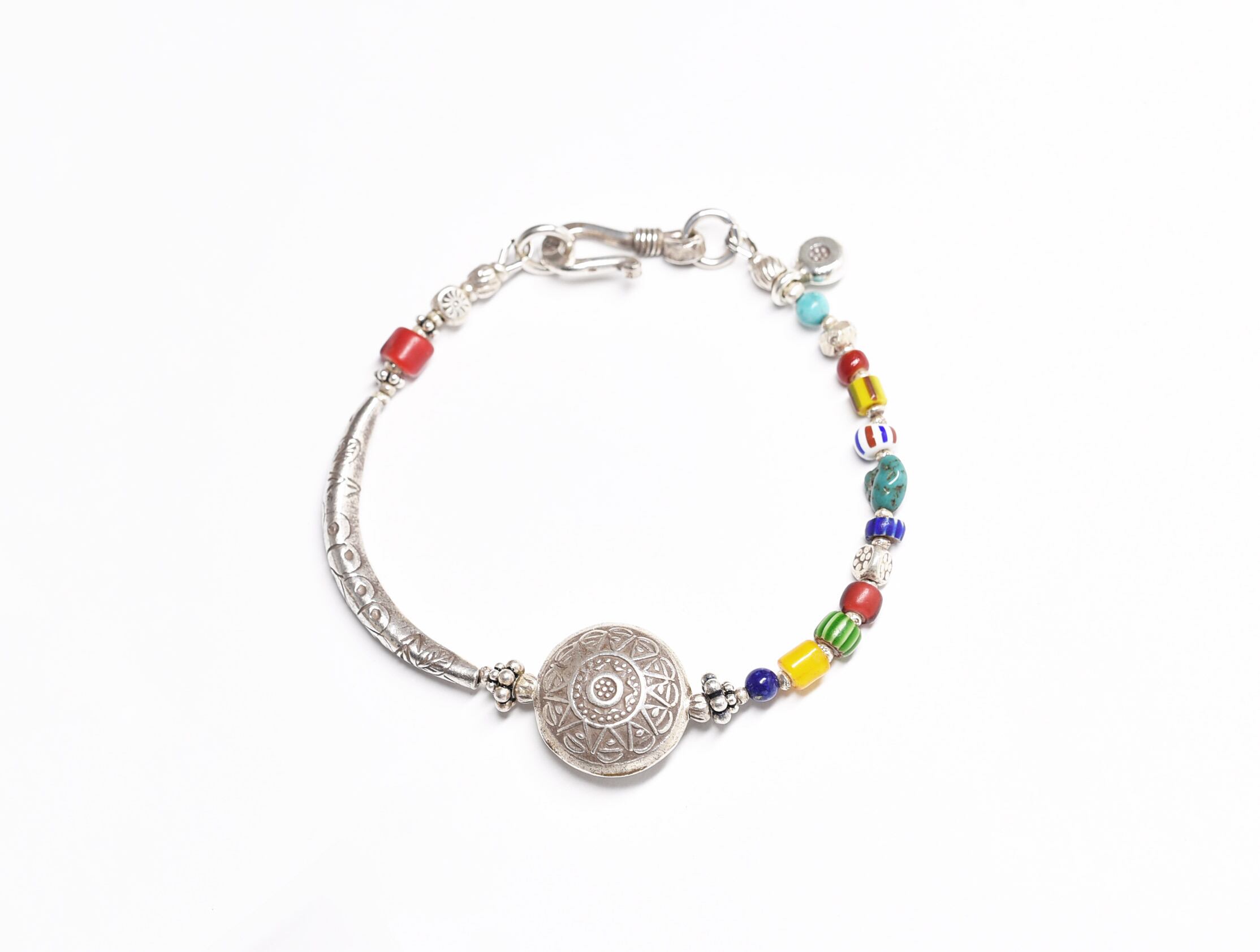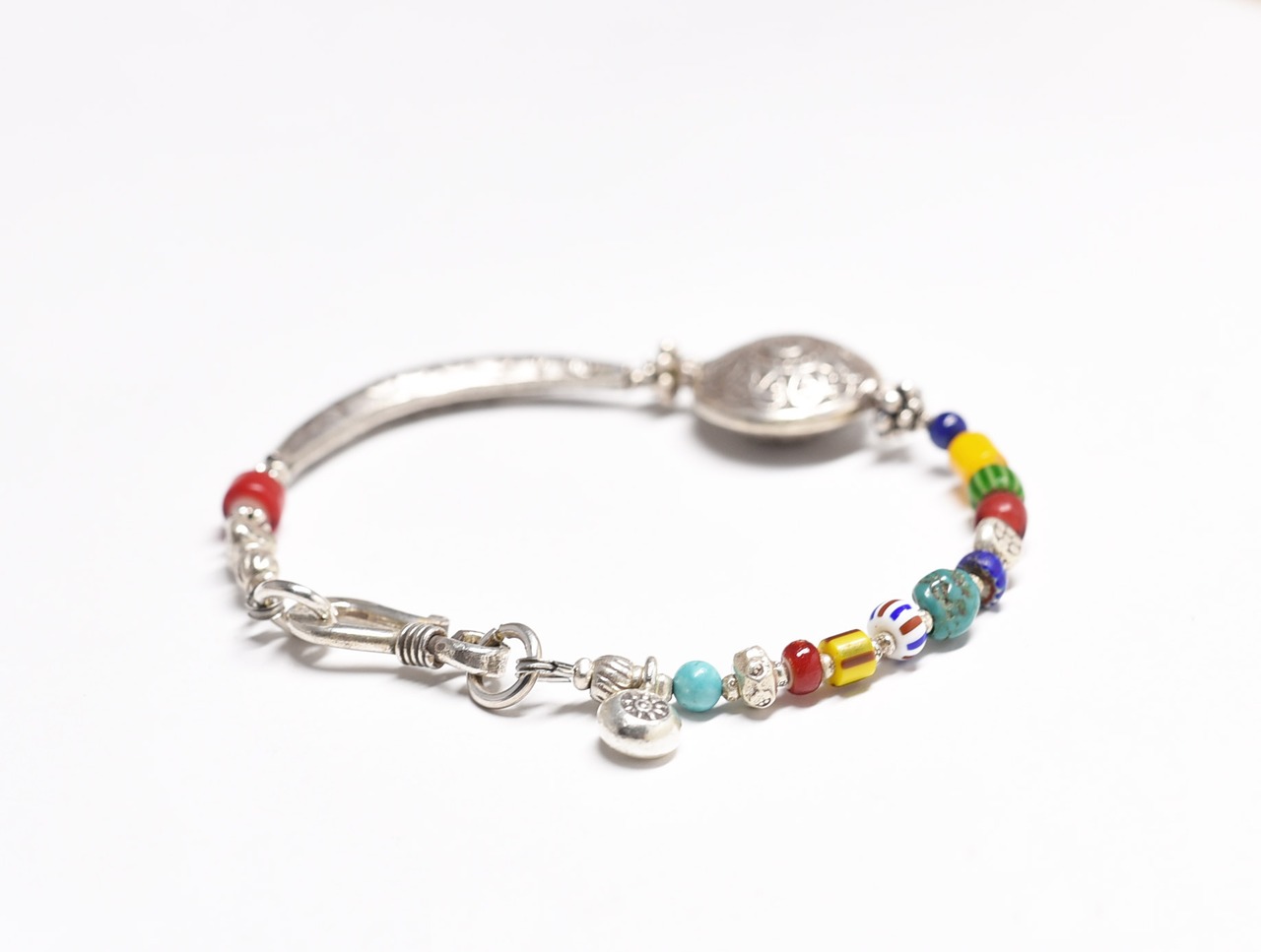 魔法陣のようなカレンシルバーをトップに湾曲カレンシルバー、色んなベネチア産のアンティークビーズや天然石、カレンシルバービーズをミックスした賑やかなブレスです。