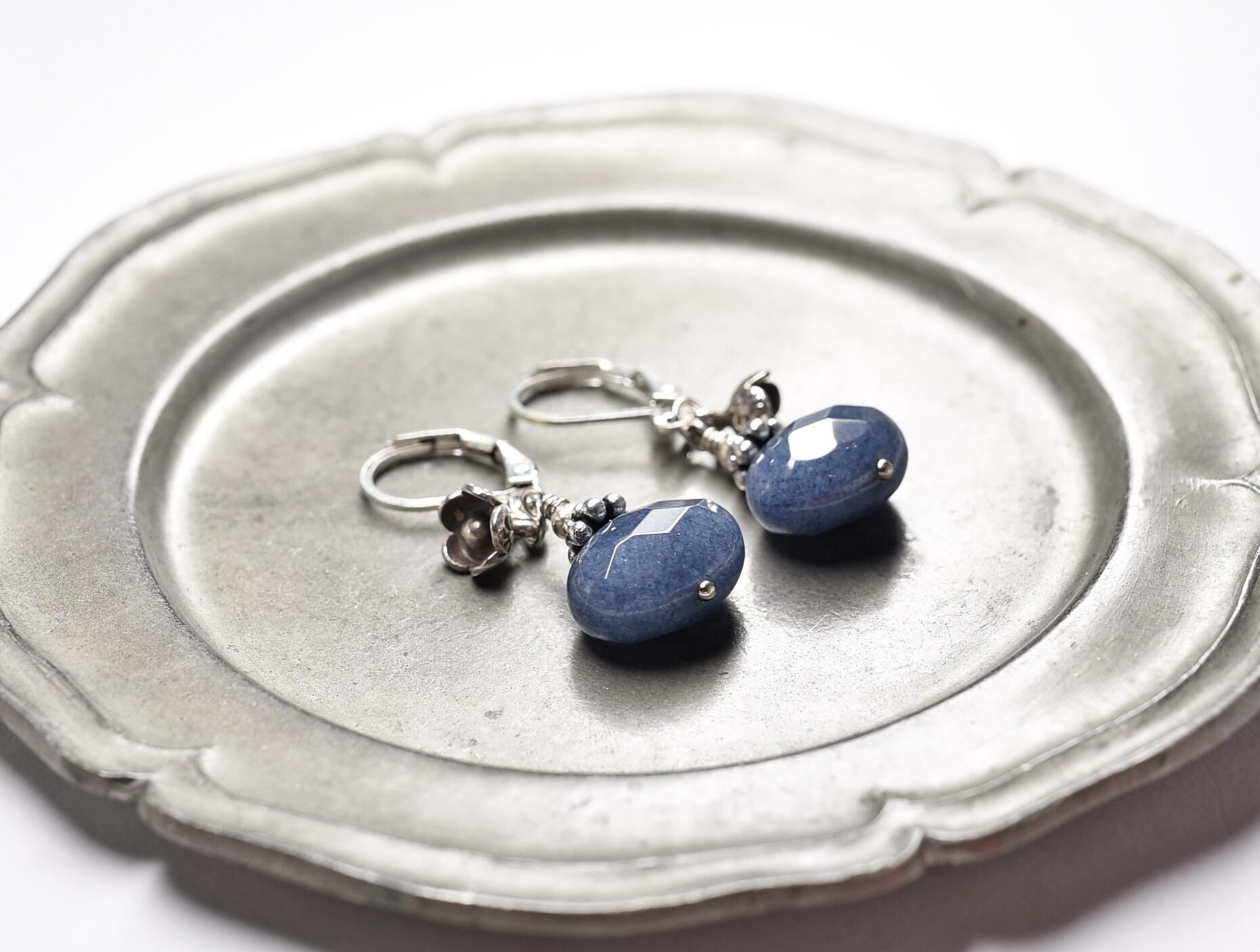 サファイアアゲートと小さなカレンシルバーのお花を繋いだ小さめなピアスです。
