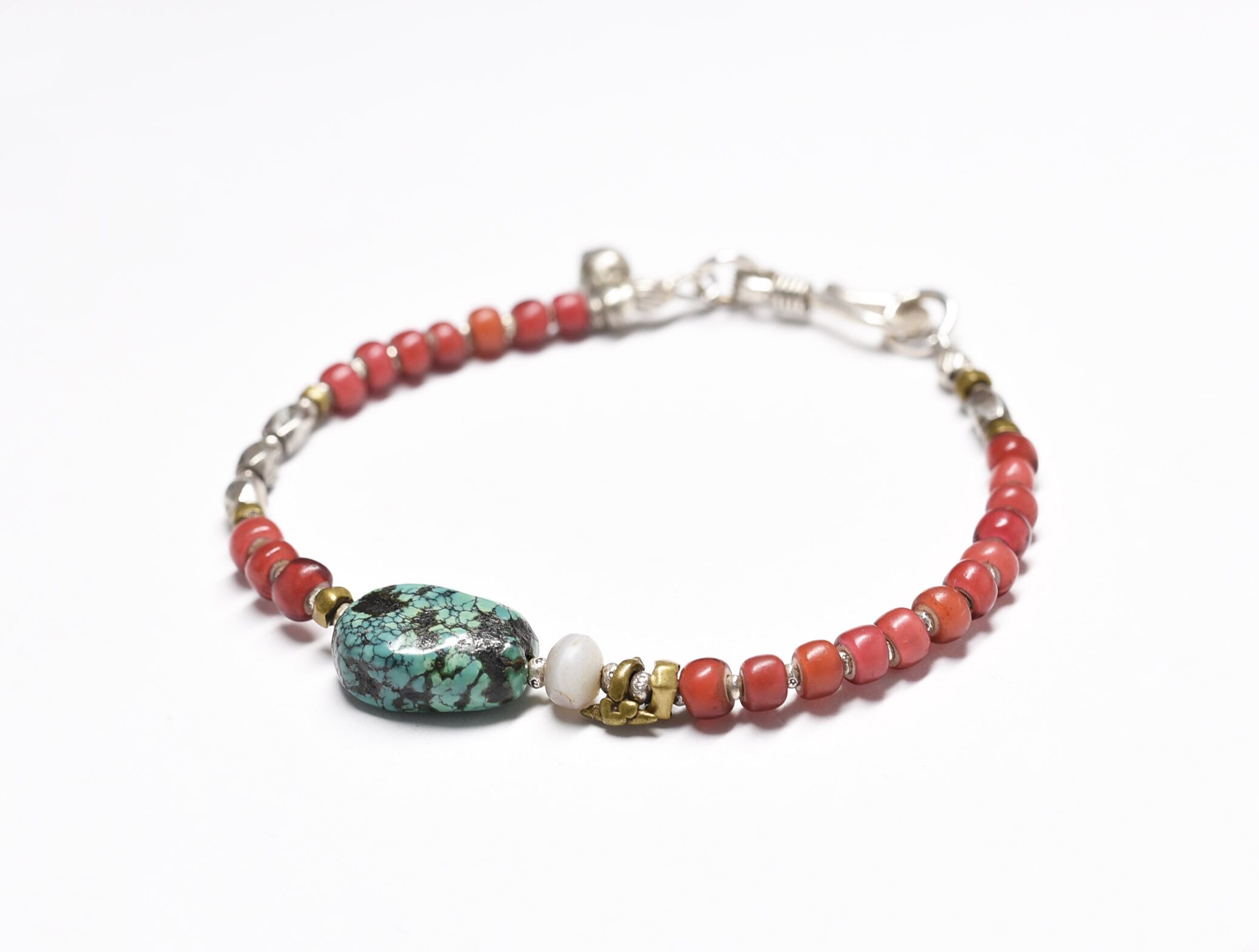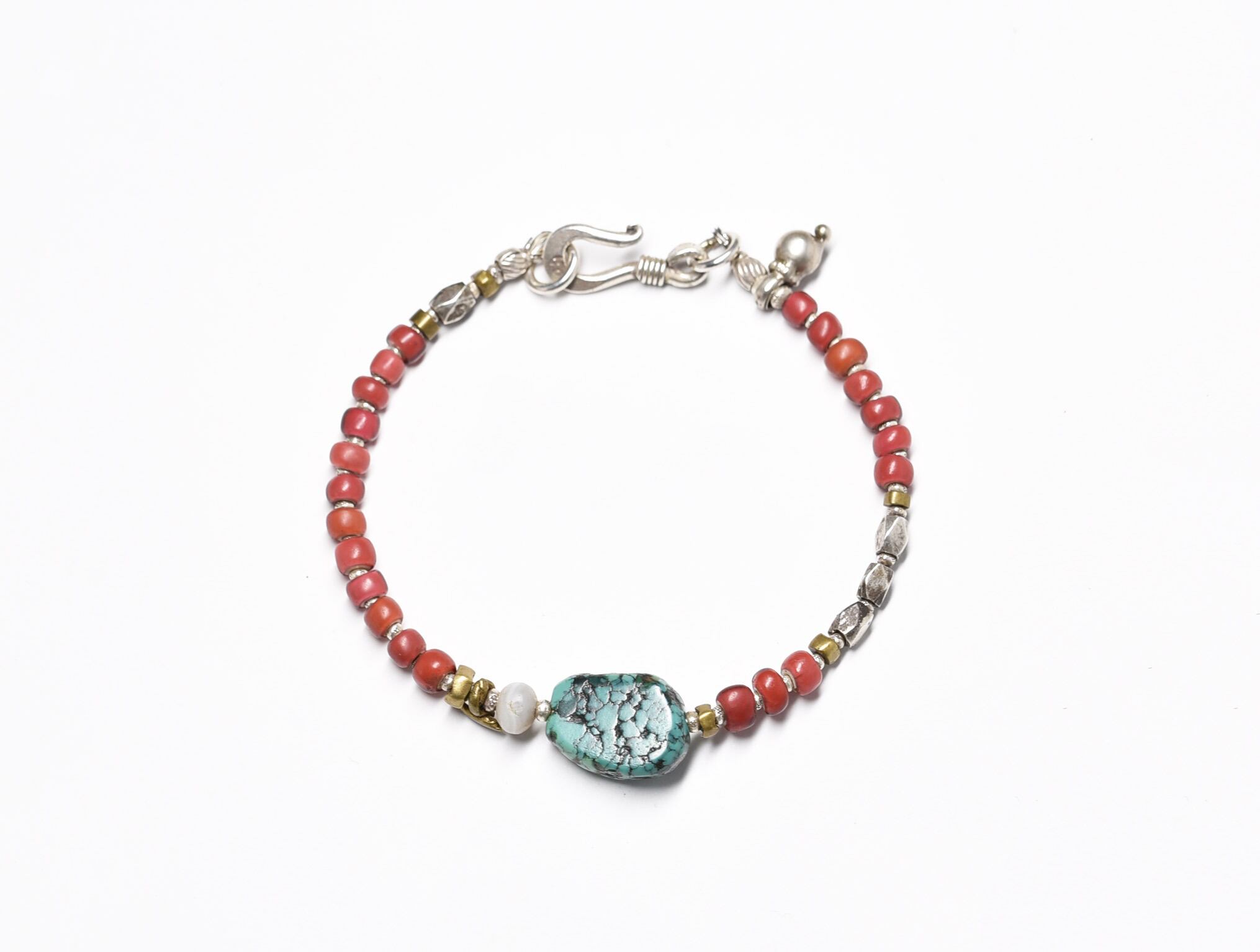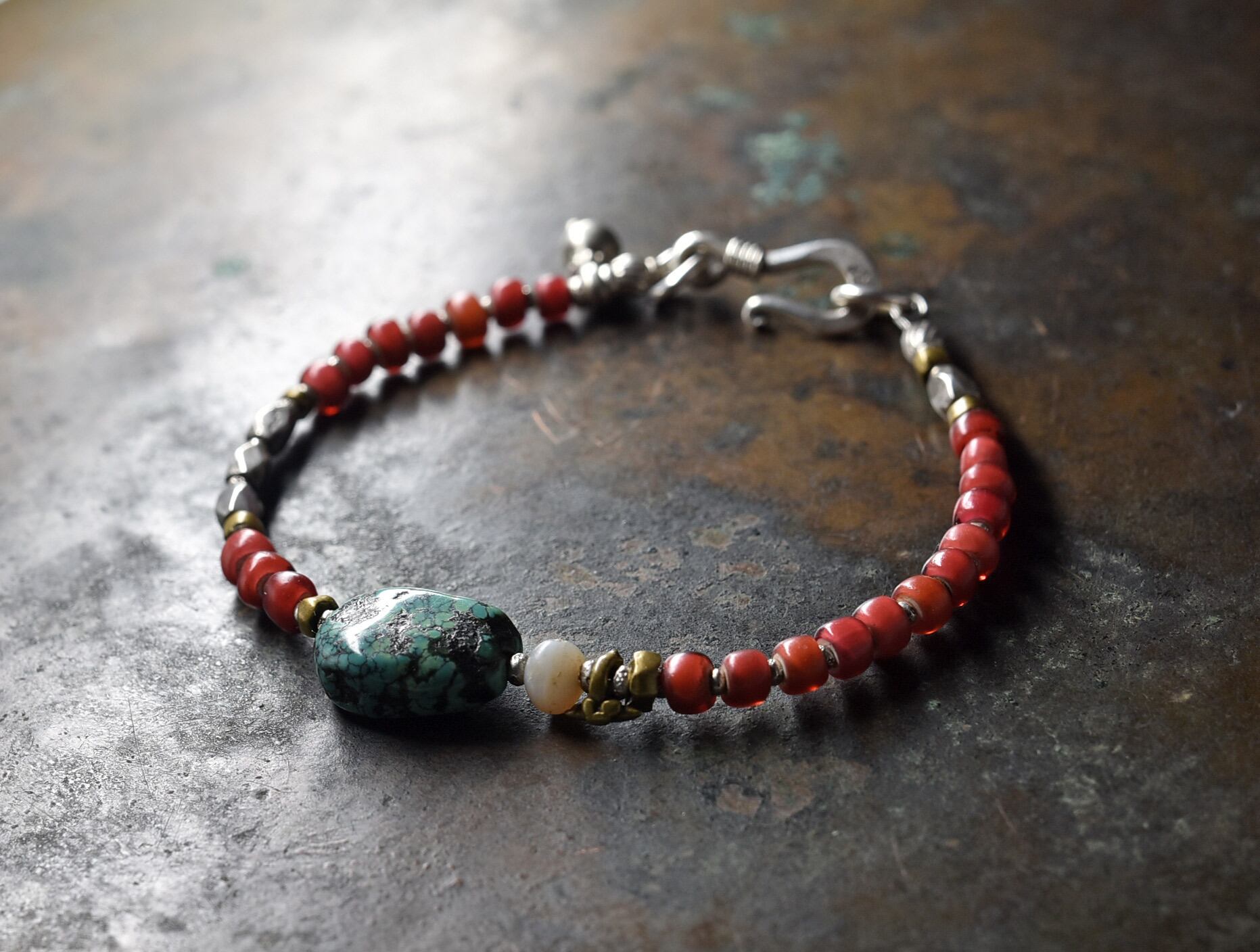 oldチベタンターコイズと古代瑪瑙、oldチンシルバー、金赤ホワイトハーツ、oldオリッサブラスのブレス