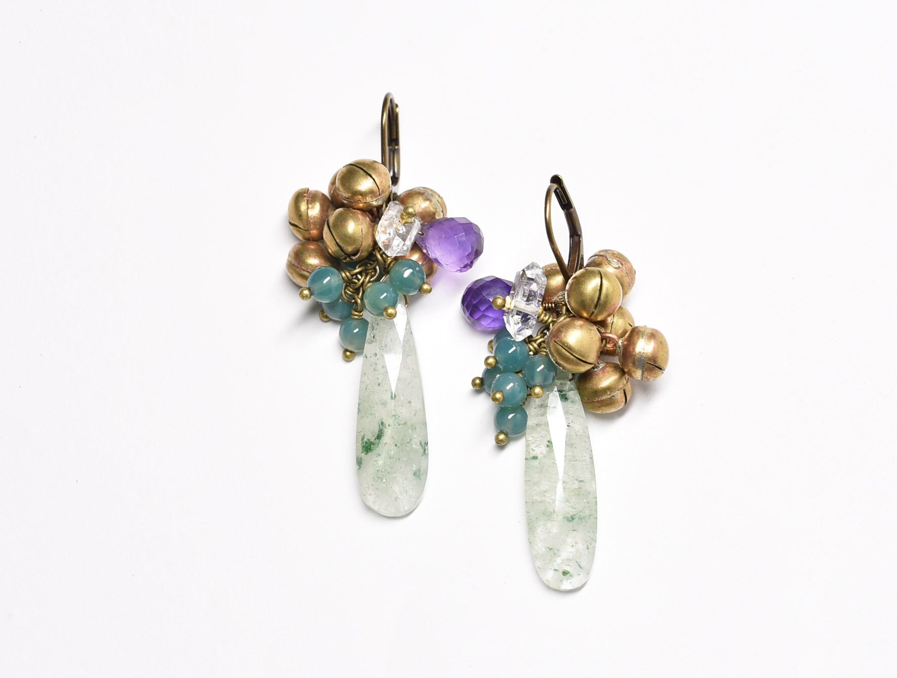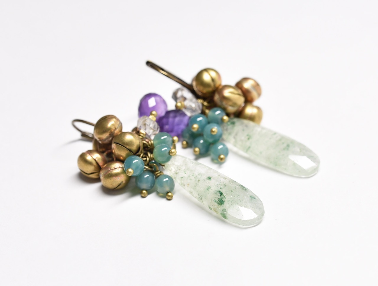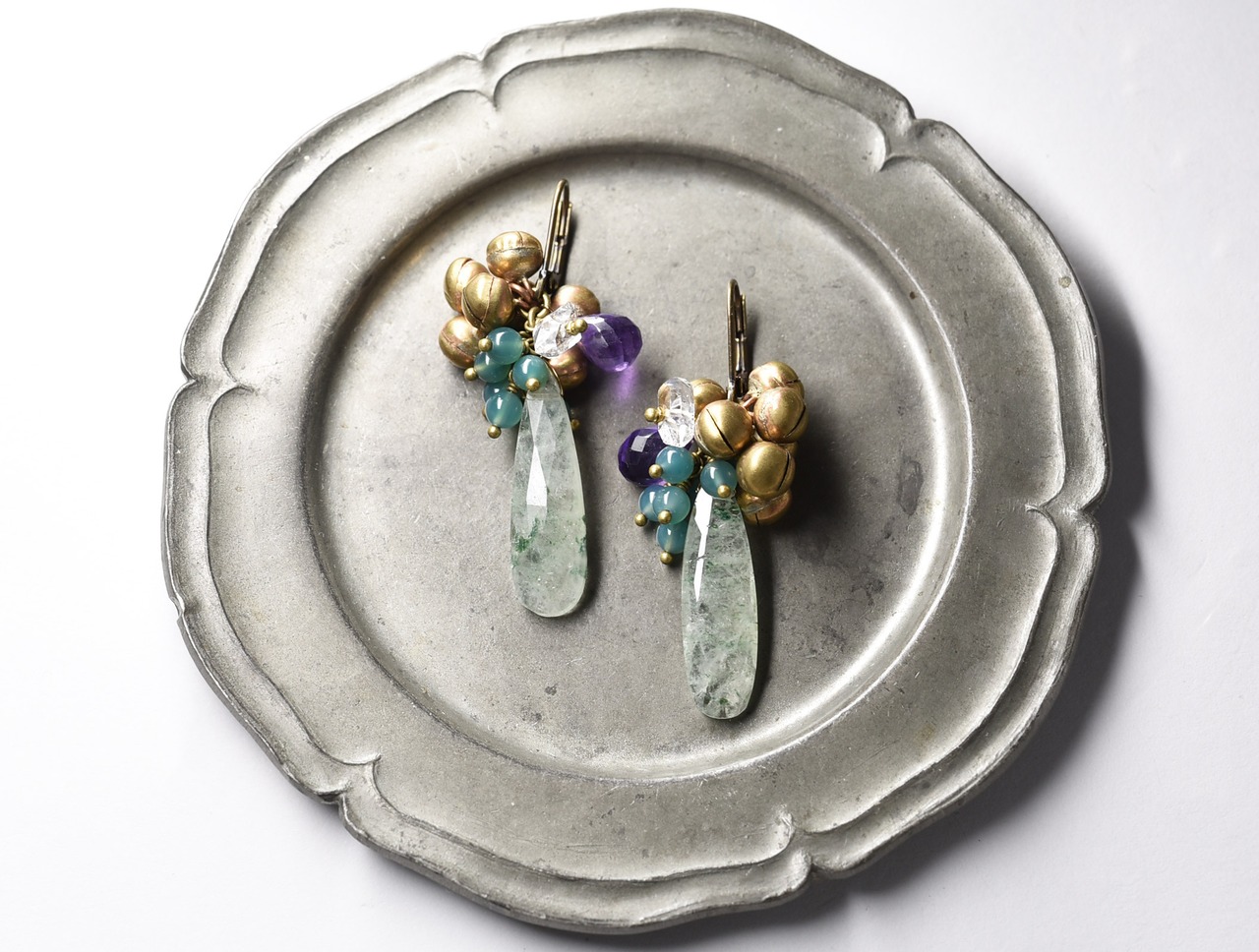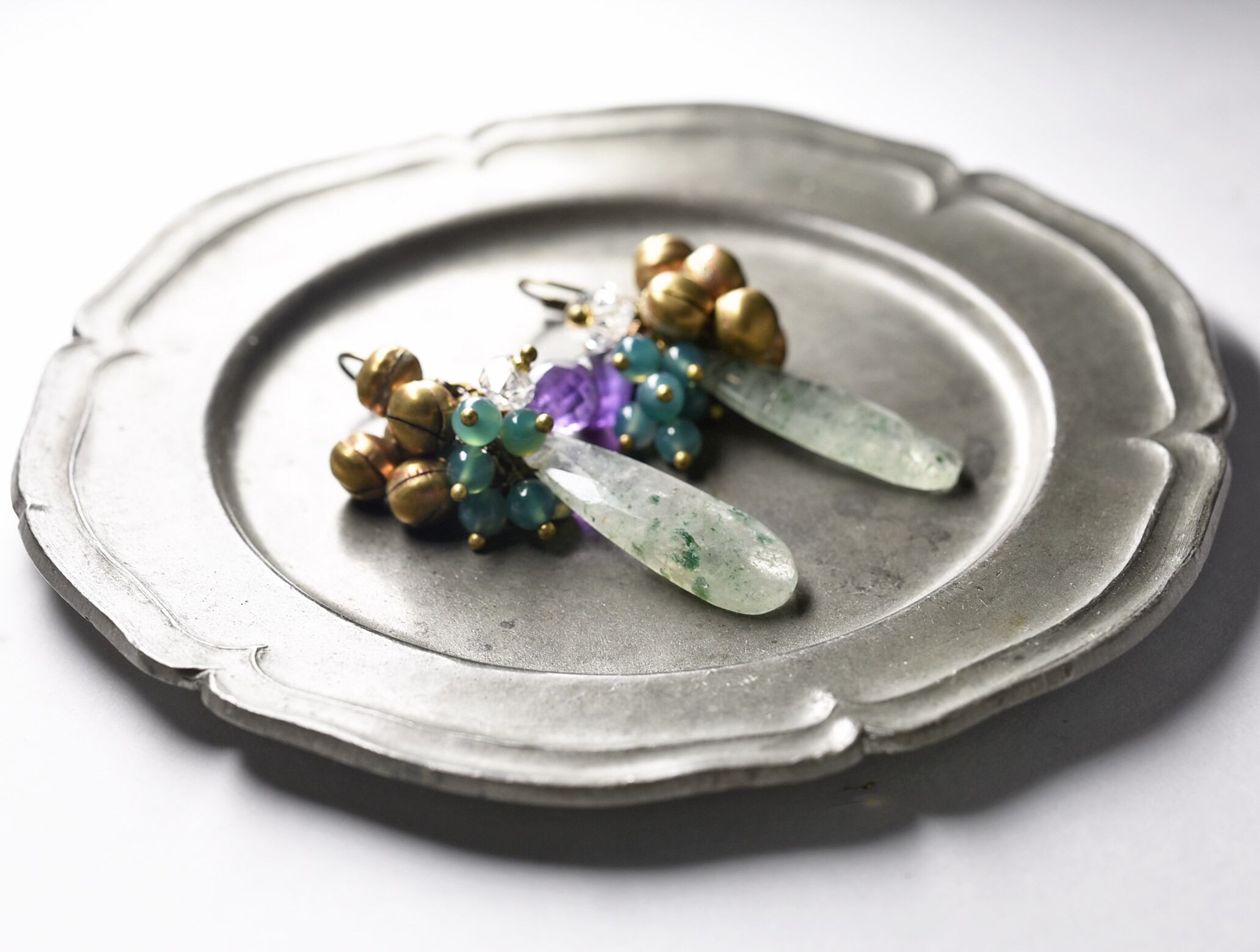 クリソコーラインクォーツ、たわわな鈴とグリーン瑪瑙、アメジストとハーキマーダイヤモンドを繋いだピアスです。