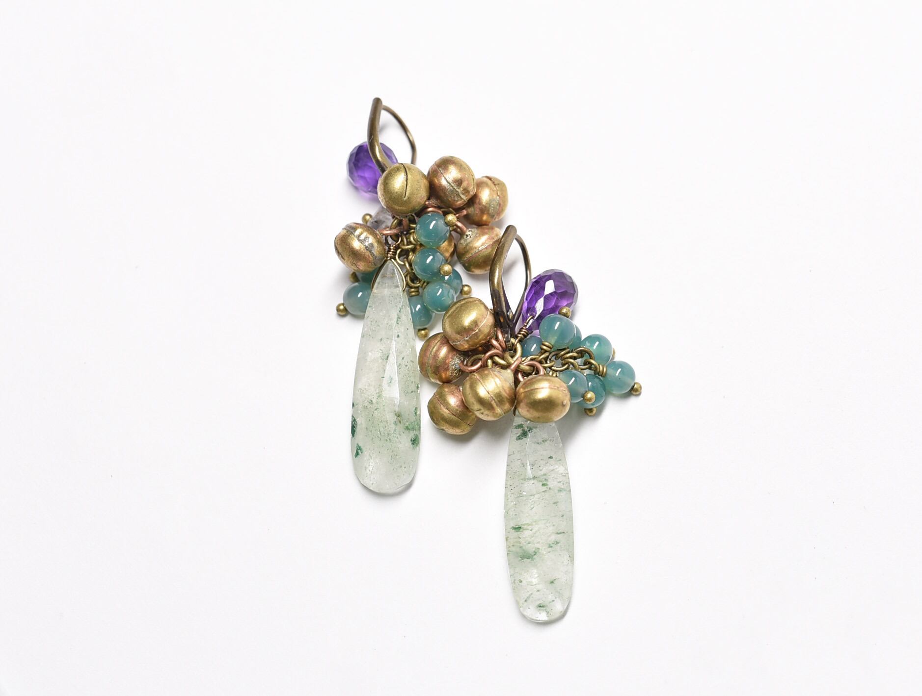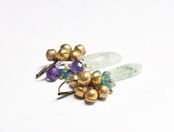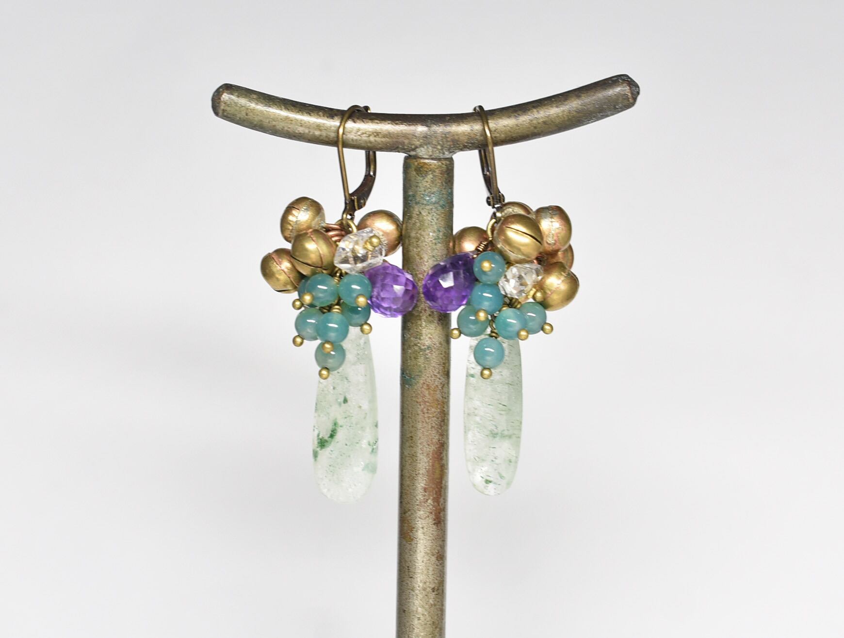 クリソコーラインクォーツ、たわわな鈴とグリーン瑪瑙、アメジストとハーキマーダイヤモンドのピアス(濃)
