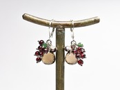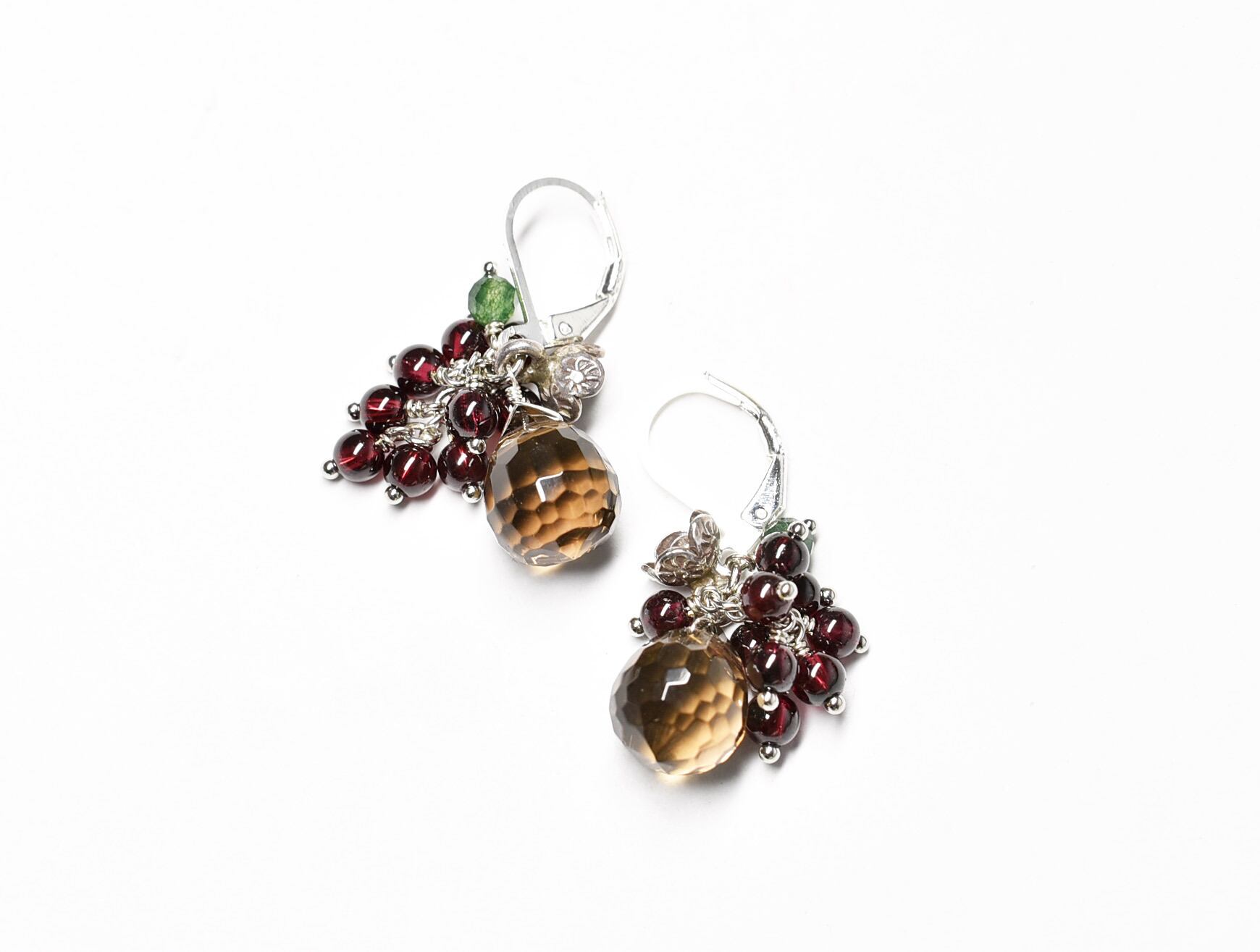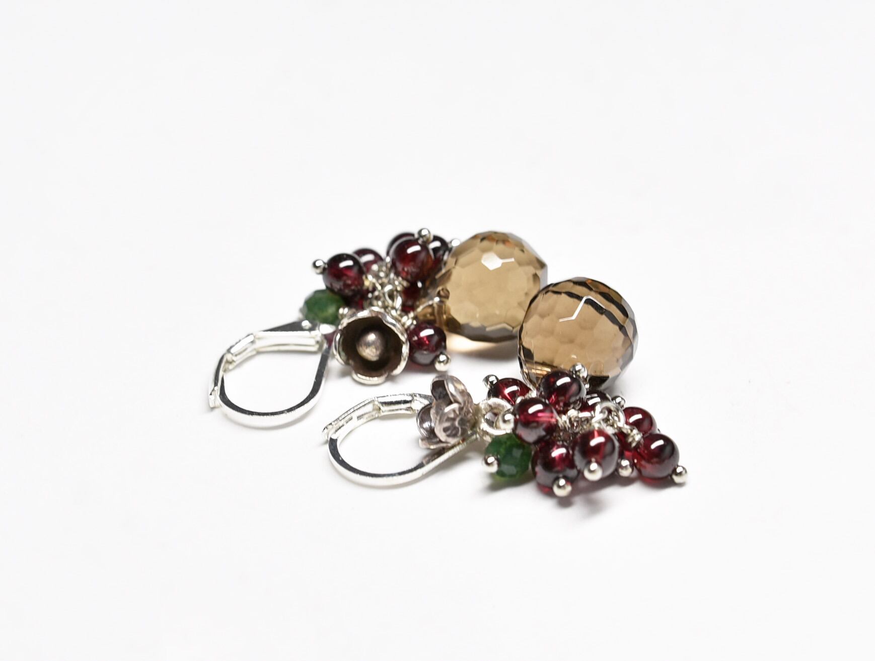 雫スモーキークォーツとたわわなガーネット、モスアゲート、カレンシルバーの小さなお花を繋いだピアスです。