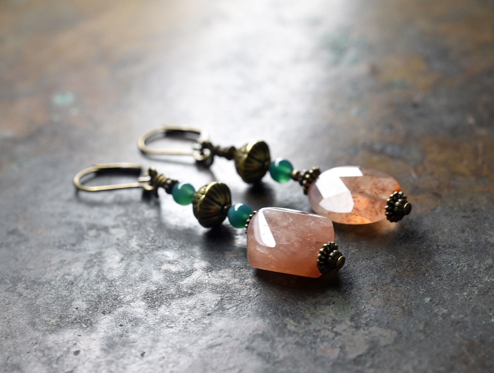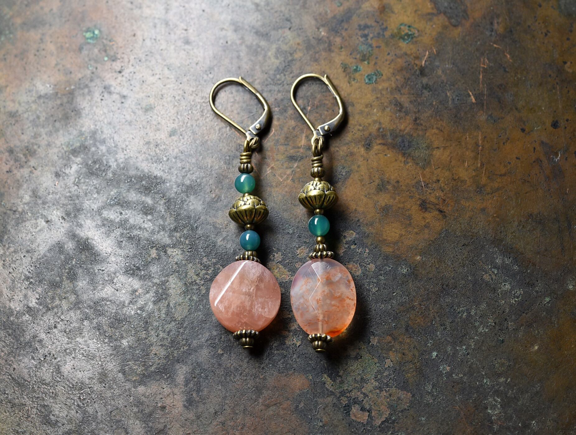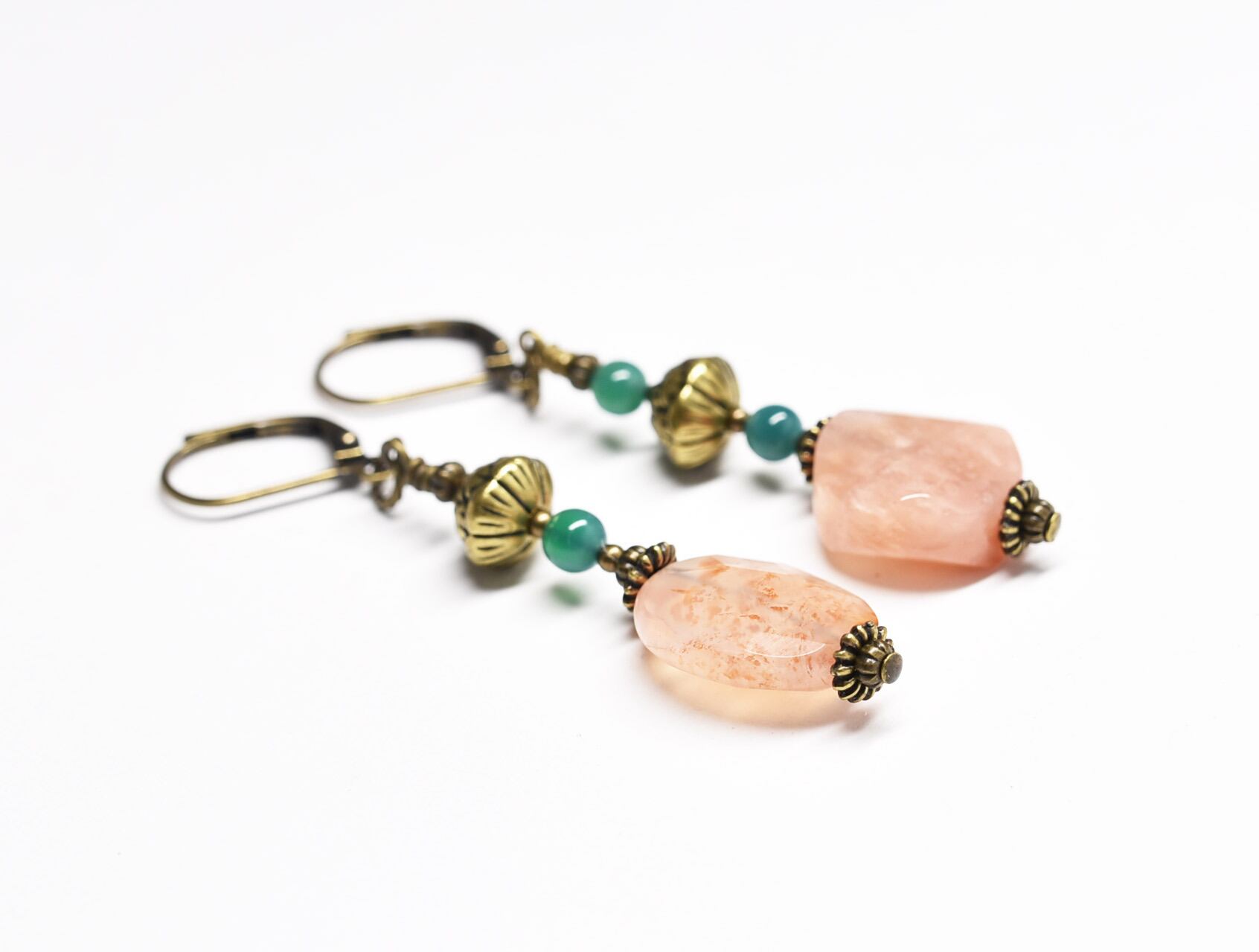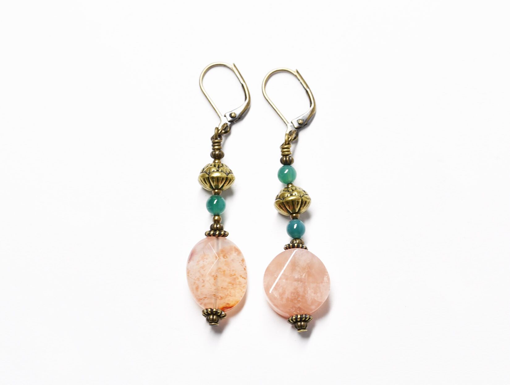 東雲色カーネリアンとグリーン瑪瑙、蓮華ブラスを繋いだアンシメトリーなピアスです。