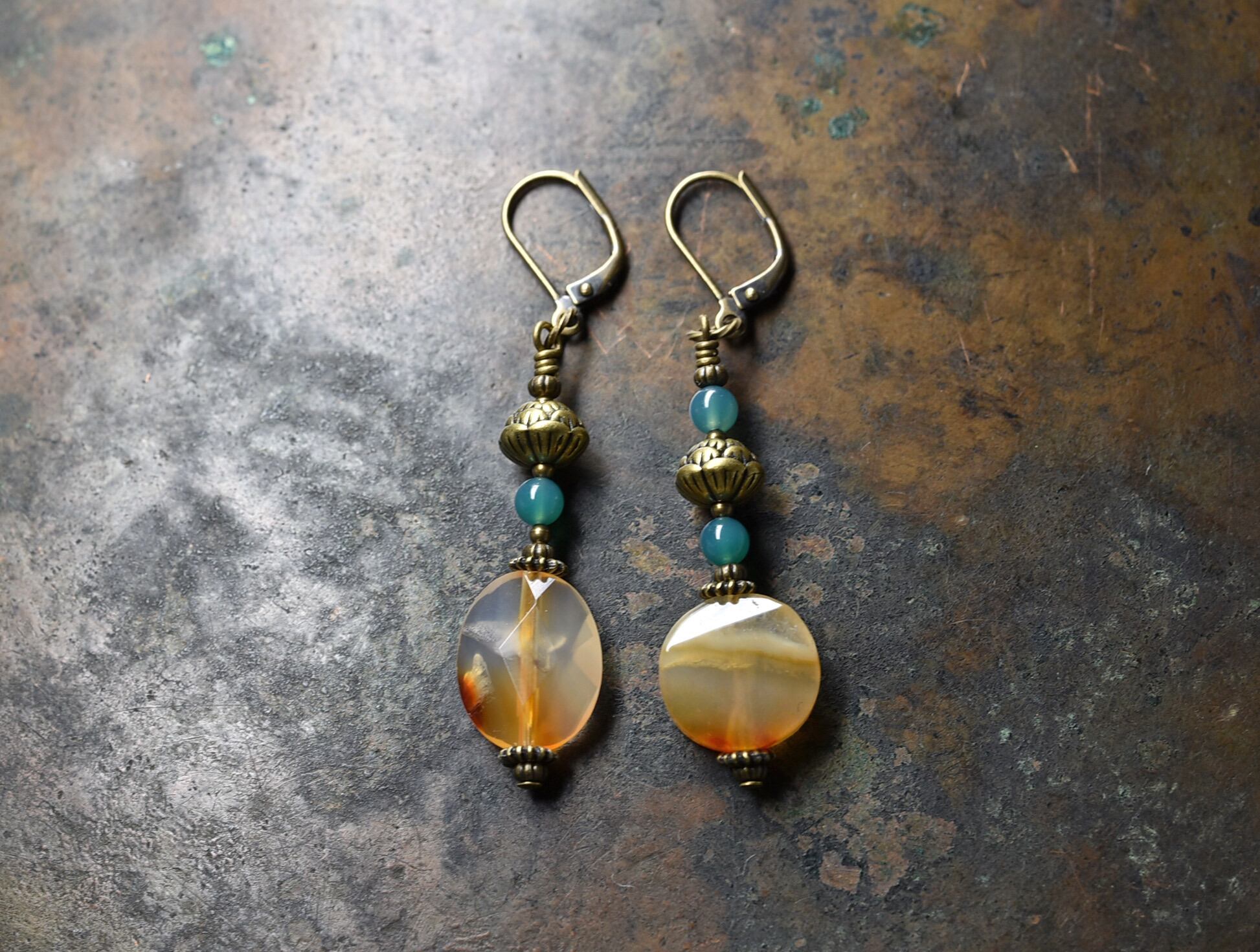 金茶色カーネリアンとグリーン瑪瑙、蓮華ブラスを繋いだアンシメトリーなピアスです。