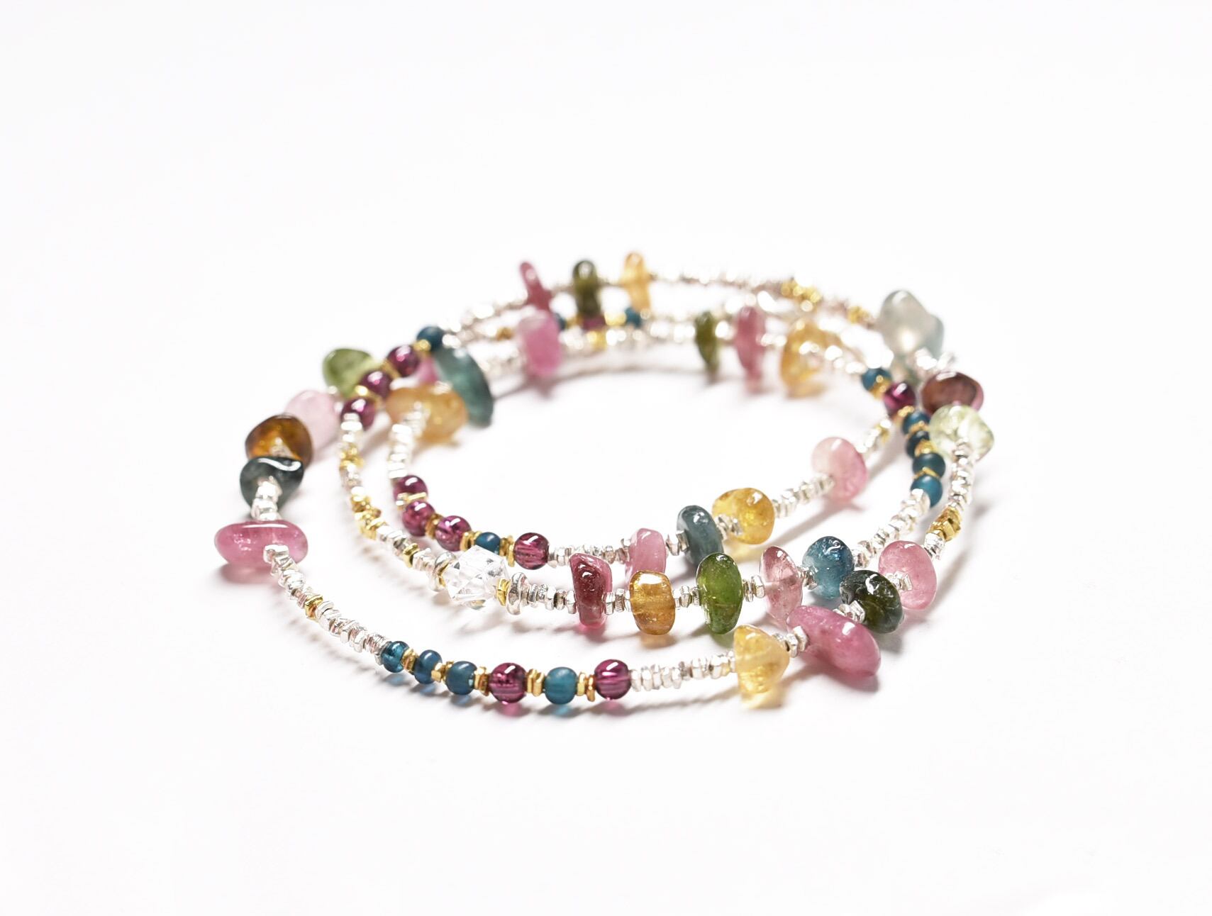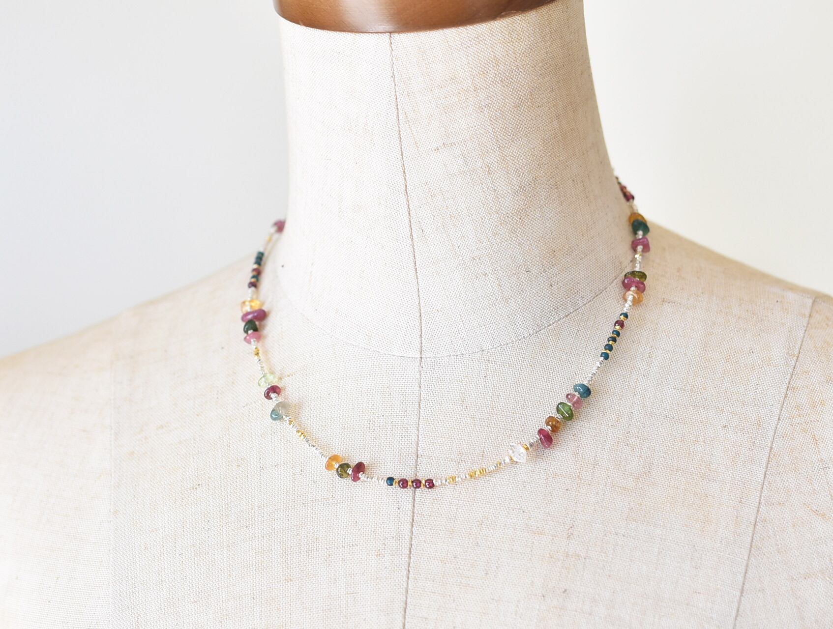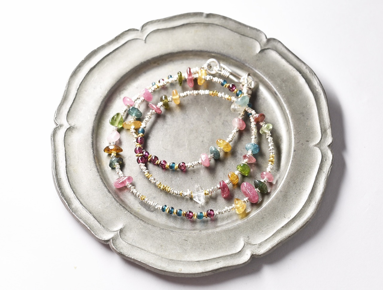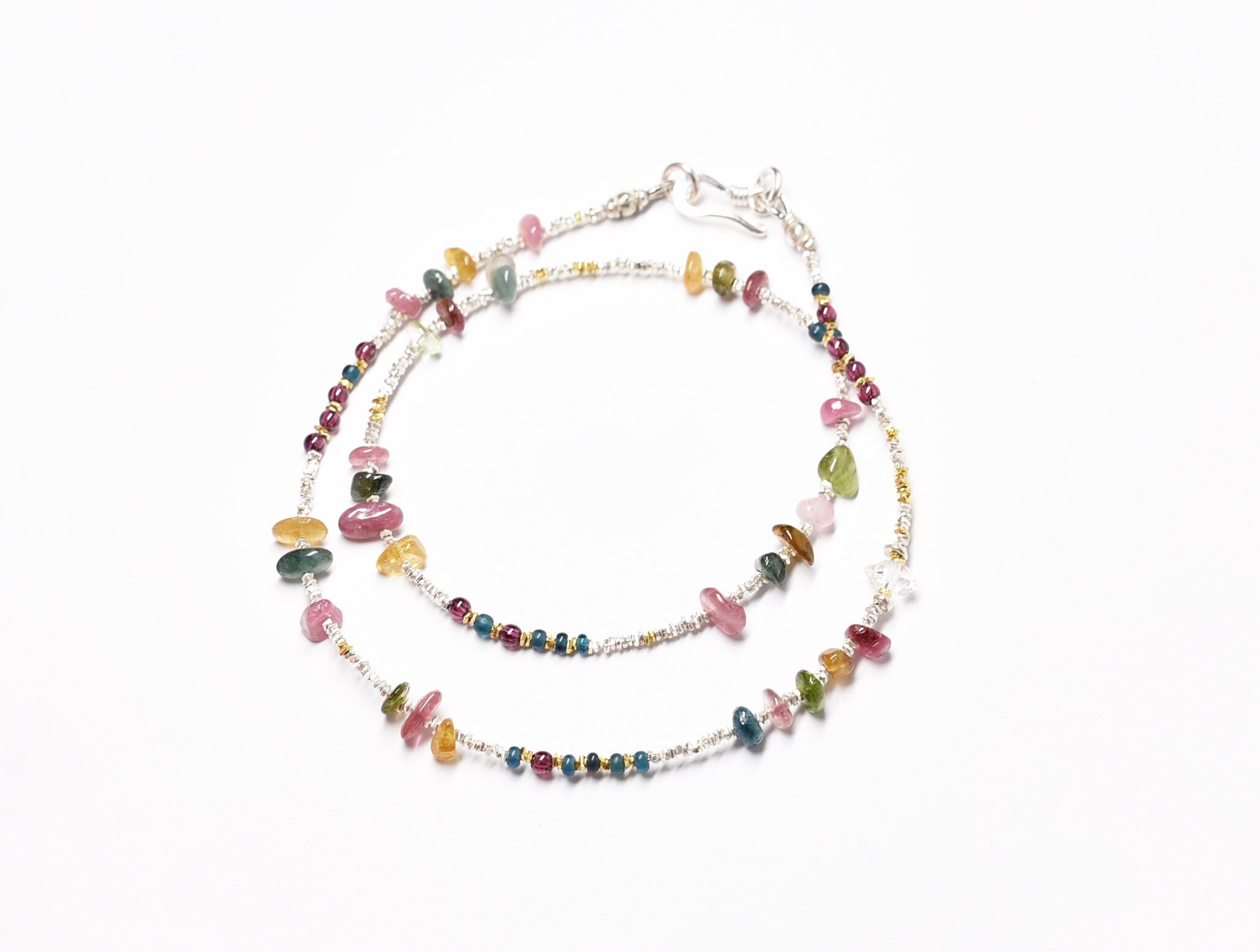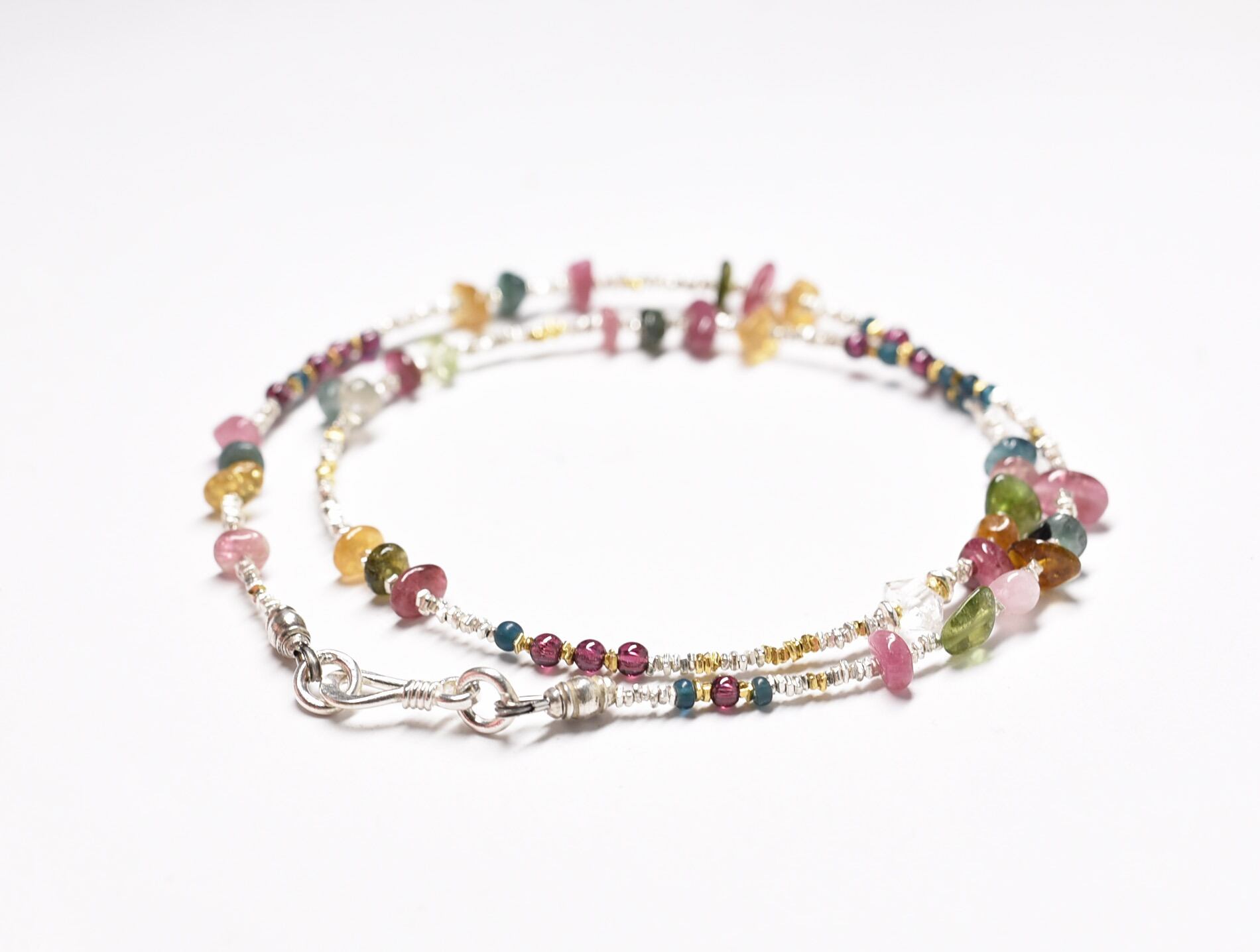 ハーキマーダイヤモンドとトルマリンとガーネット、インディゴブルービーズとカレンシルバーの華奢なネックレス