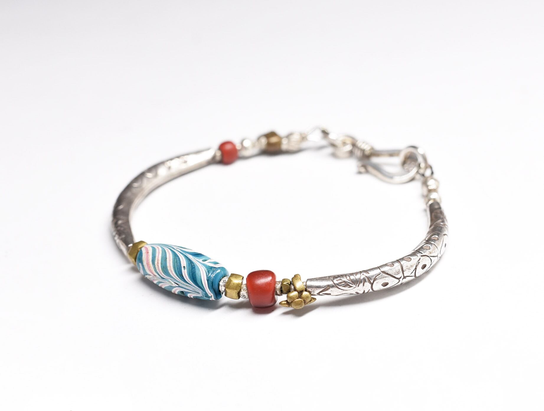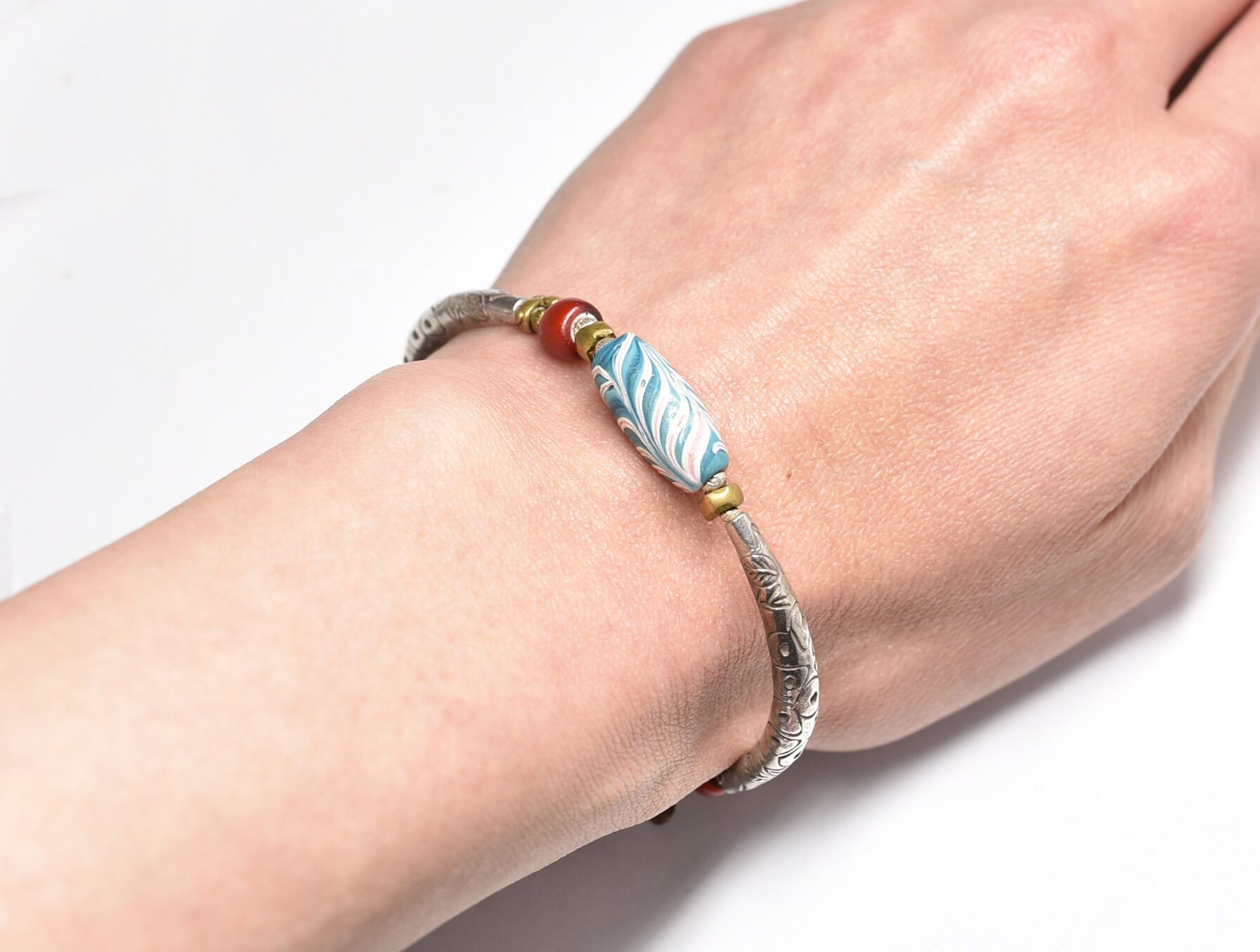 ターコイズブルーフェザービーズと金赤ホワイトハーツ、湾曲カレンシルバーのブレス