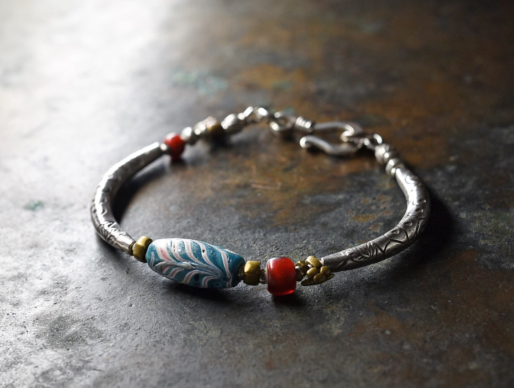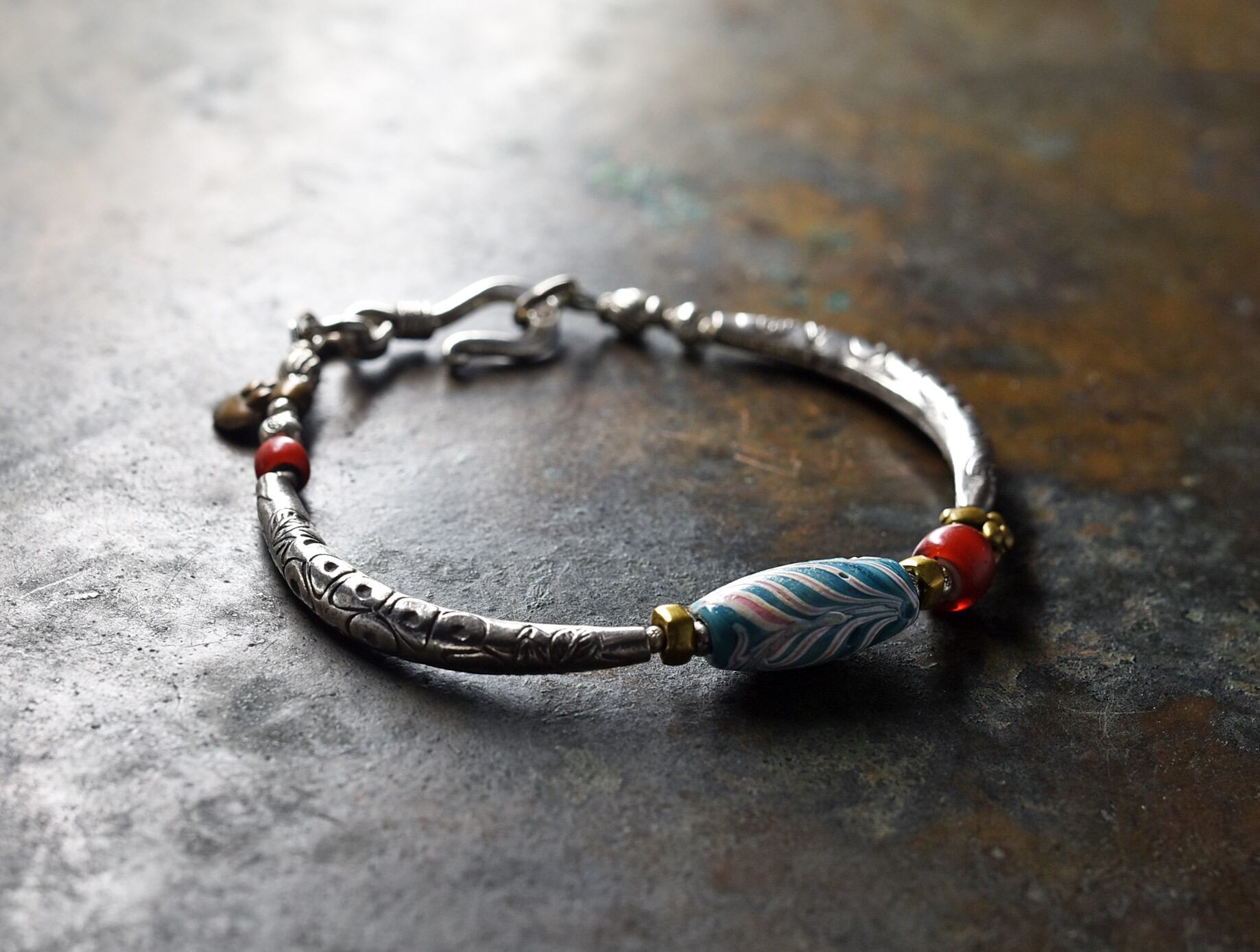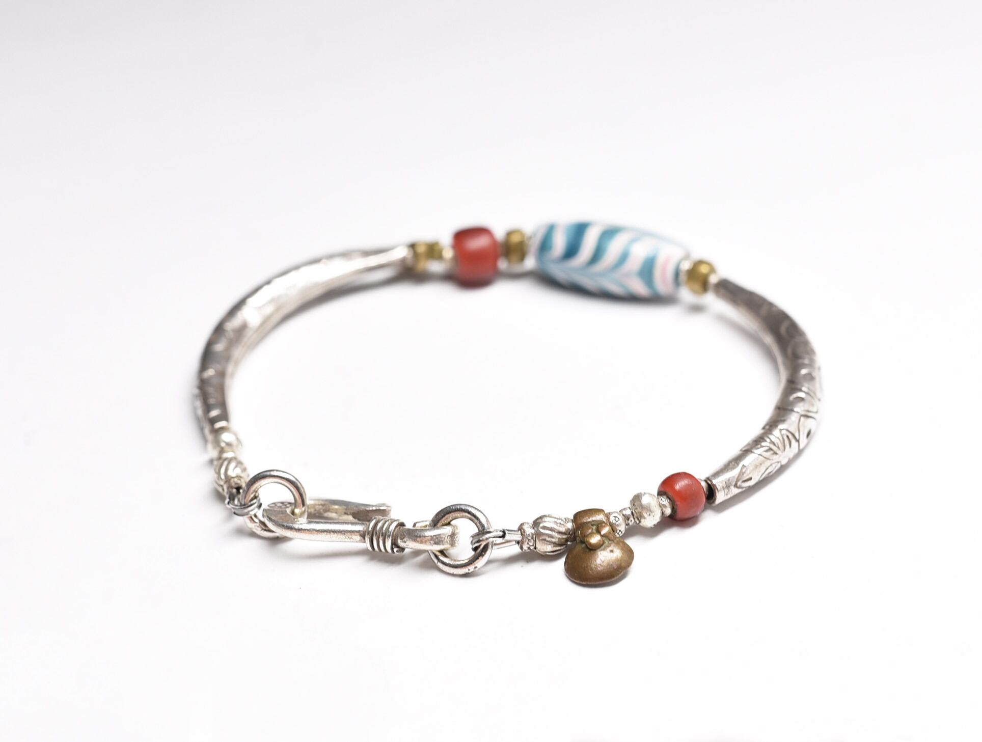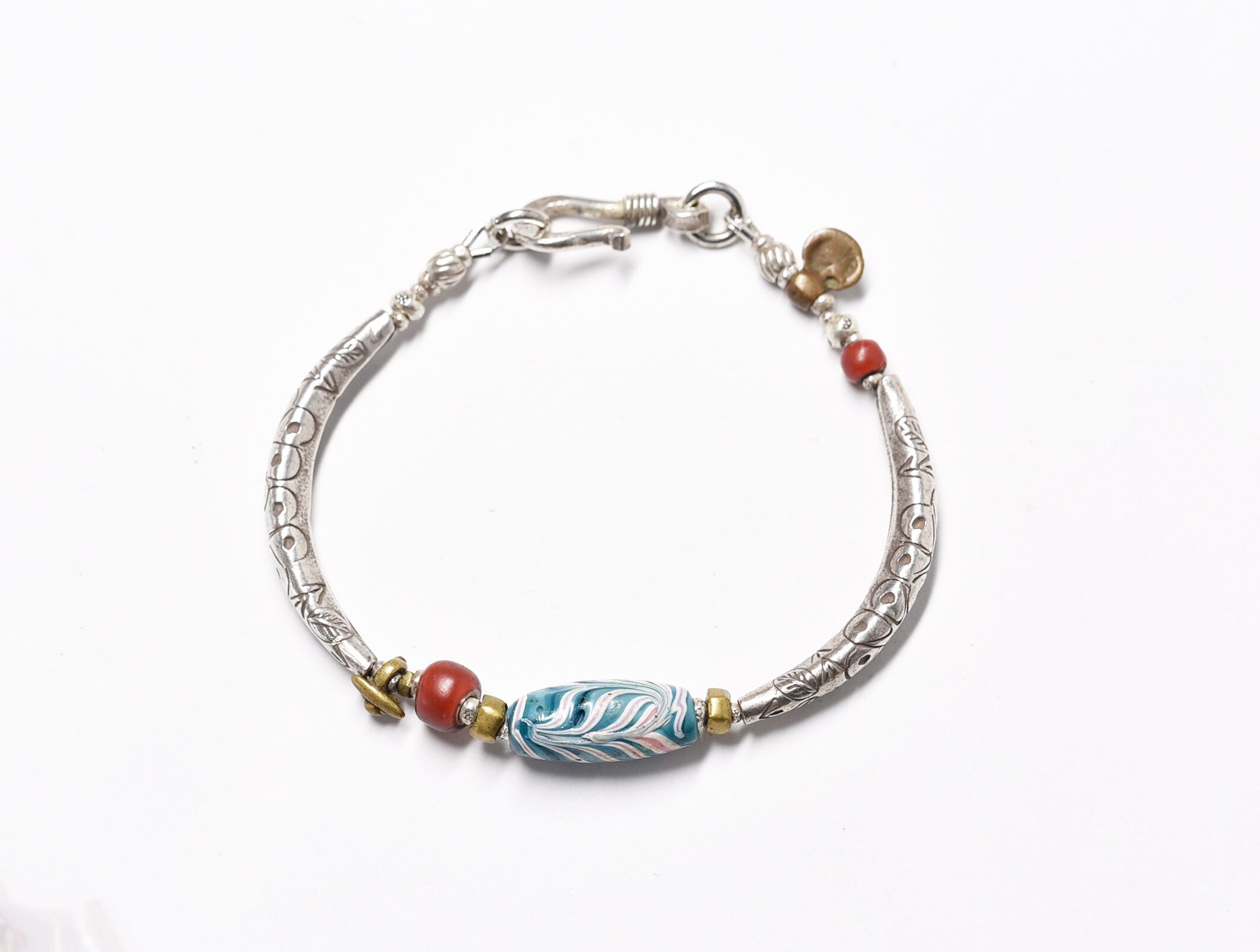 フェザービーズを中心に、金赤ホワイトハーツ、湾曲したカレンシルバー、oldオリッサブラスなどを繋いだブレスです。
