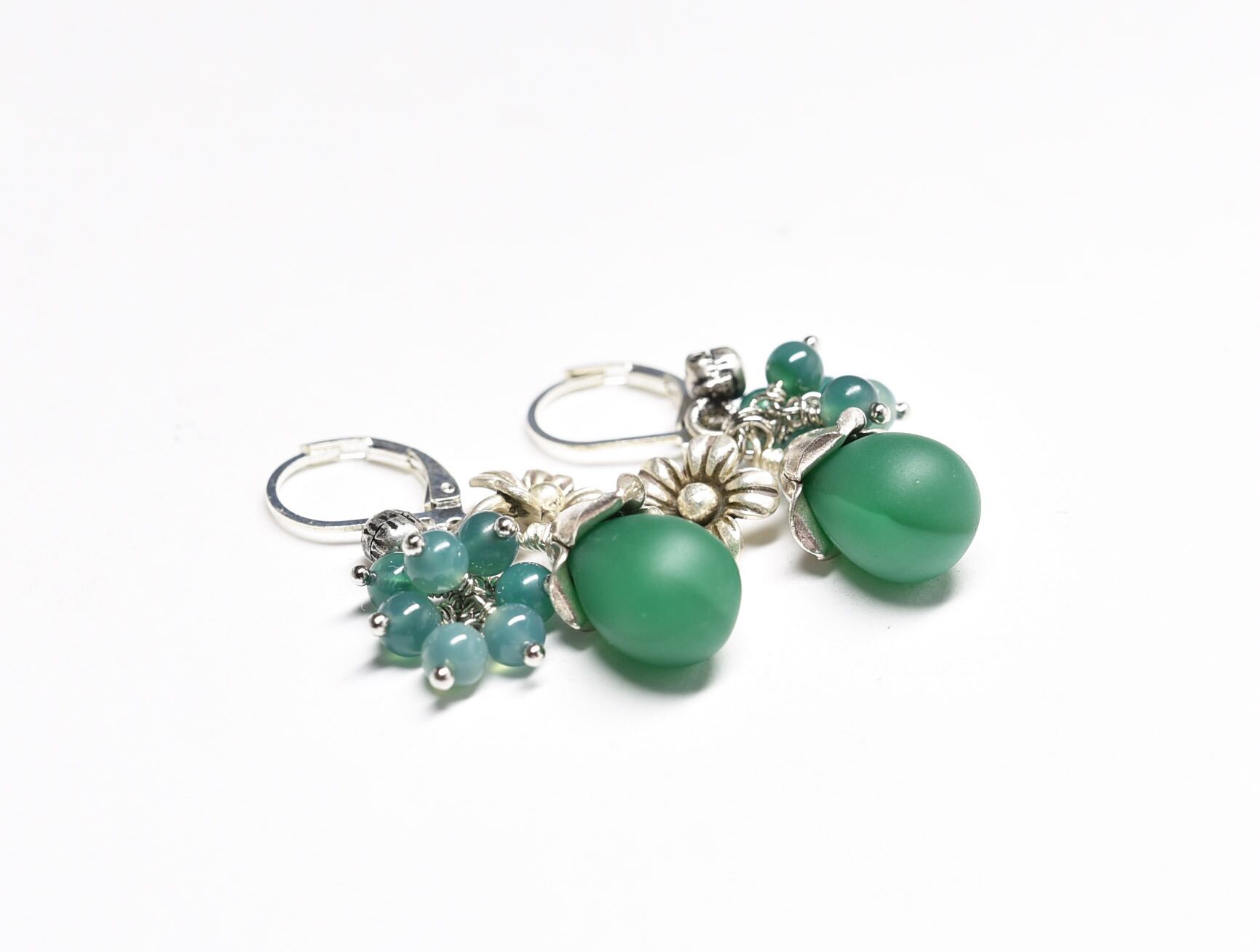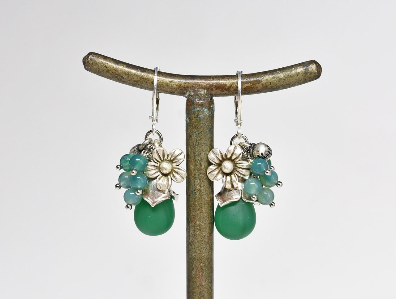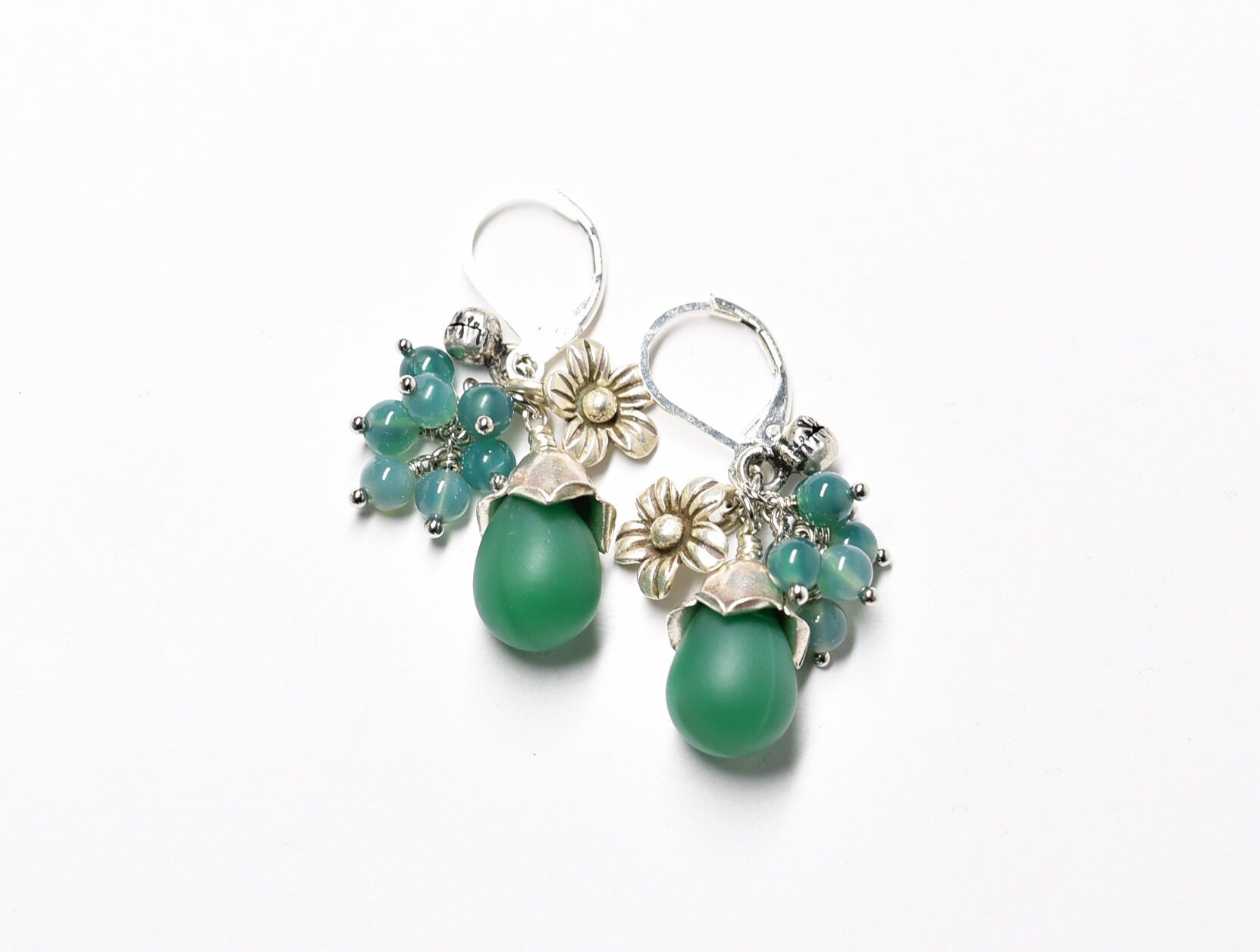 翡翠色ウエディングビーとたわわなグリーン瑪瑙、お花カレンシルバーと小さな鈴のピアス