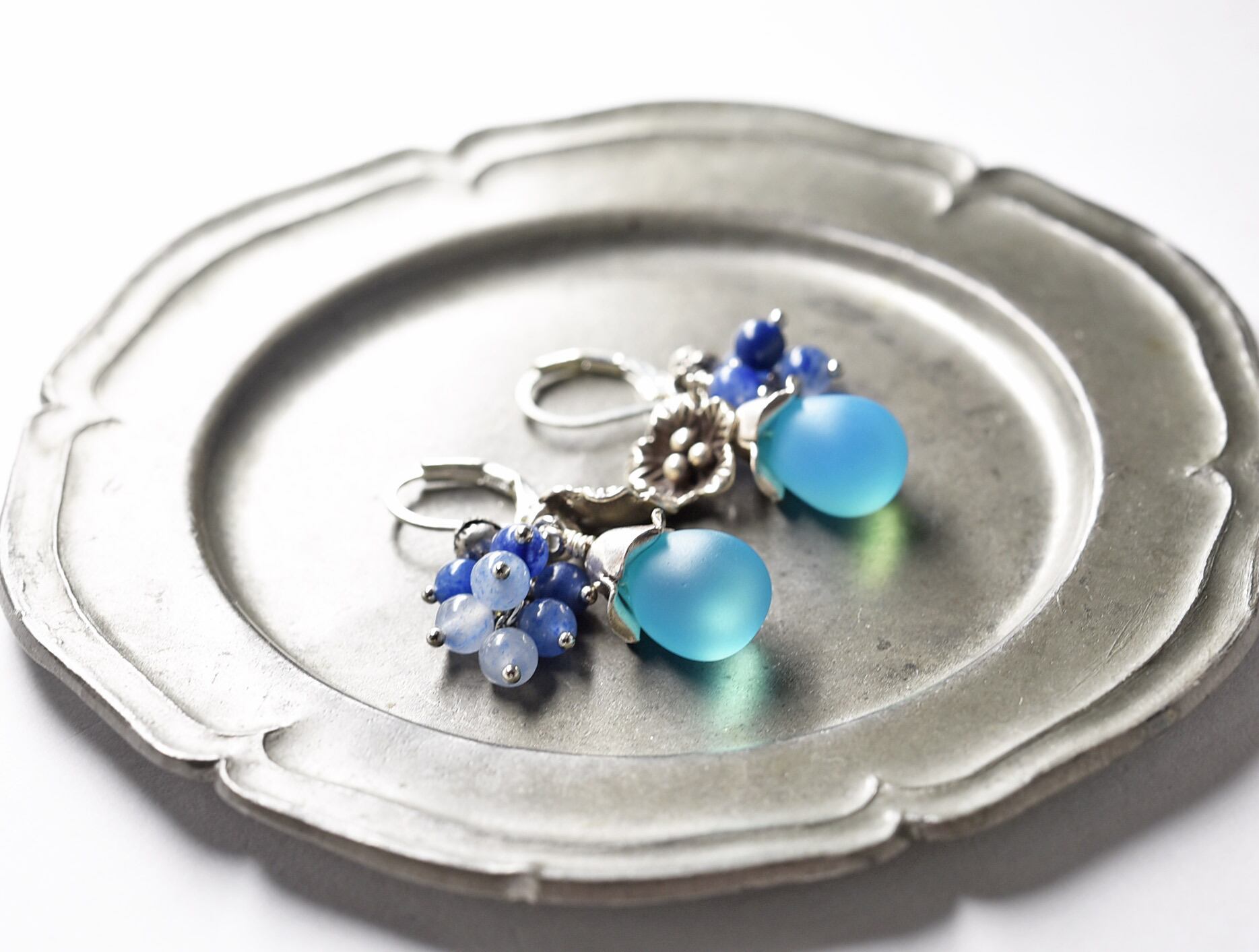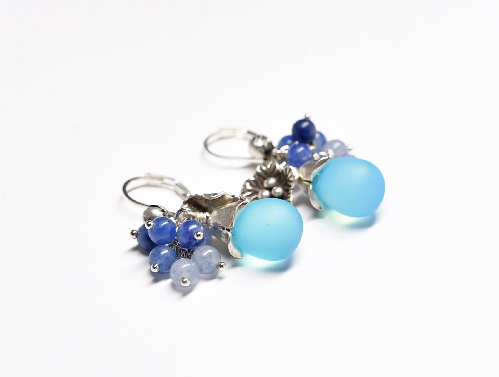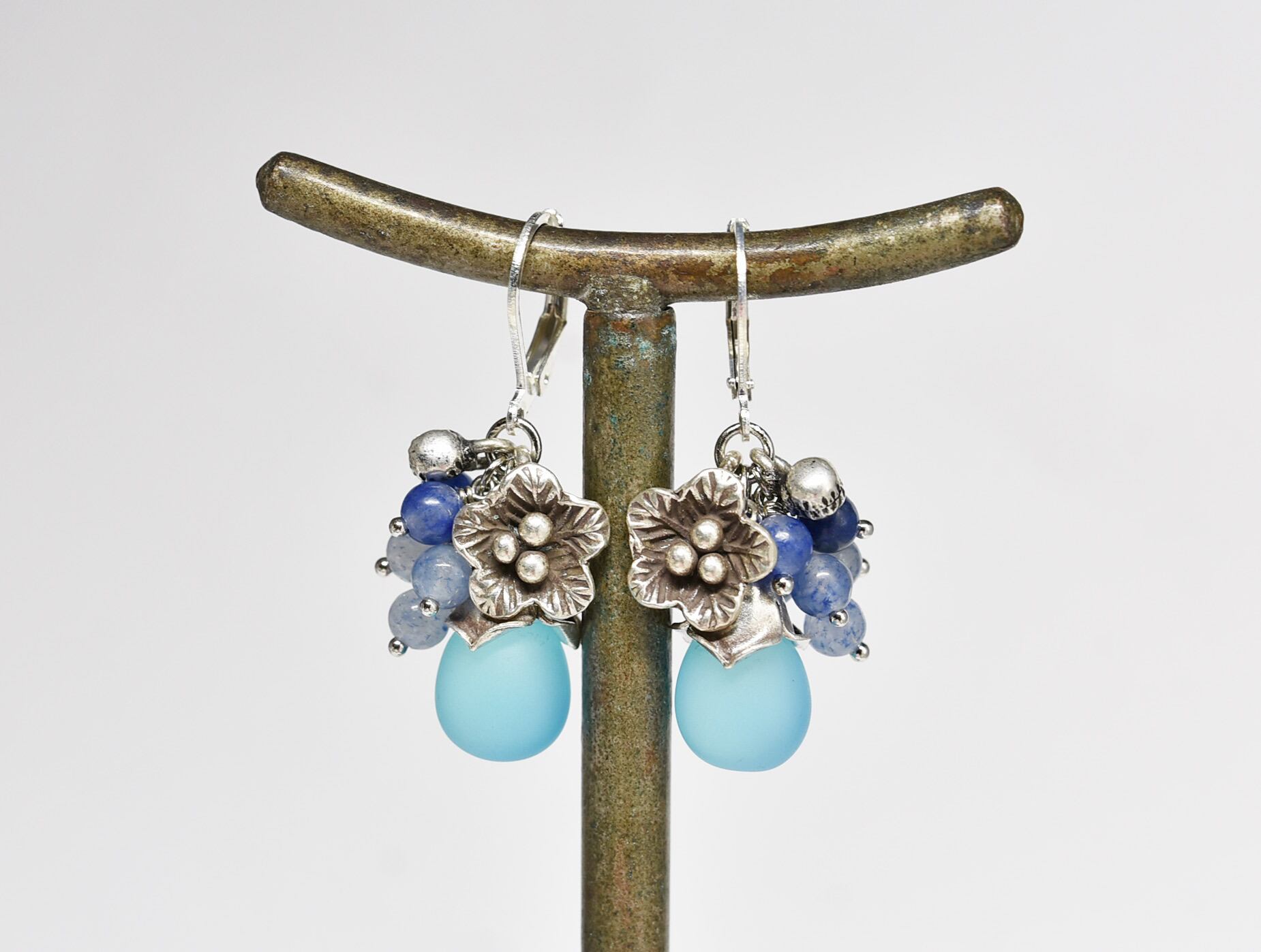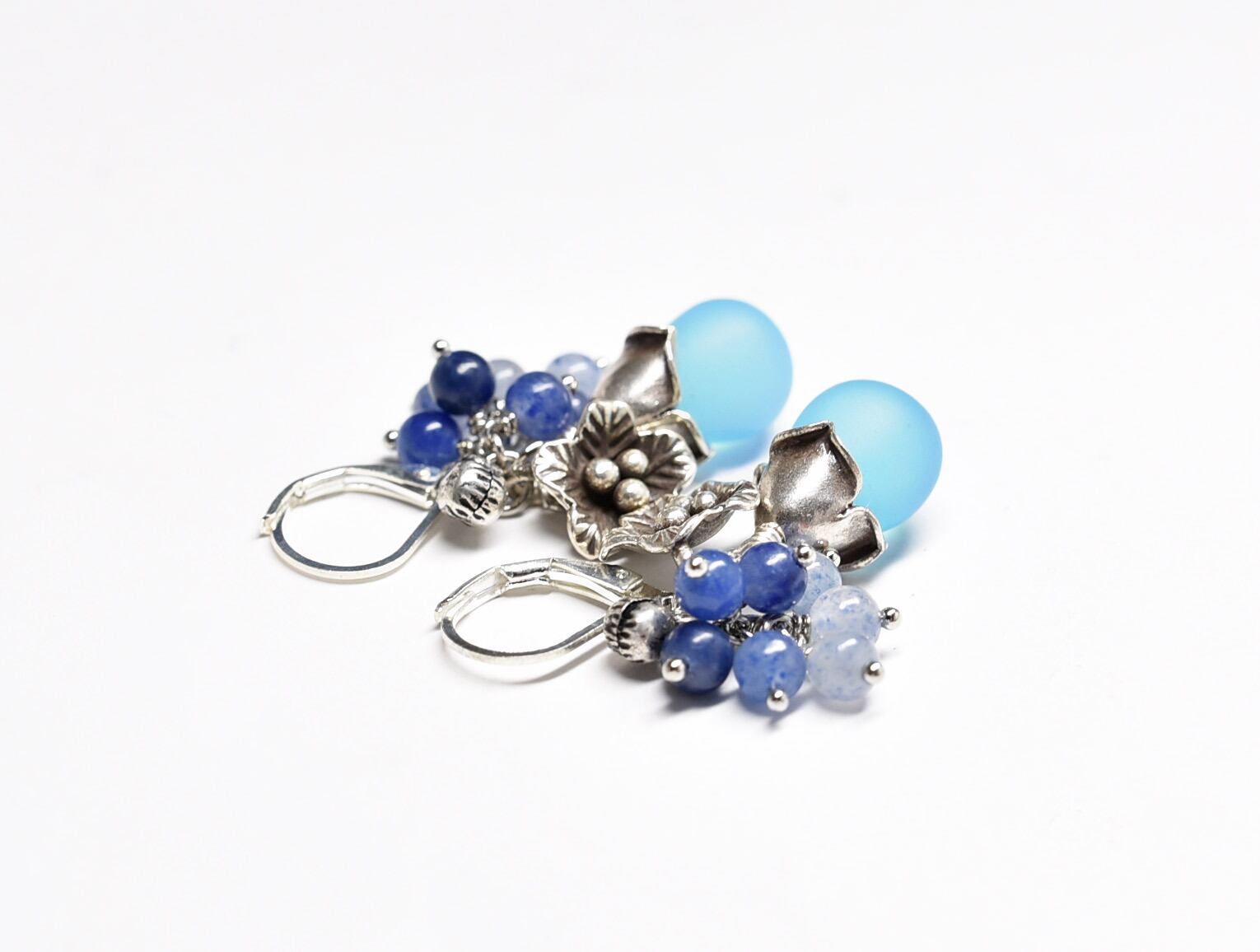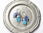 空色ウエディングビーとたわわなブルークォーツ、お花カレンシルバーと小さな鈴のピアス
