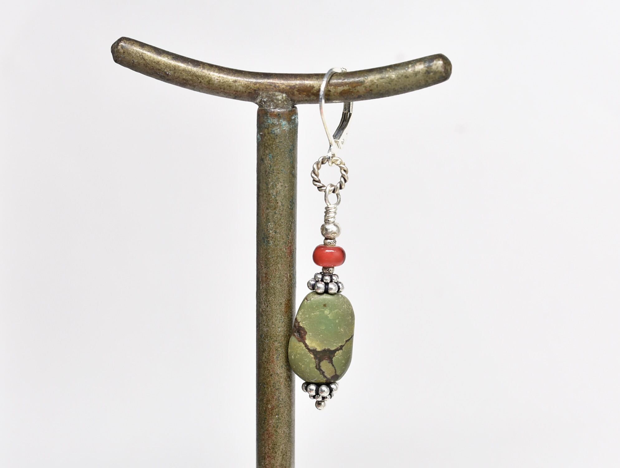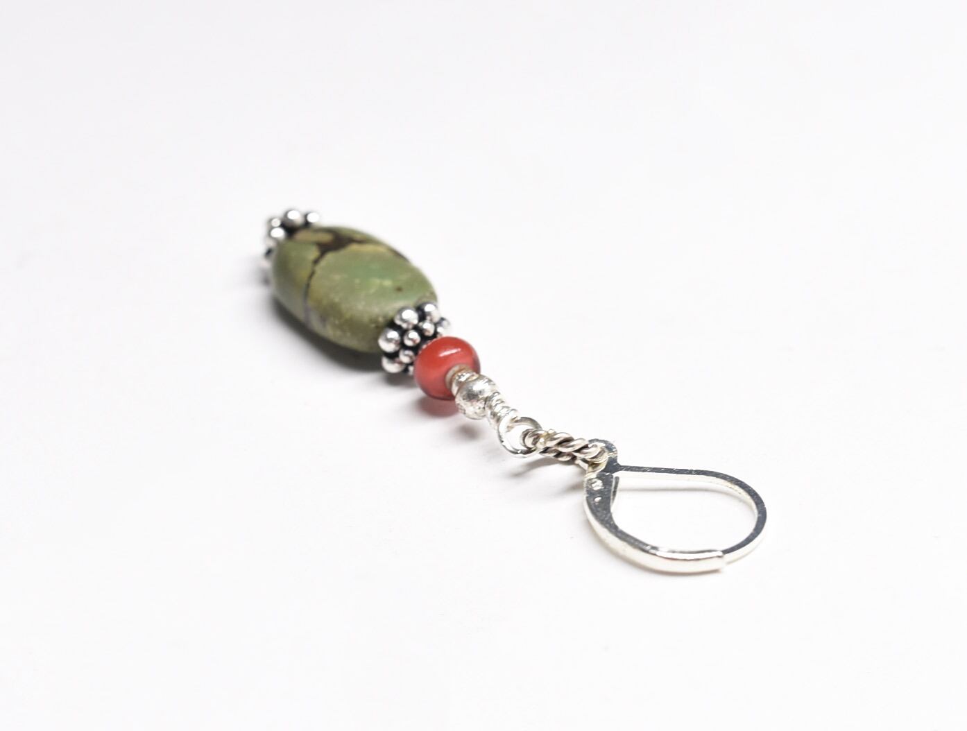 oldチベタンターコイズと、金赤ホワイトハーツ、ソルバービーズを繋いだ片耳のピアスです。