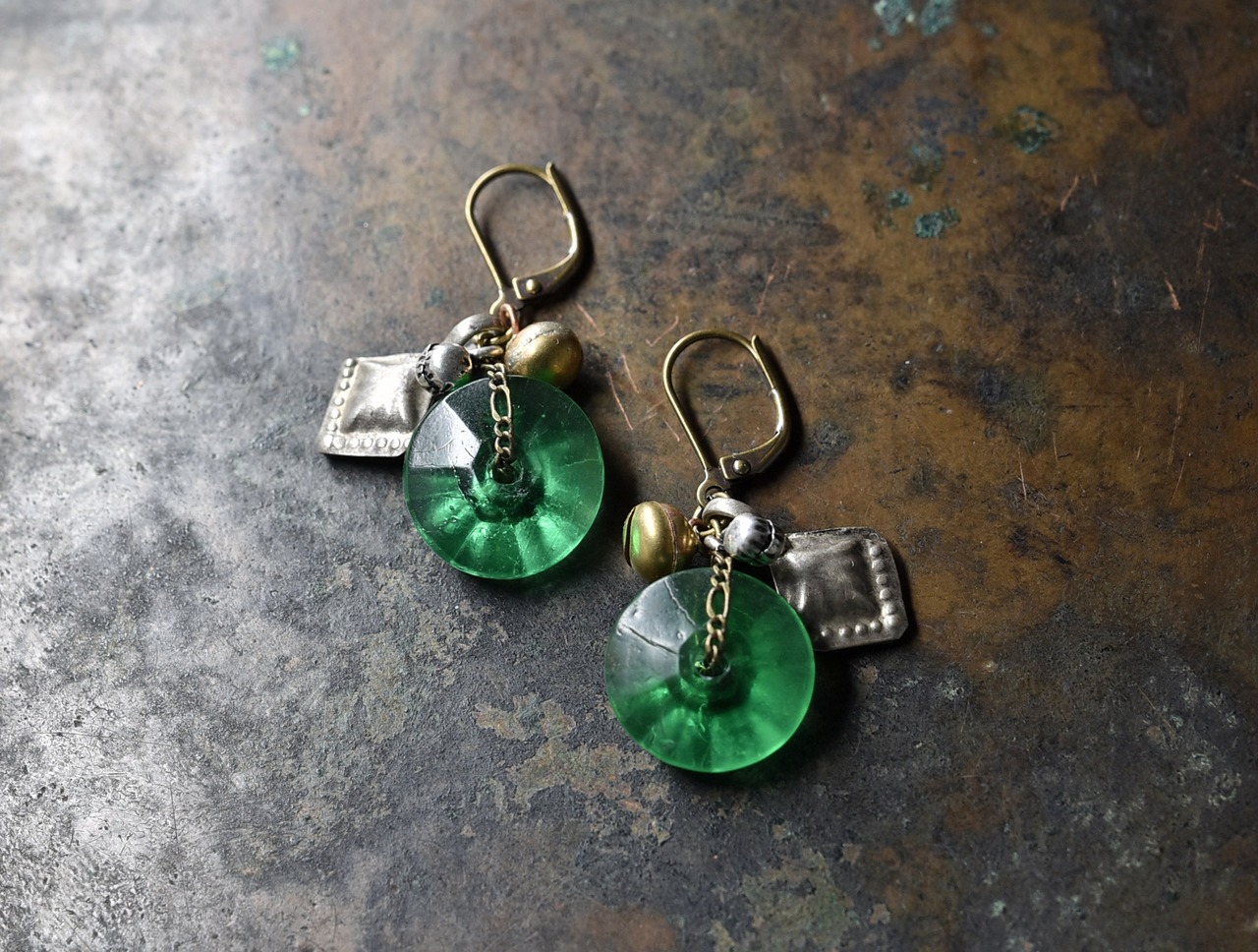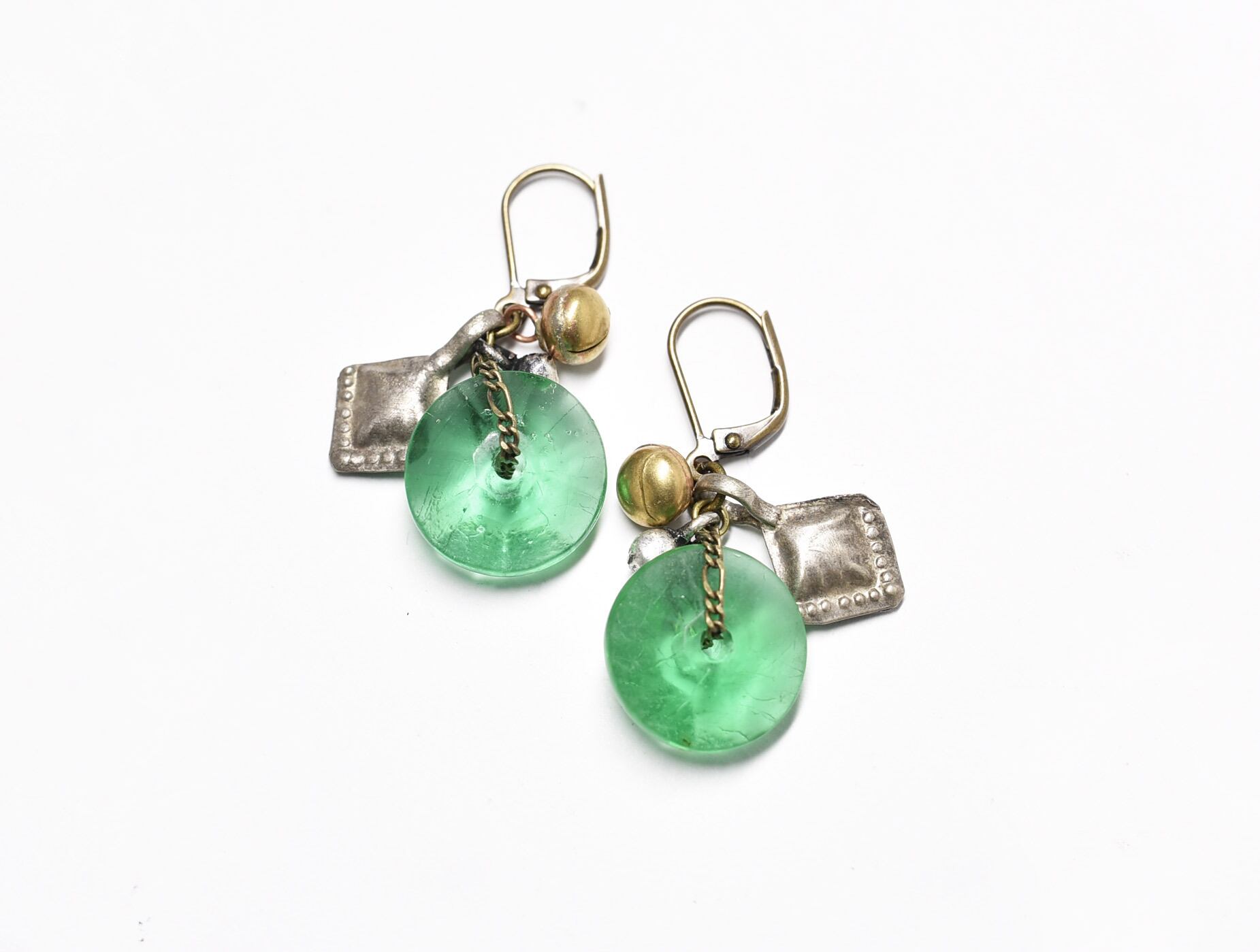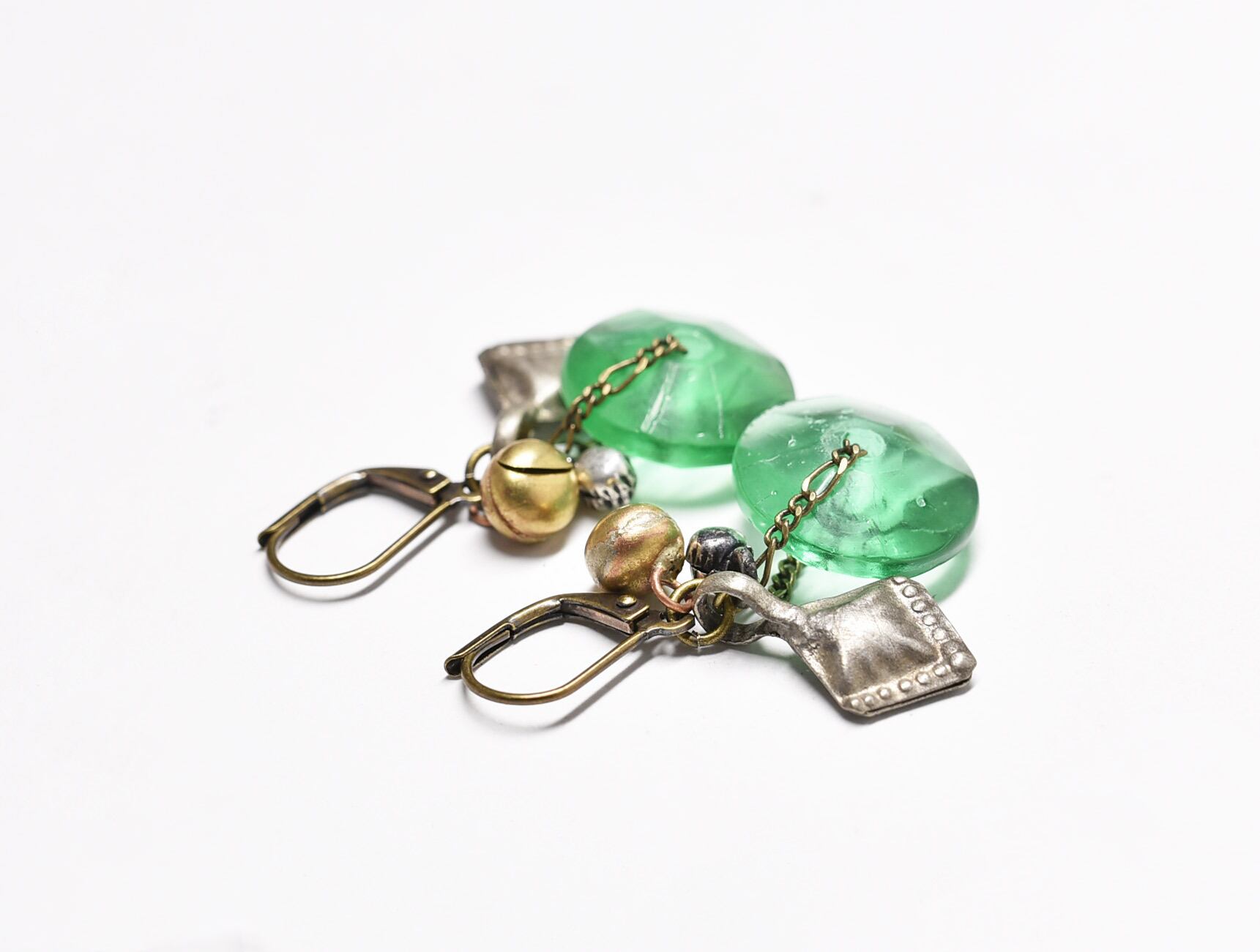 ディスク型アンティークボヘミアビーズと2種類の鈴、スペード型アフガンパーツのピアス