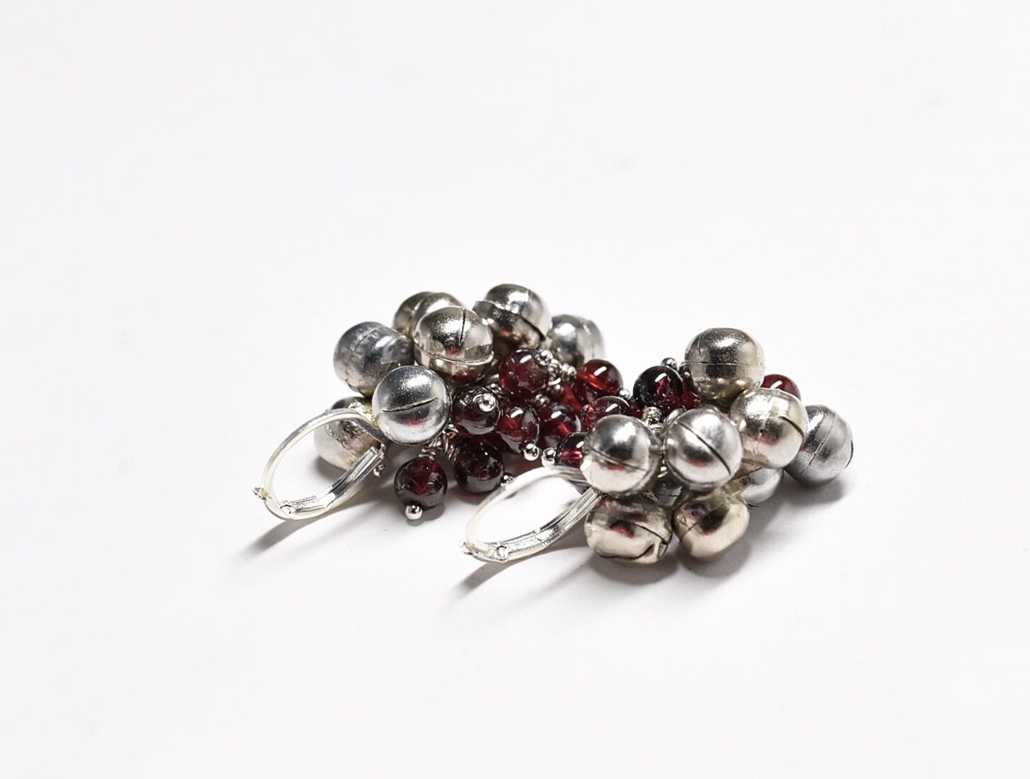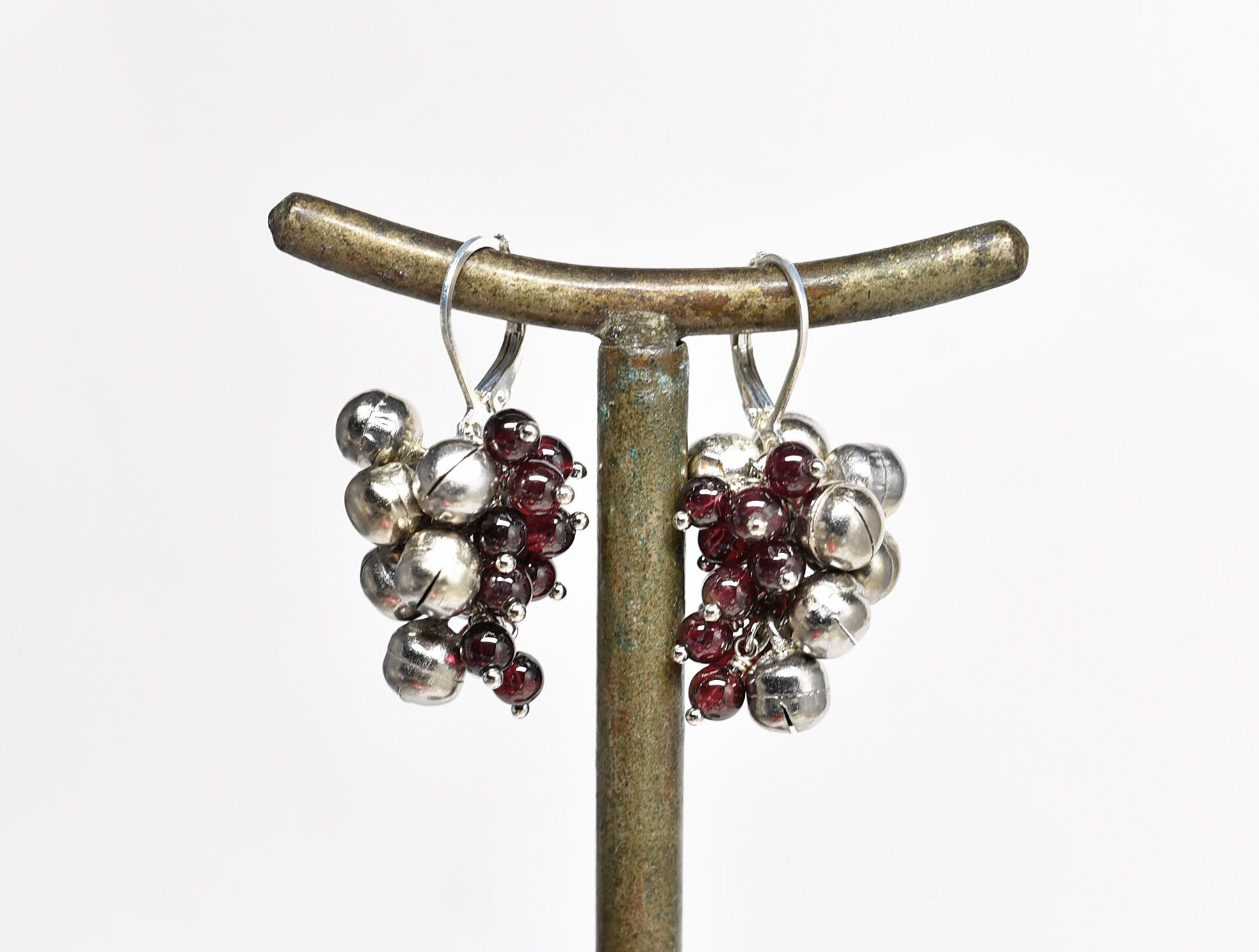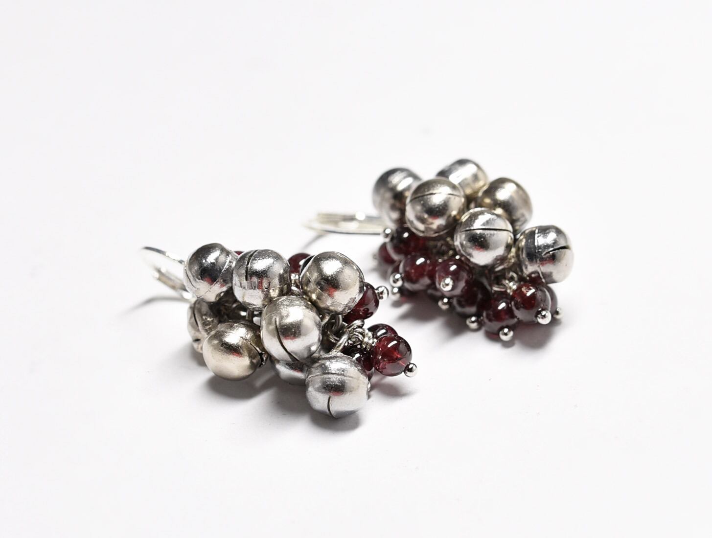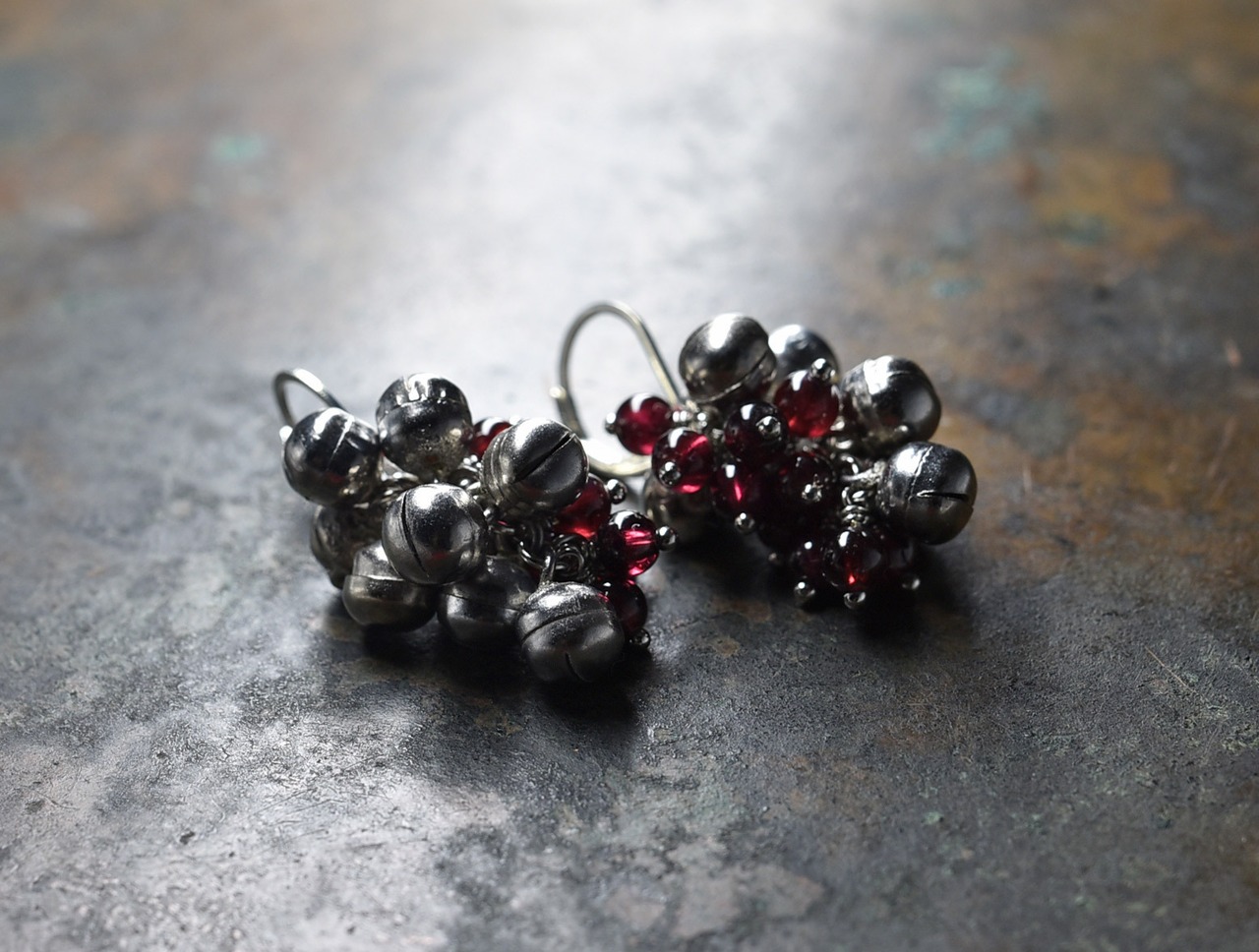 たわわな鈴とガーネットを繋いだ少しボリュームのあるピアスです。