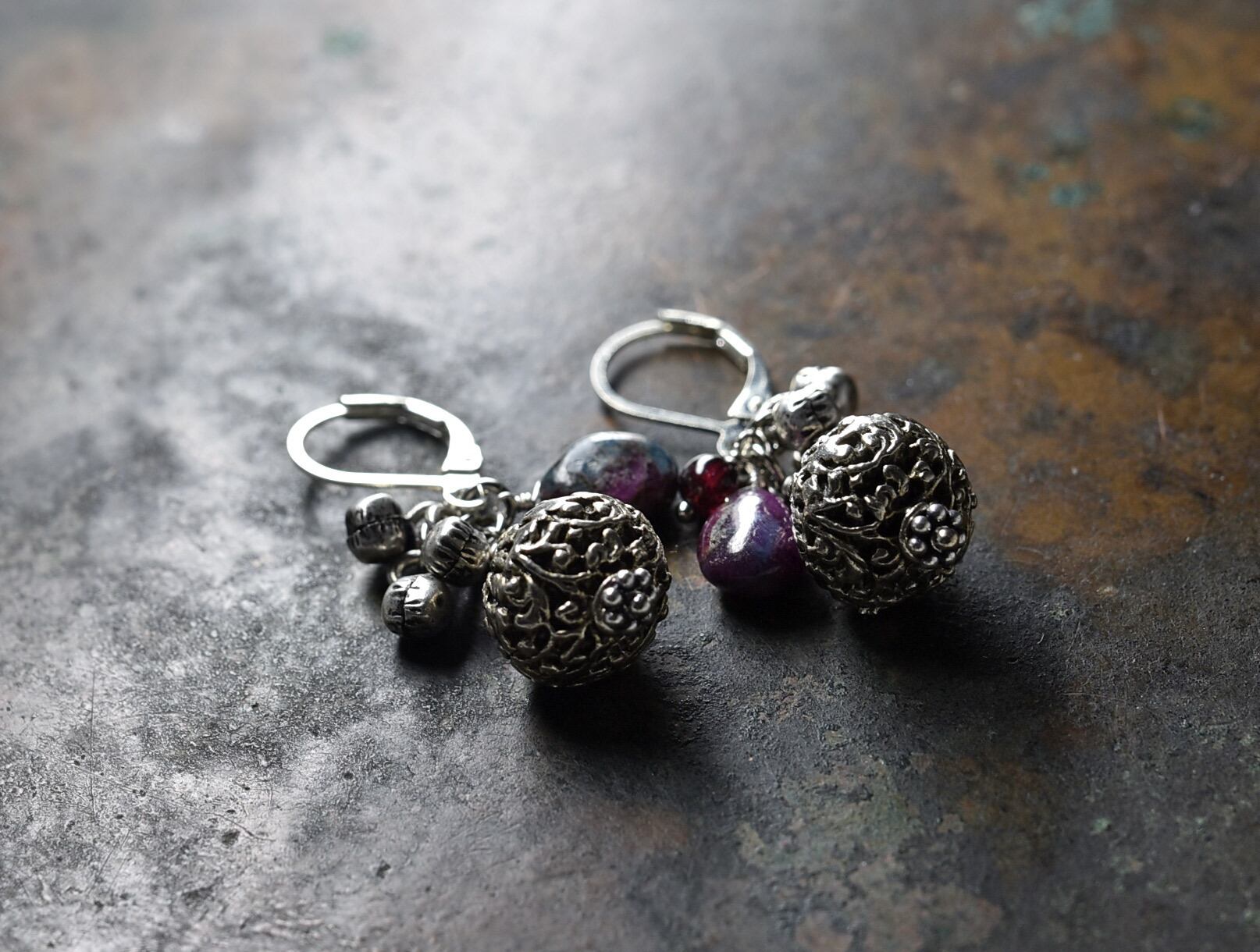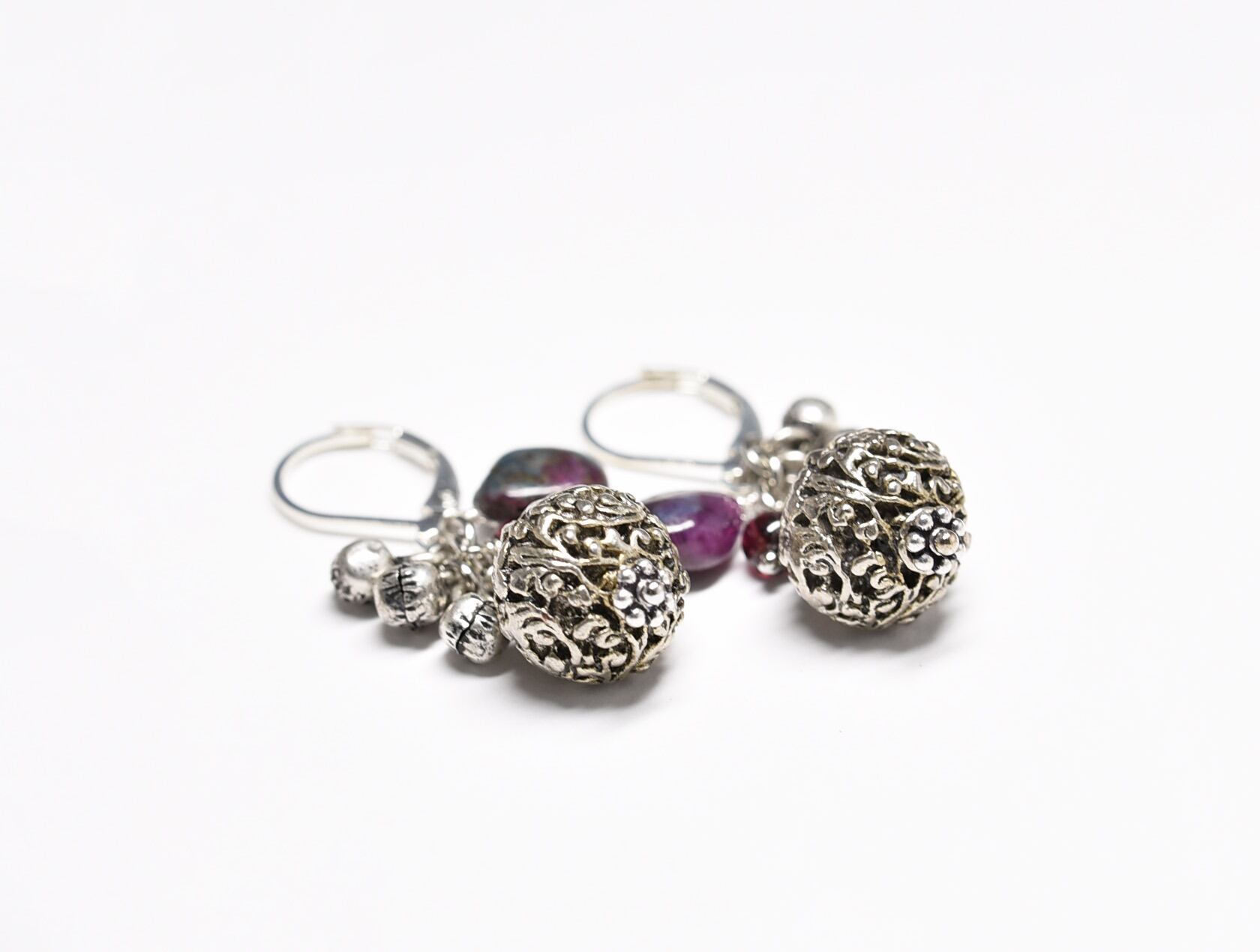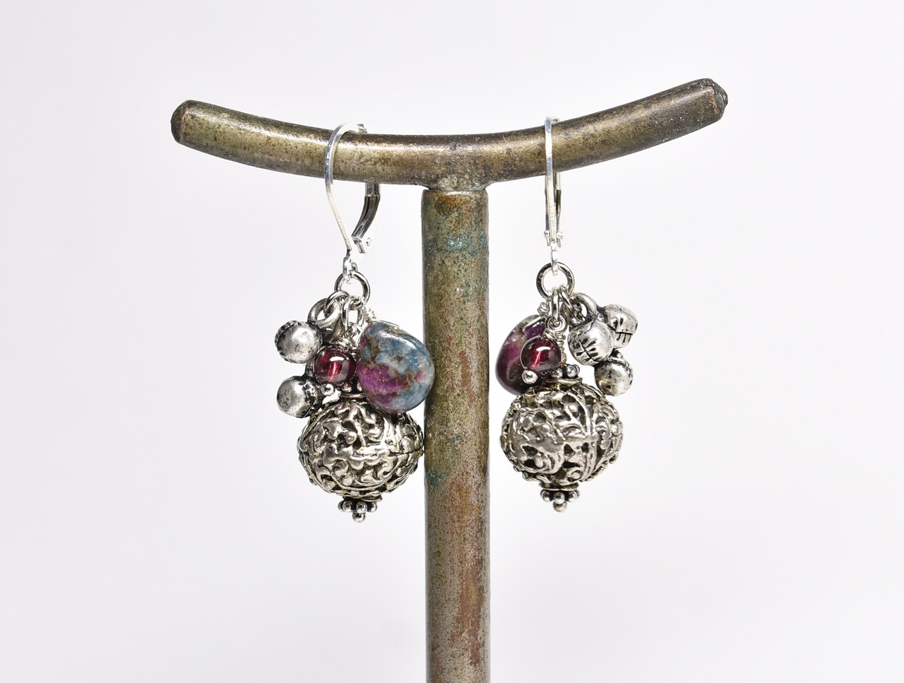 繊細細工メタルパーツとルビーインゾイサイト、ガーネット、インドシルバー鈴のピアス