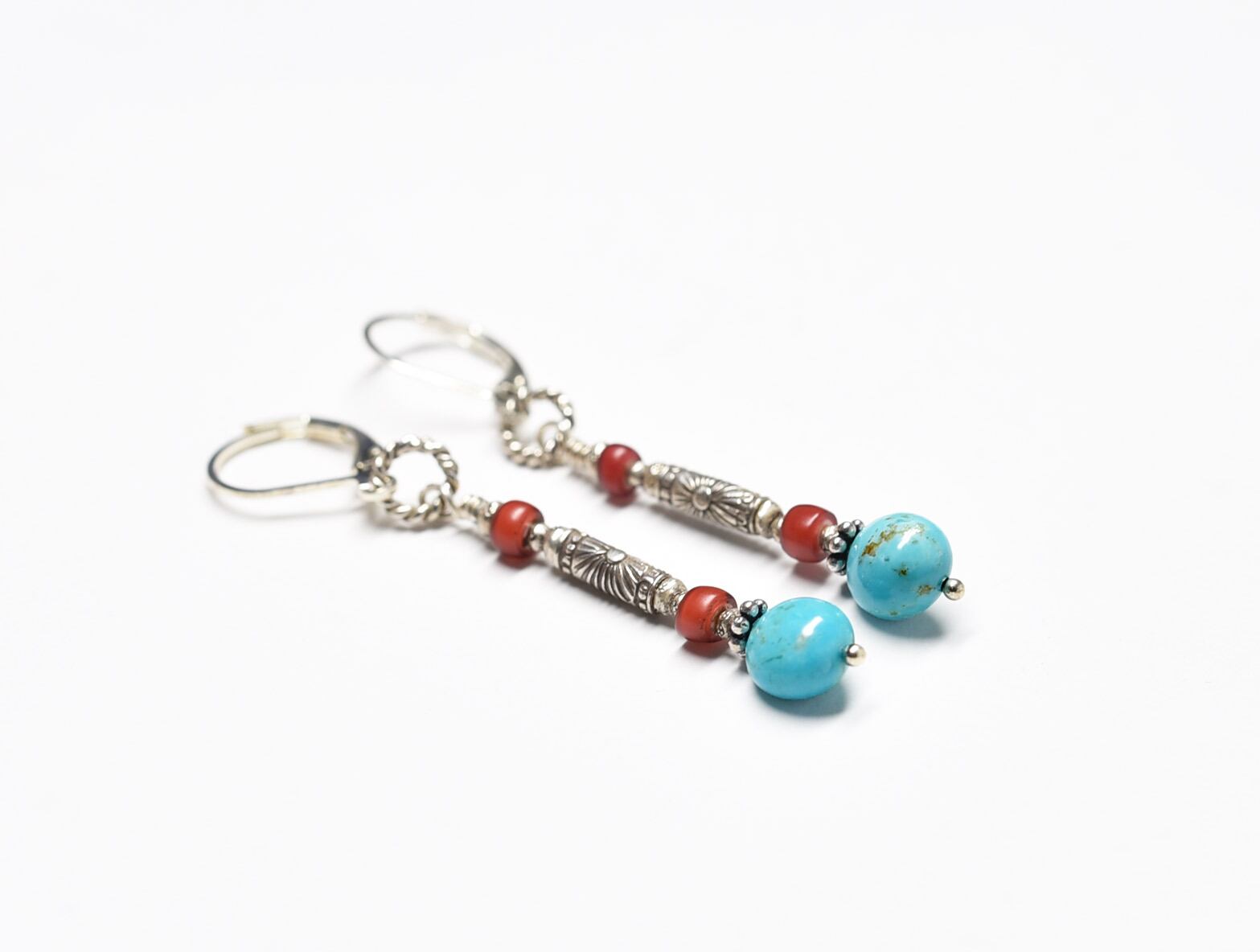 キングマンターコイズと、金赤ホワイトハーツをカレンシルバーのリングへ繋いだピアスです。