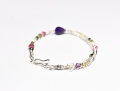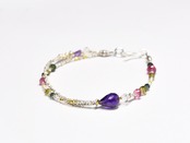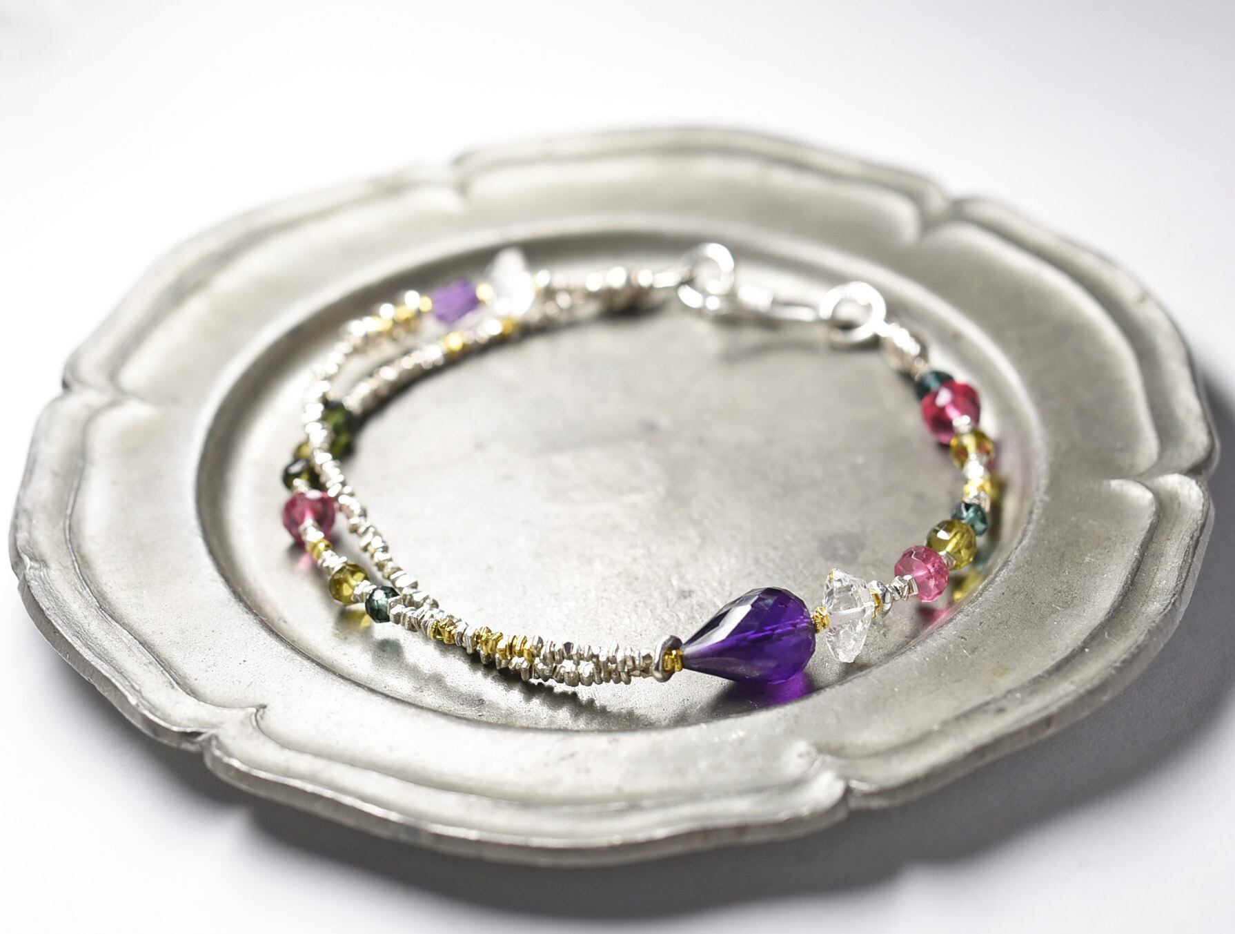 アメジスト、ハーキマーダイヤモンドとトルマリン、カレンシルバーを繋いだ華奢なブレスです。