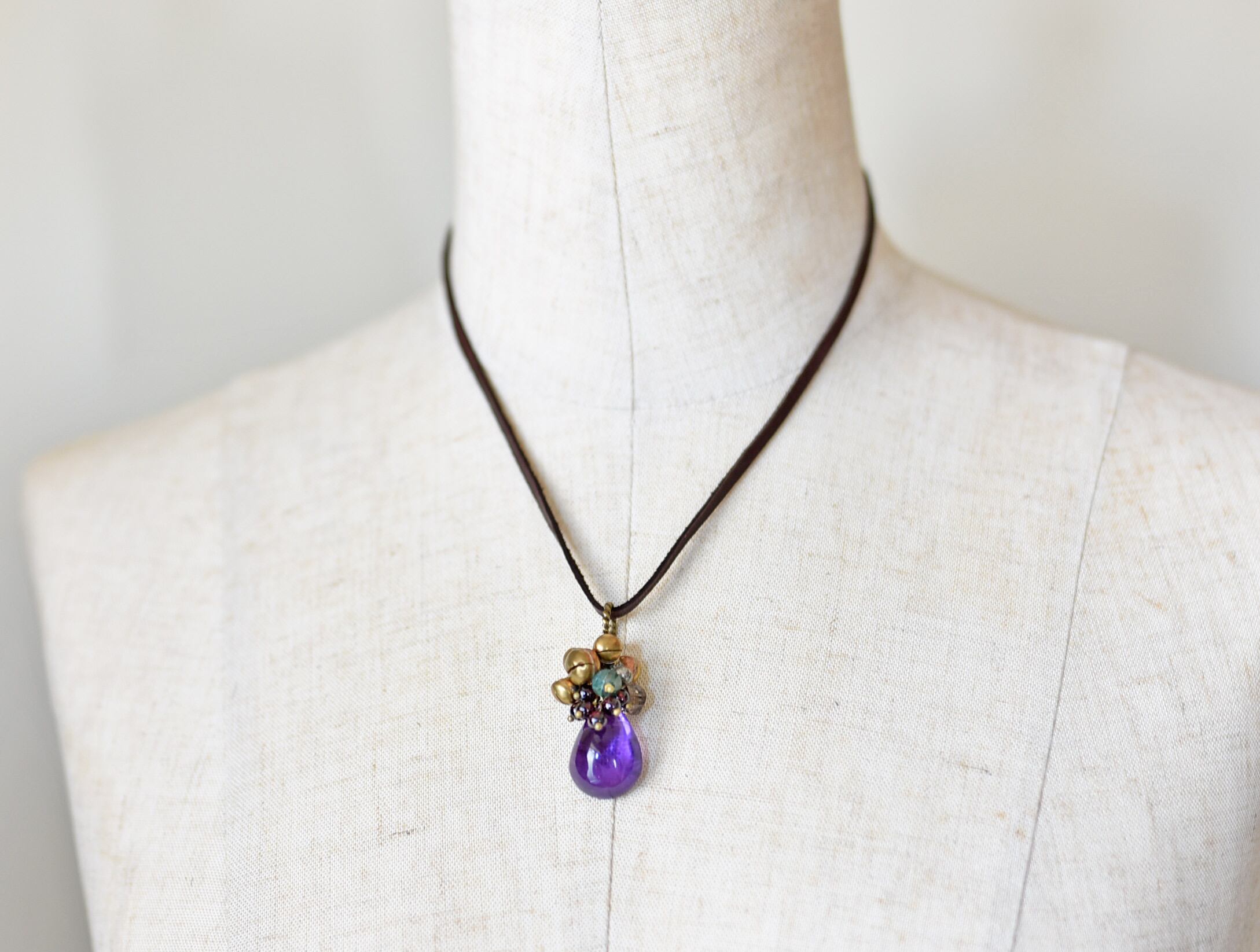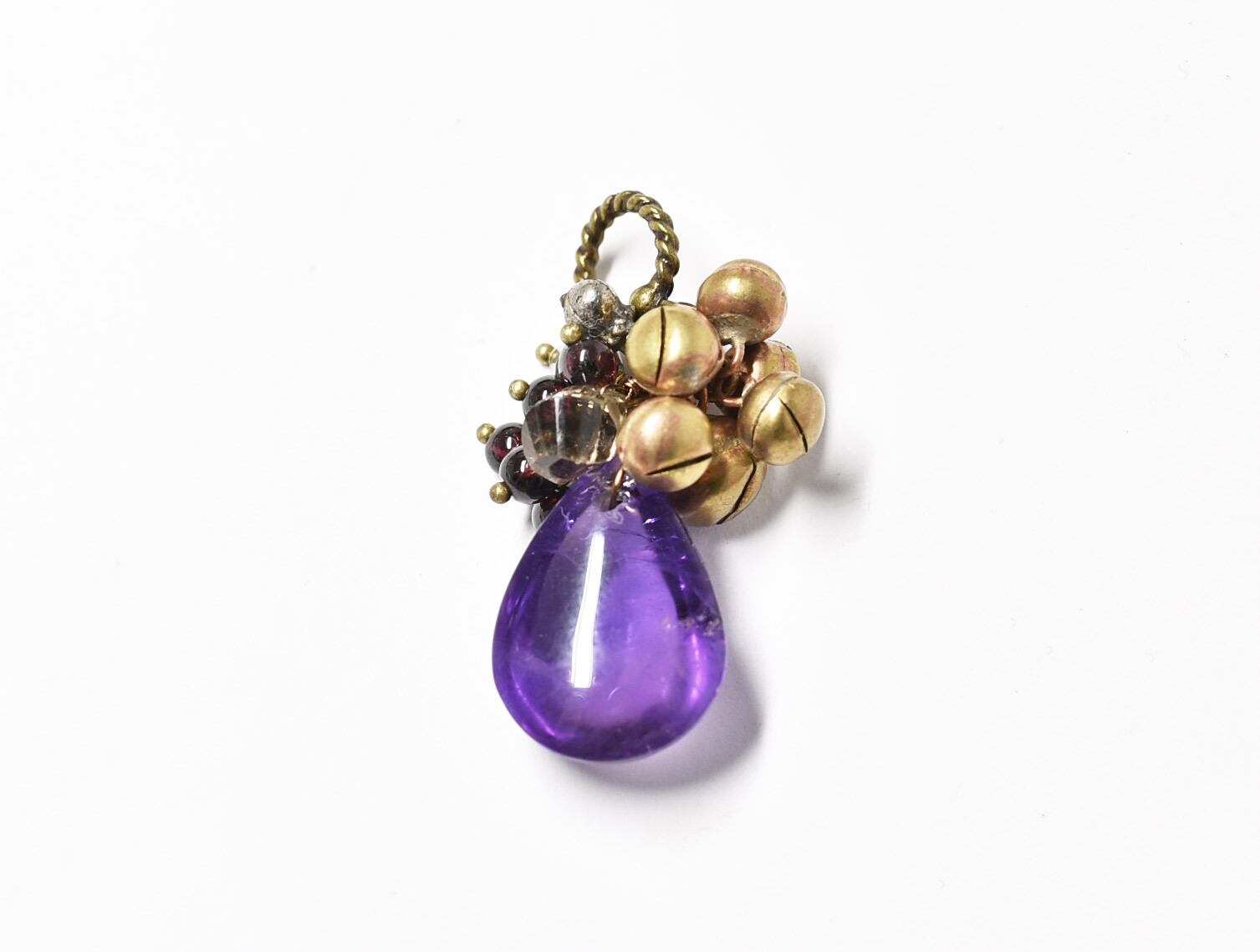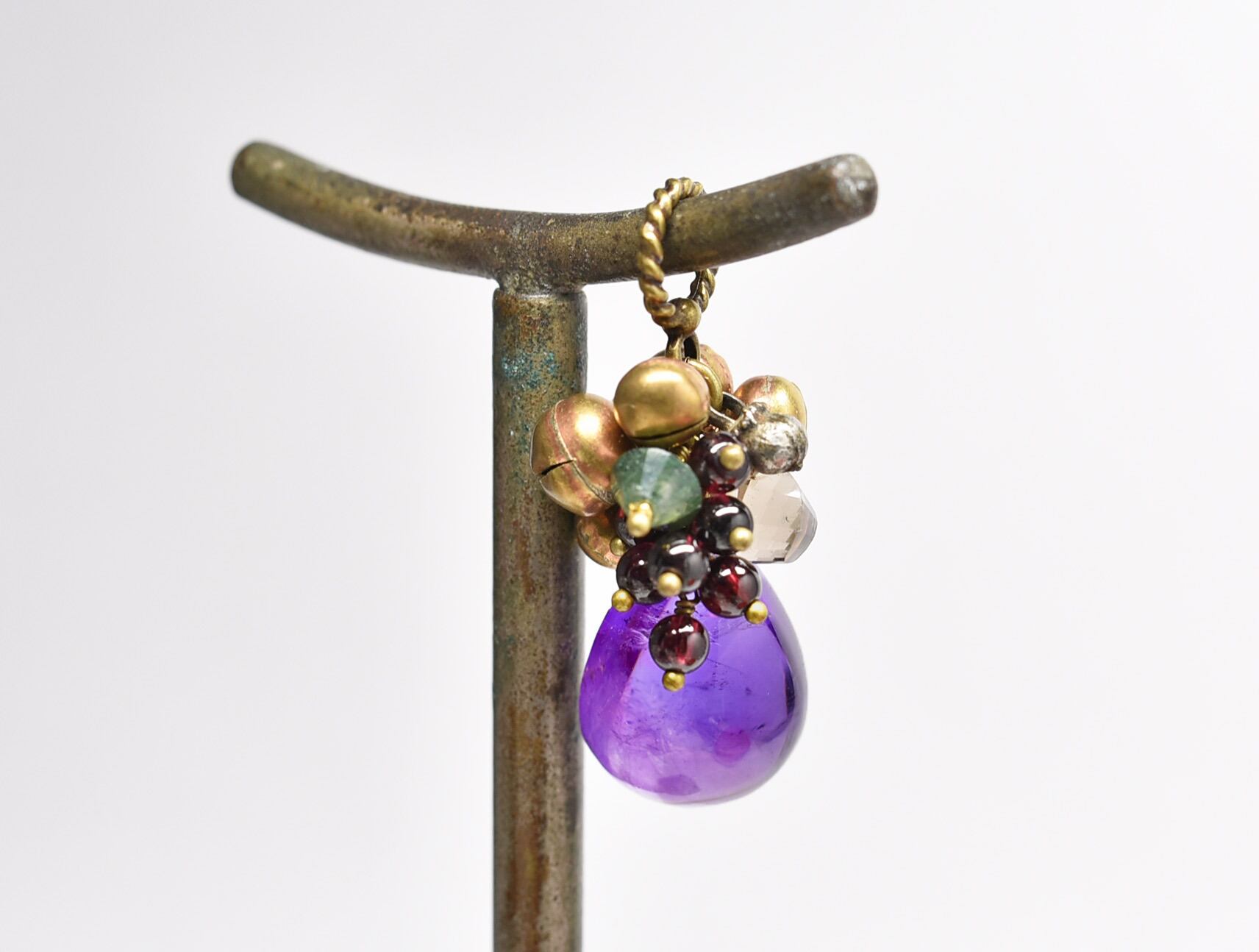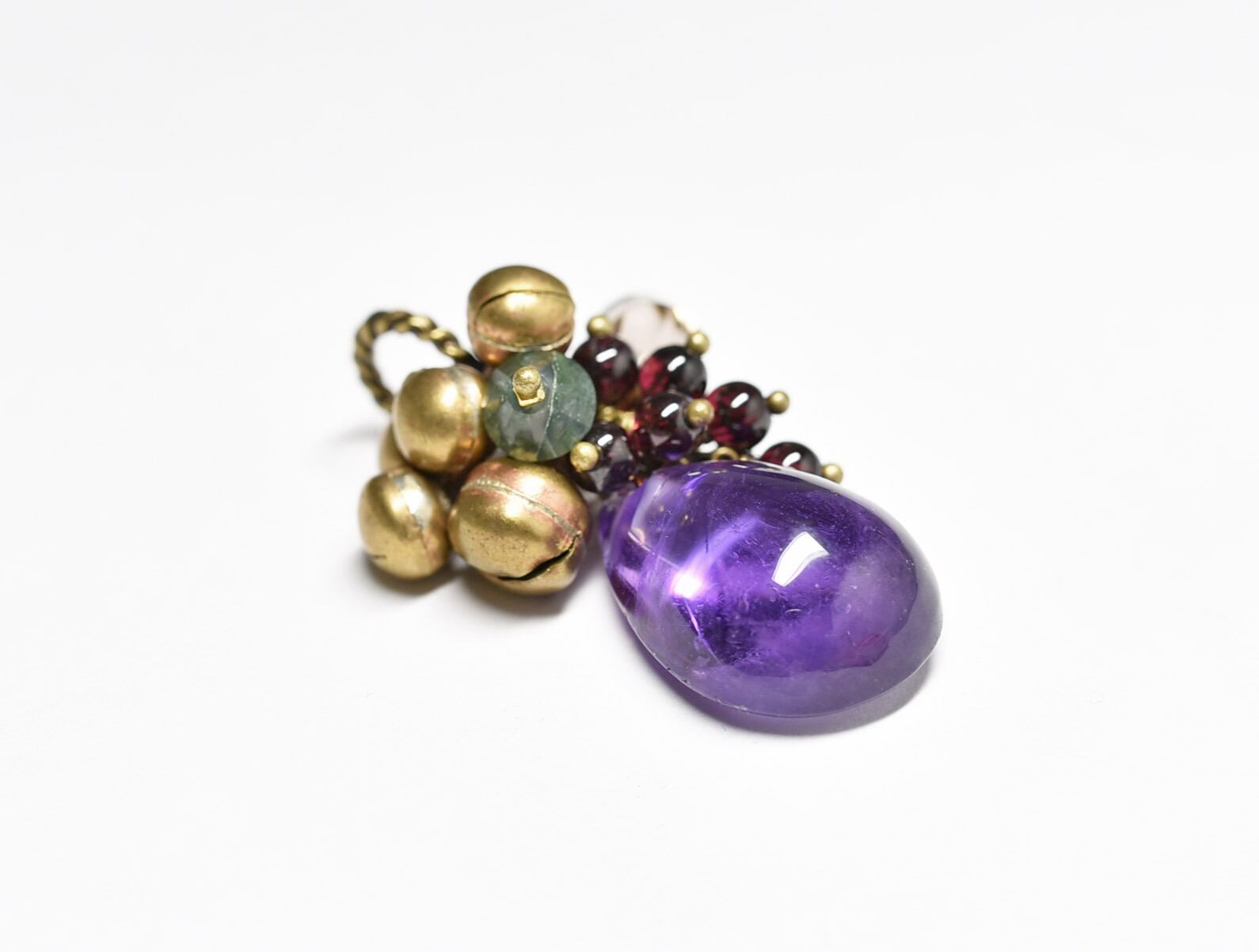 ぽってりとしたアメジストとたわわな鈴とガーネット、スモーキークォーツなどを繋いだペンダントトップです。